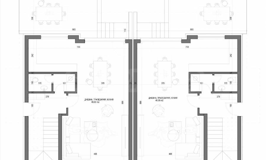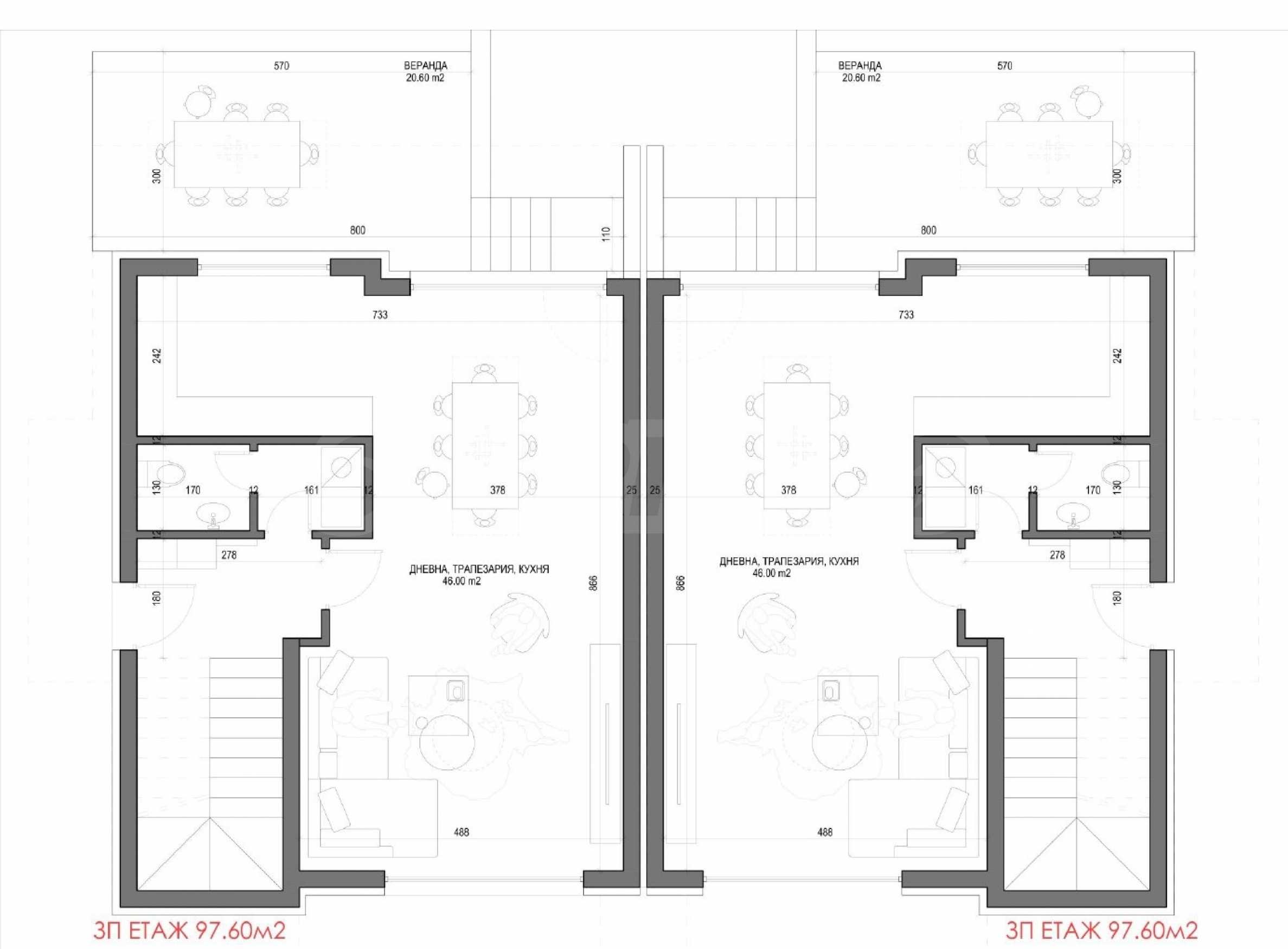 - първи етаж - антре/коридор, просторна дневна с кухня, санитарно помещение, веранда;