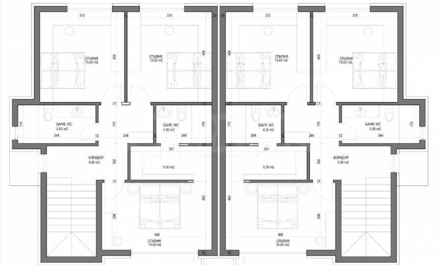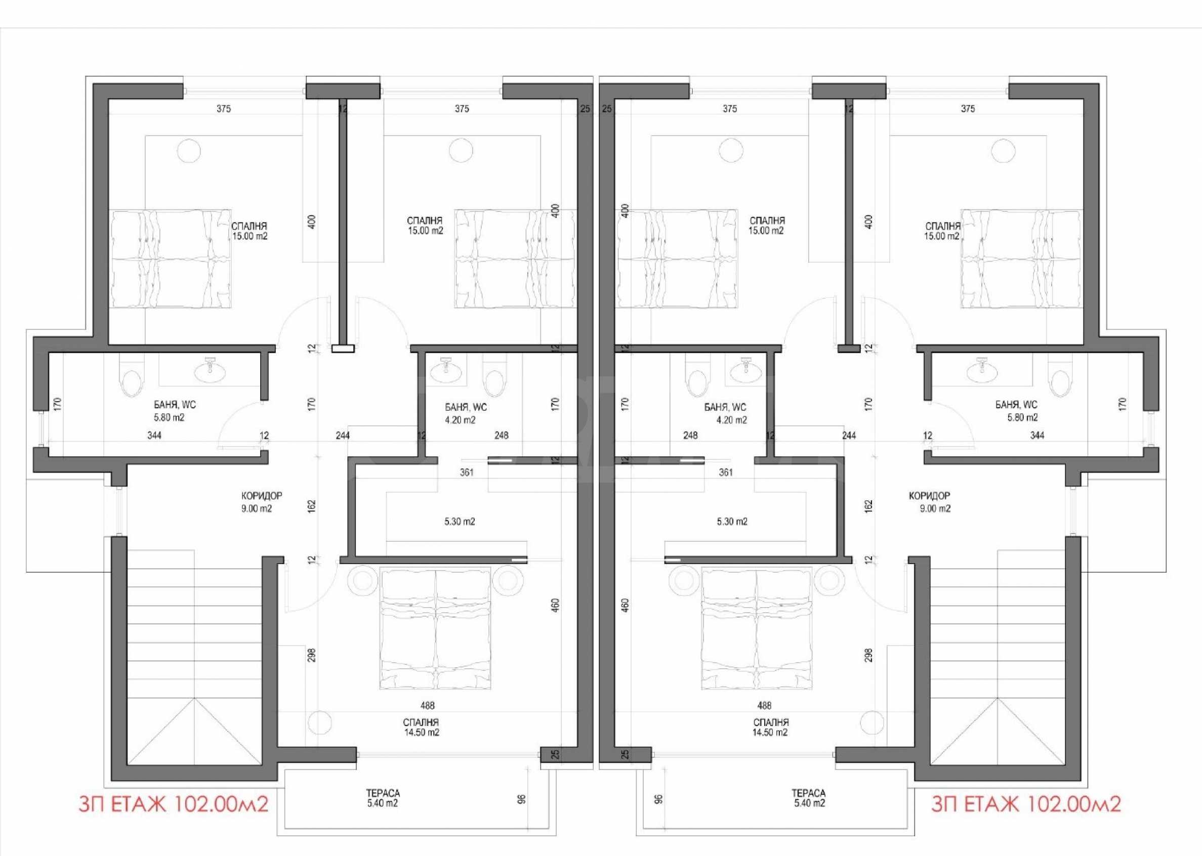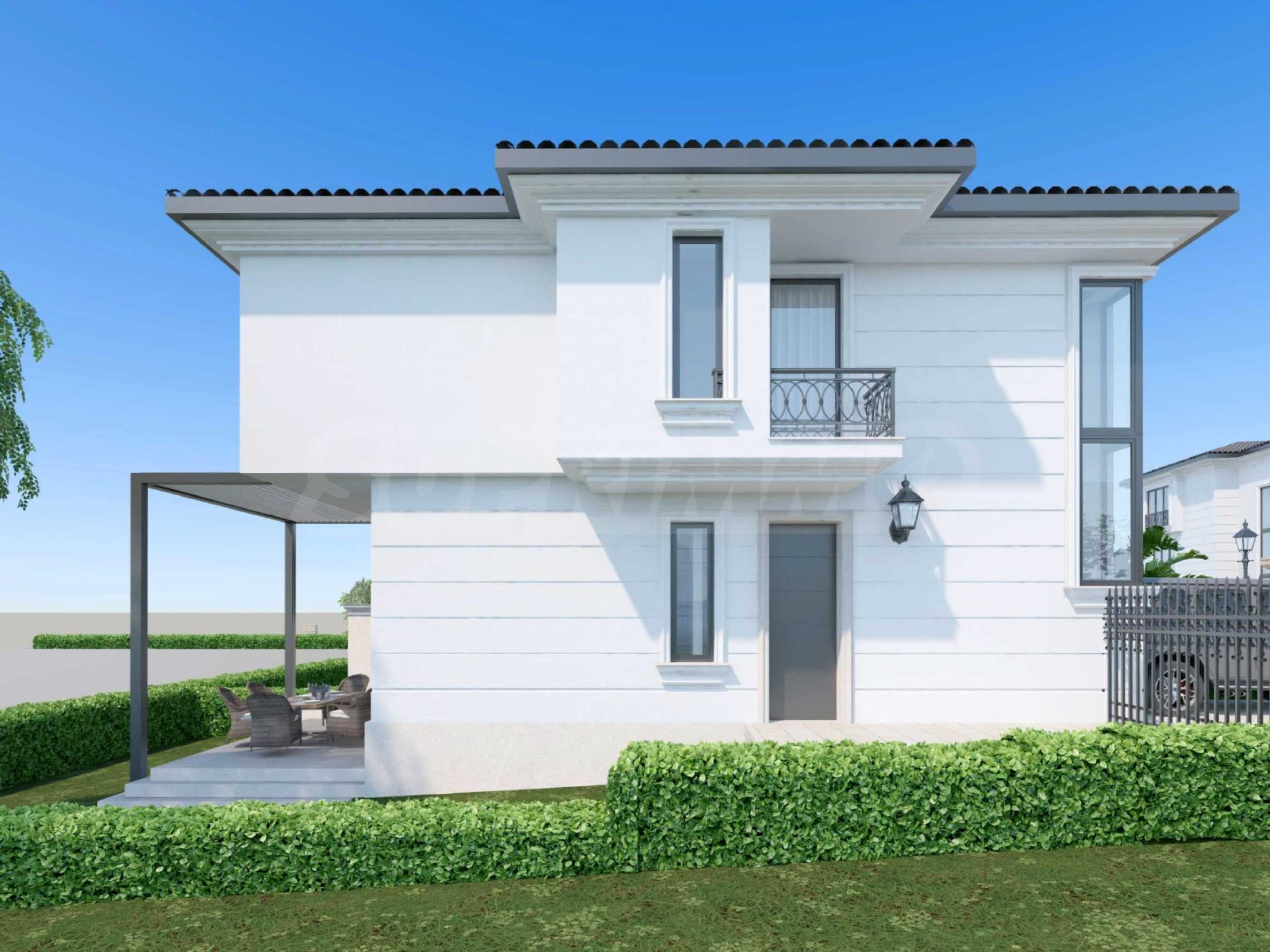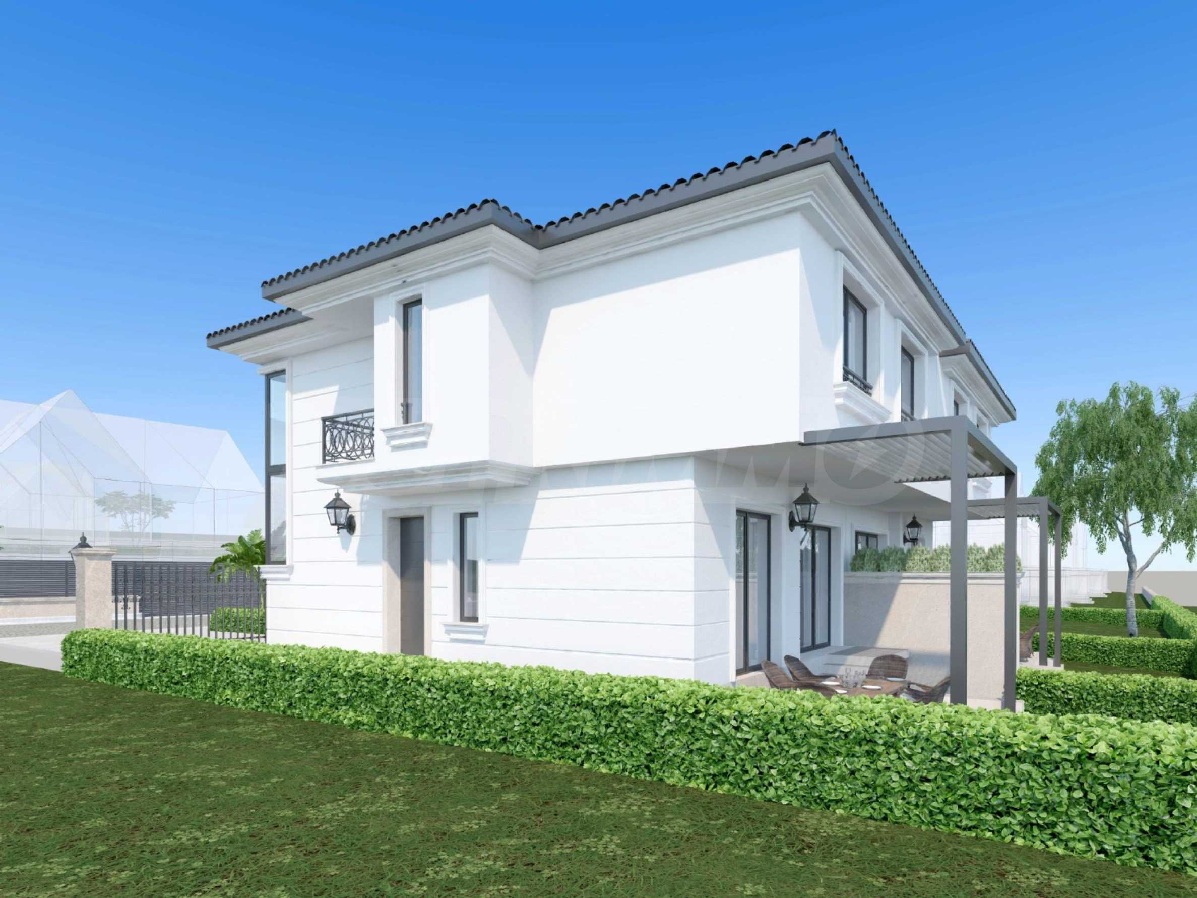 - втори етаж - три спални, две бани с тоалетна, дрешник, тераса.