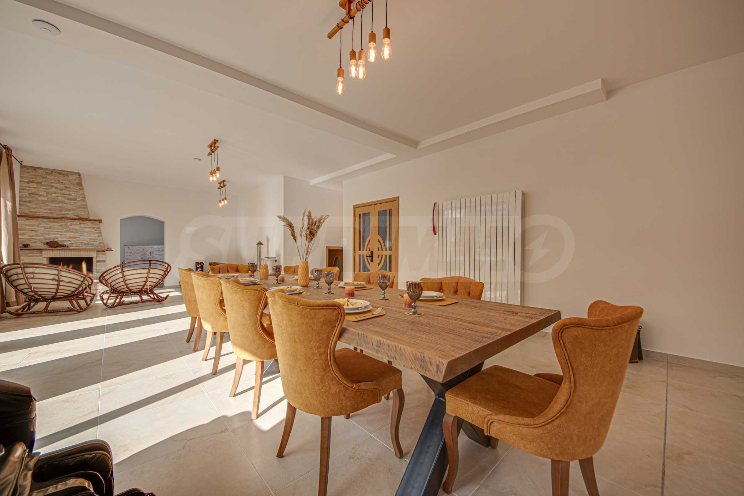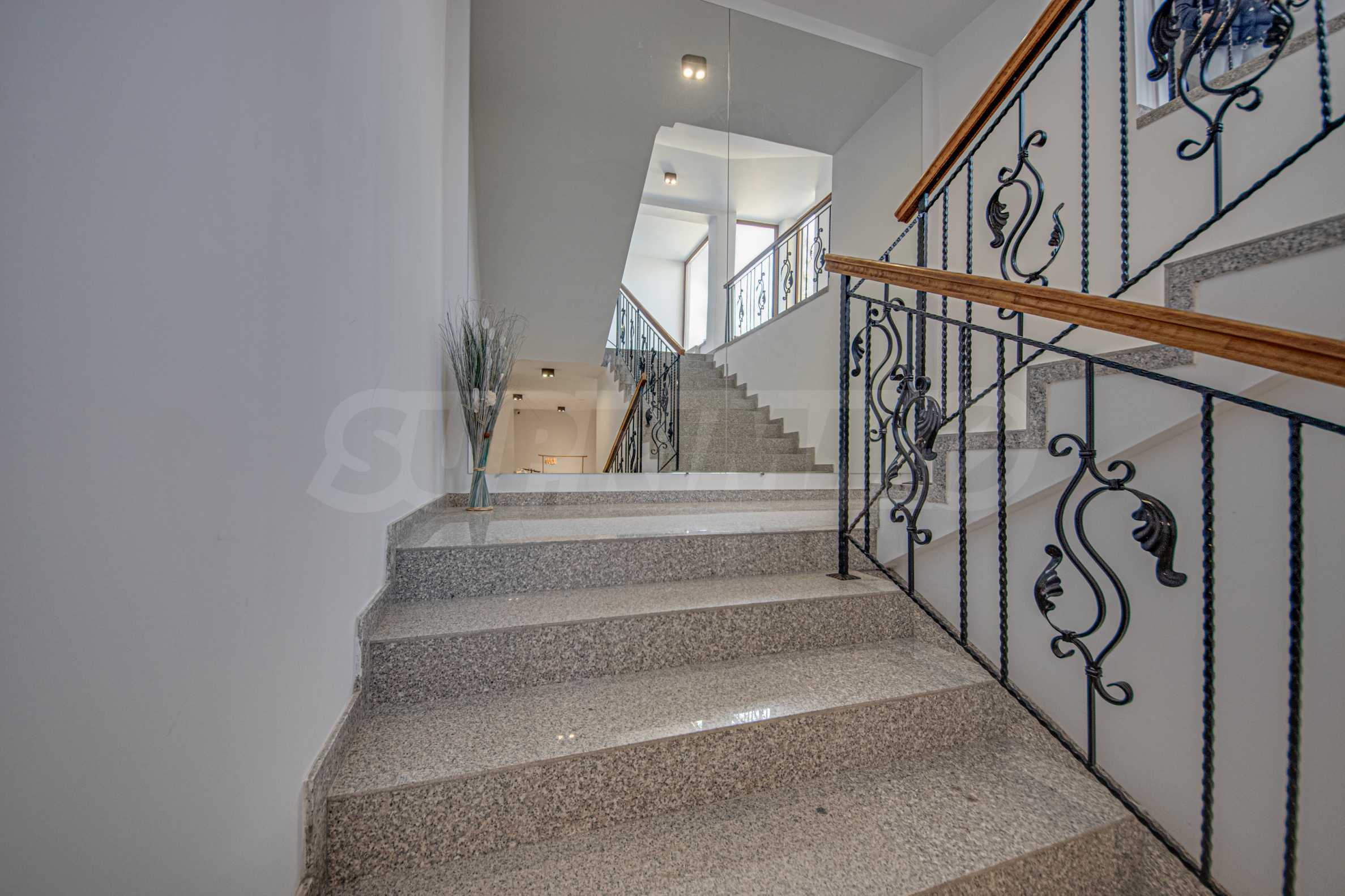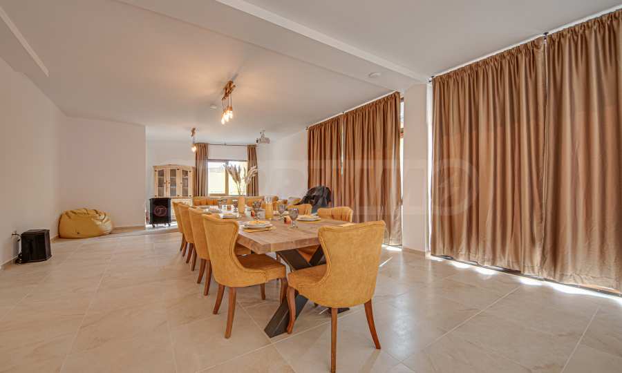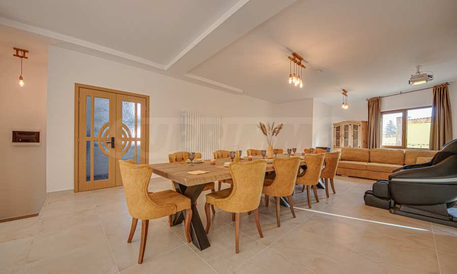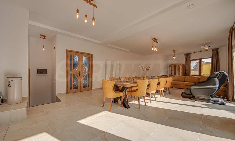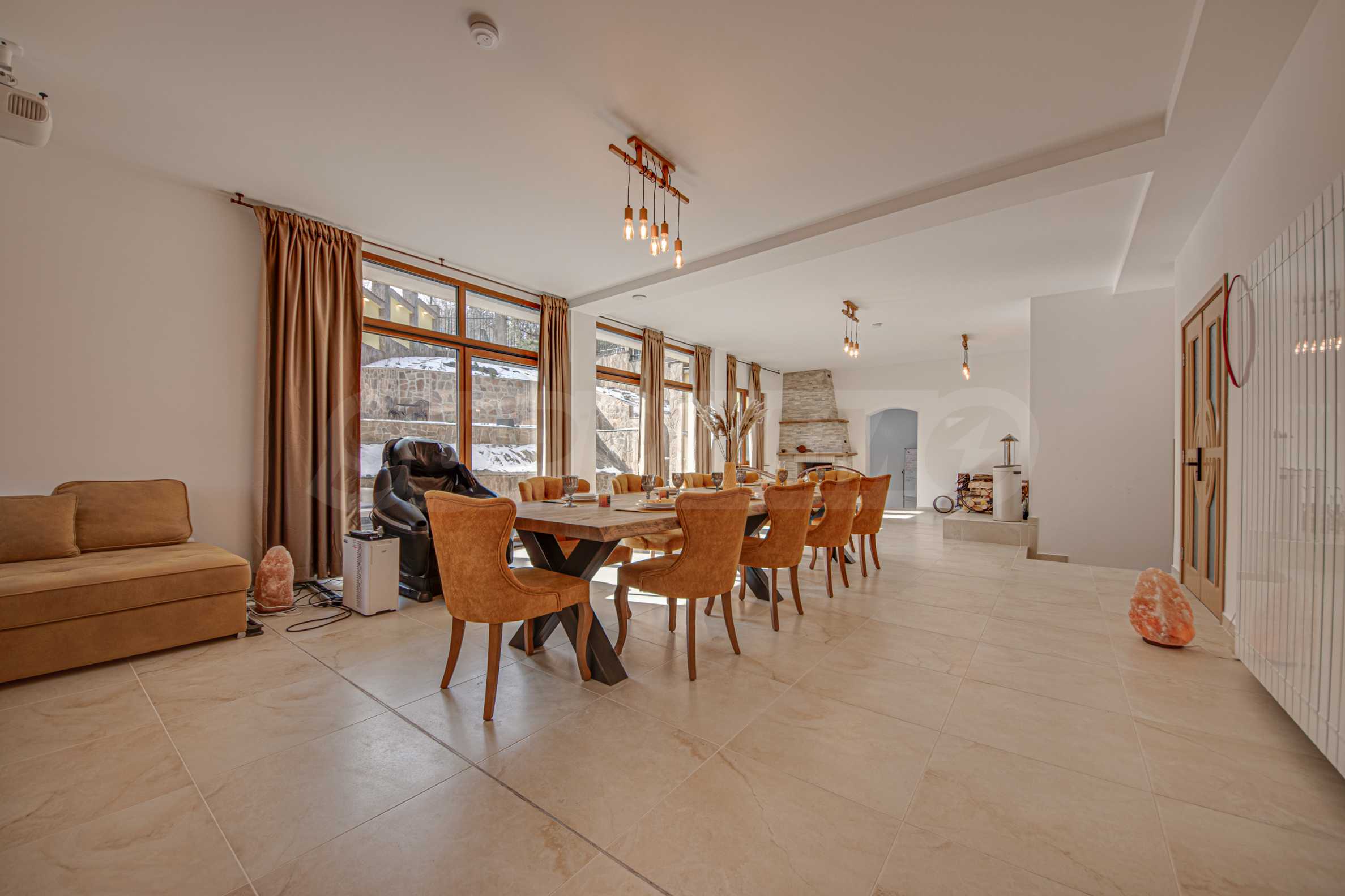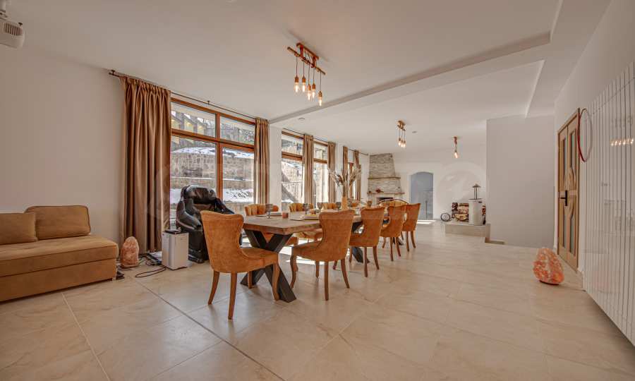 - първи етаж 234 кв.м: дневна с камина с огромна декинг тераса, каминна стая, кухня, двустаен апапартамент, офисна стая, тоалетна за гости;