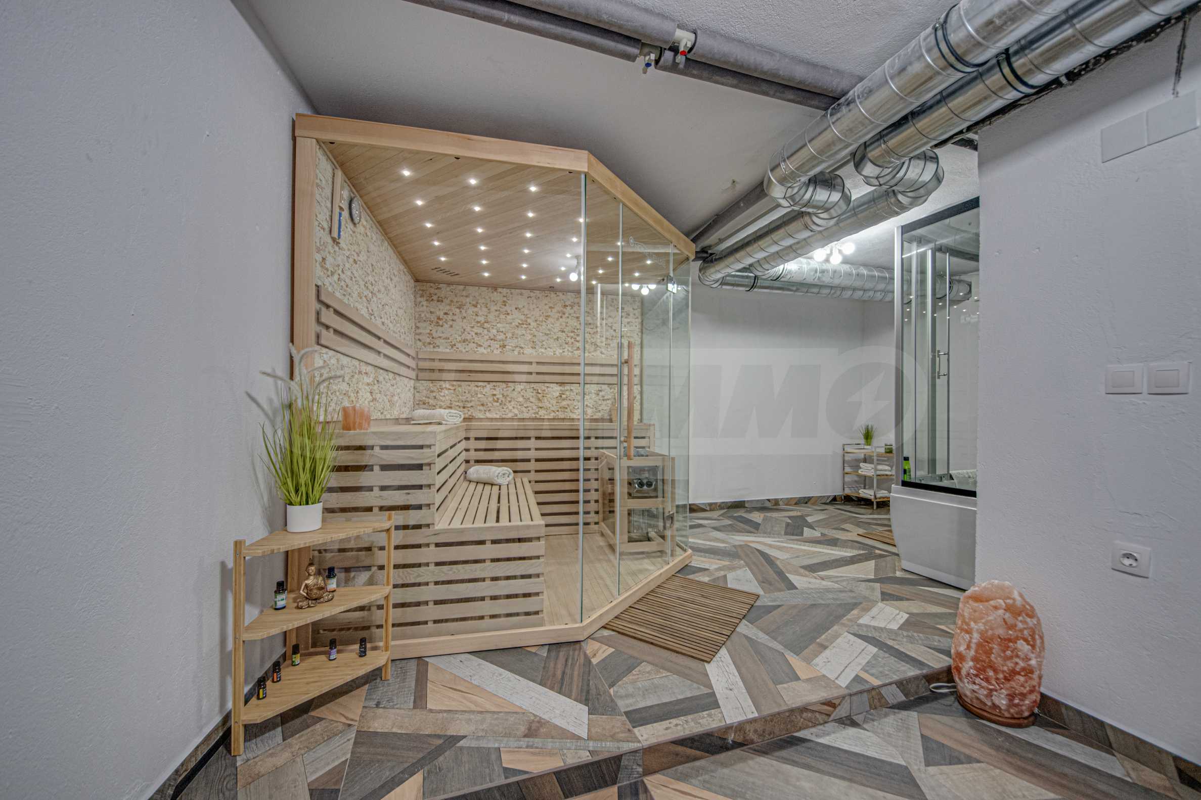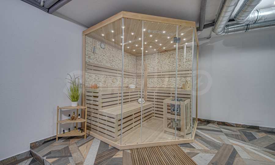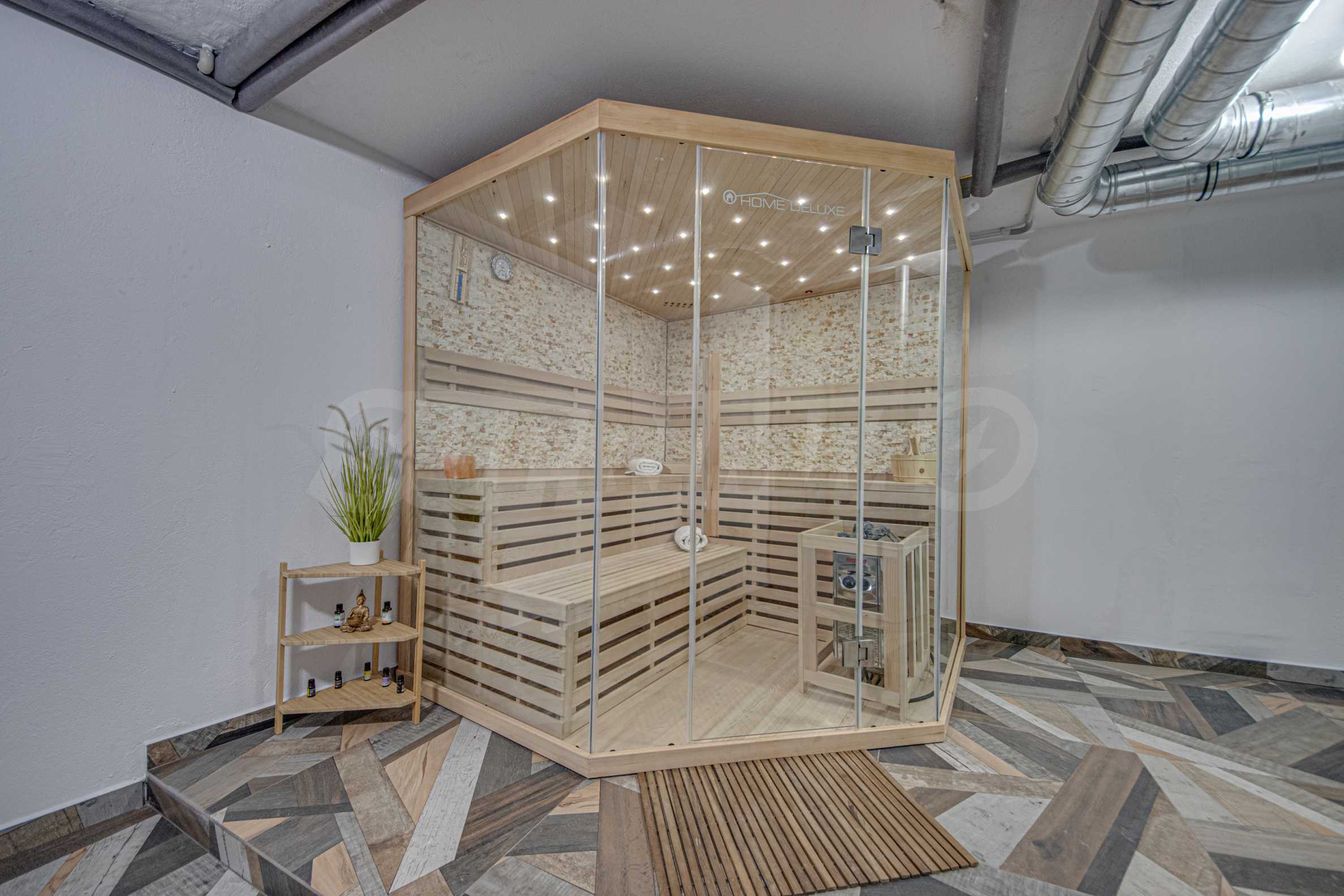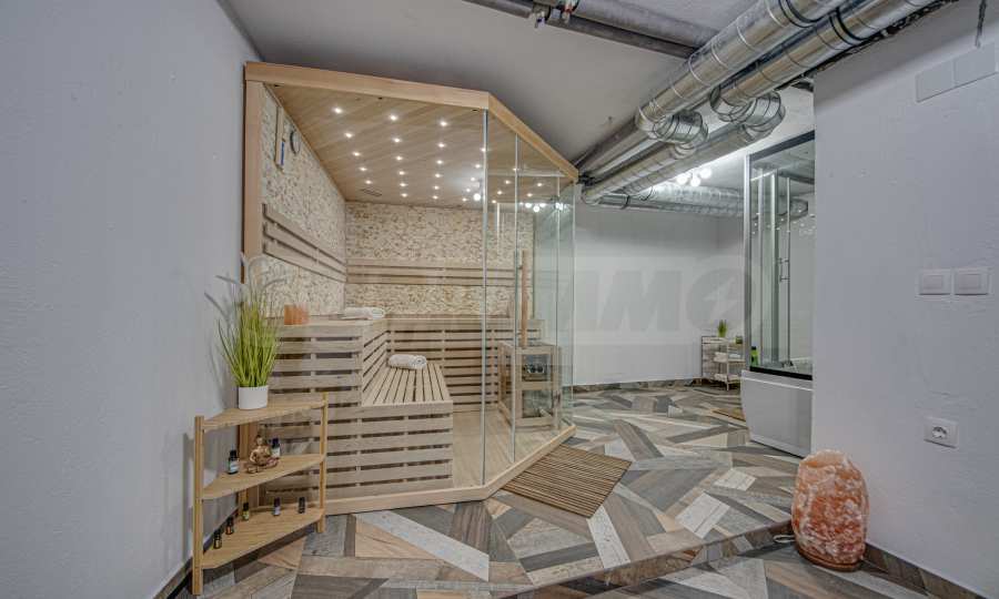 Партерния етаж предлага просторно помещение с барплот и с излаз на двор. На същото ниво е обособена зона за релакс включваща и сауна. Помещението може да бъде използвано както за фитнес,така и за игрална, конферентна или кино зала.