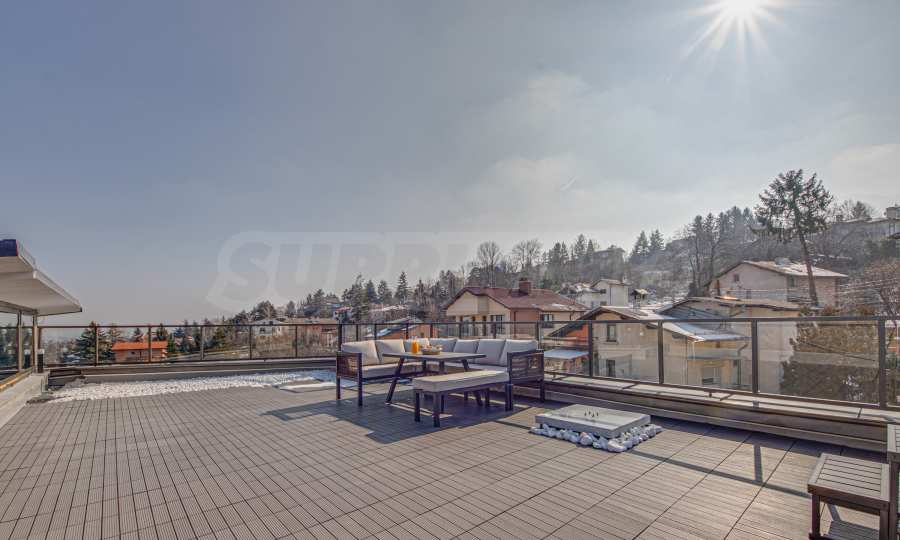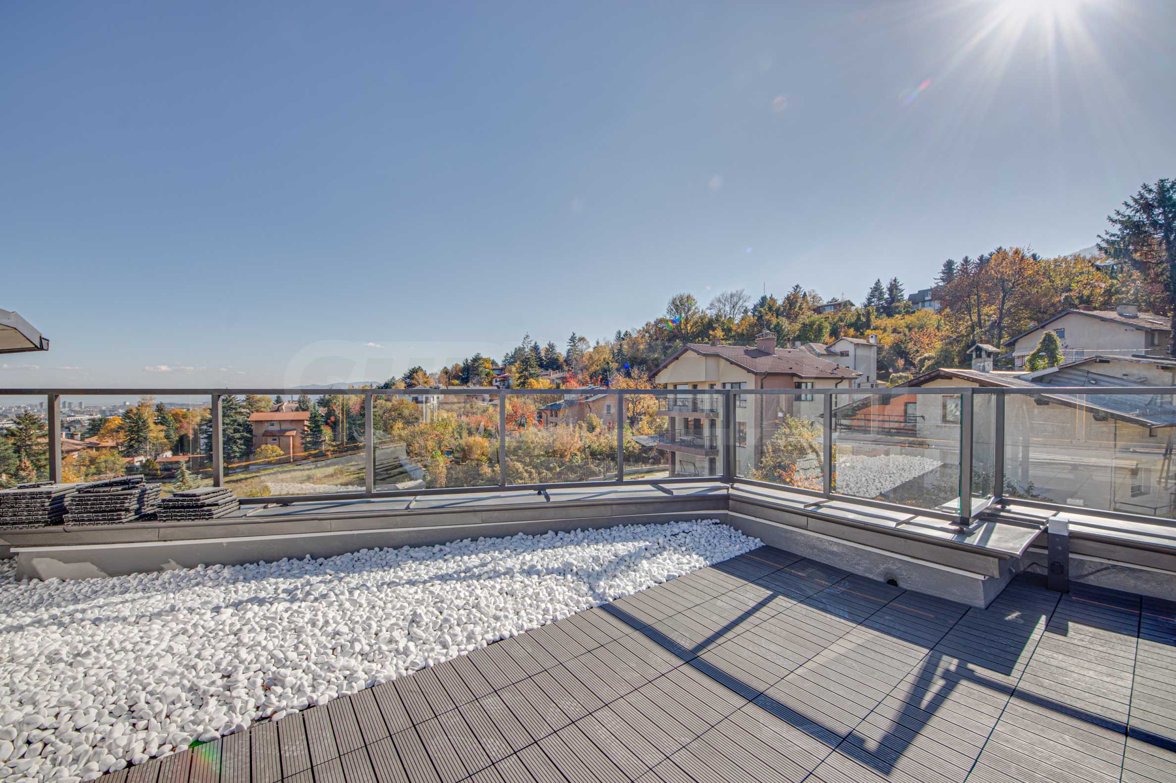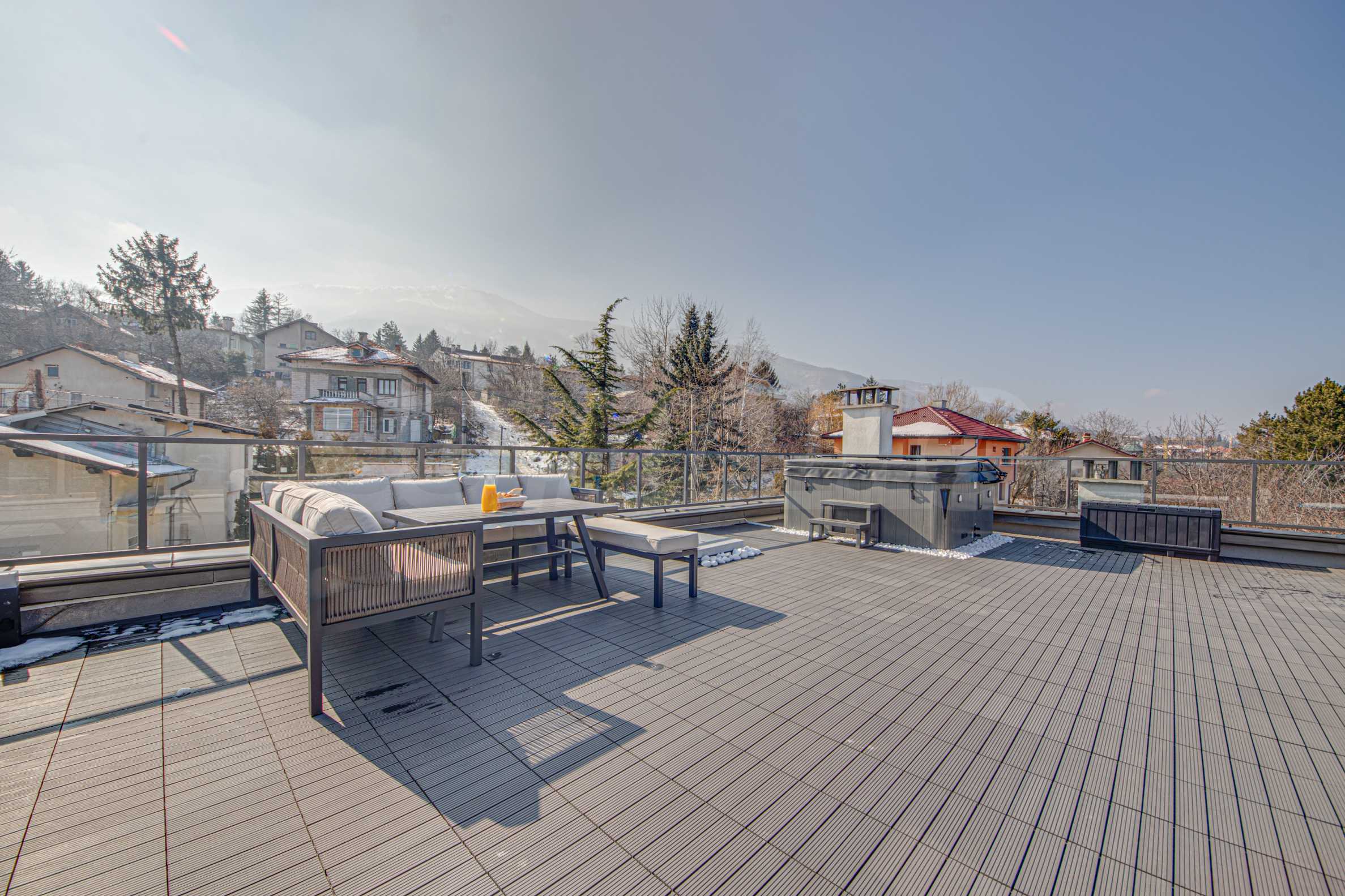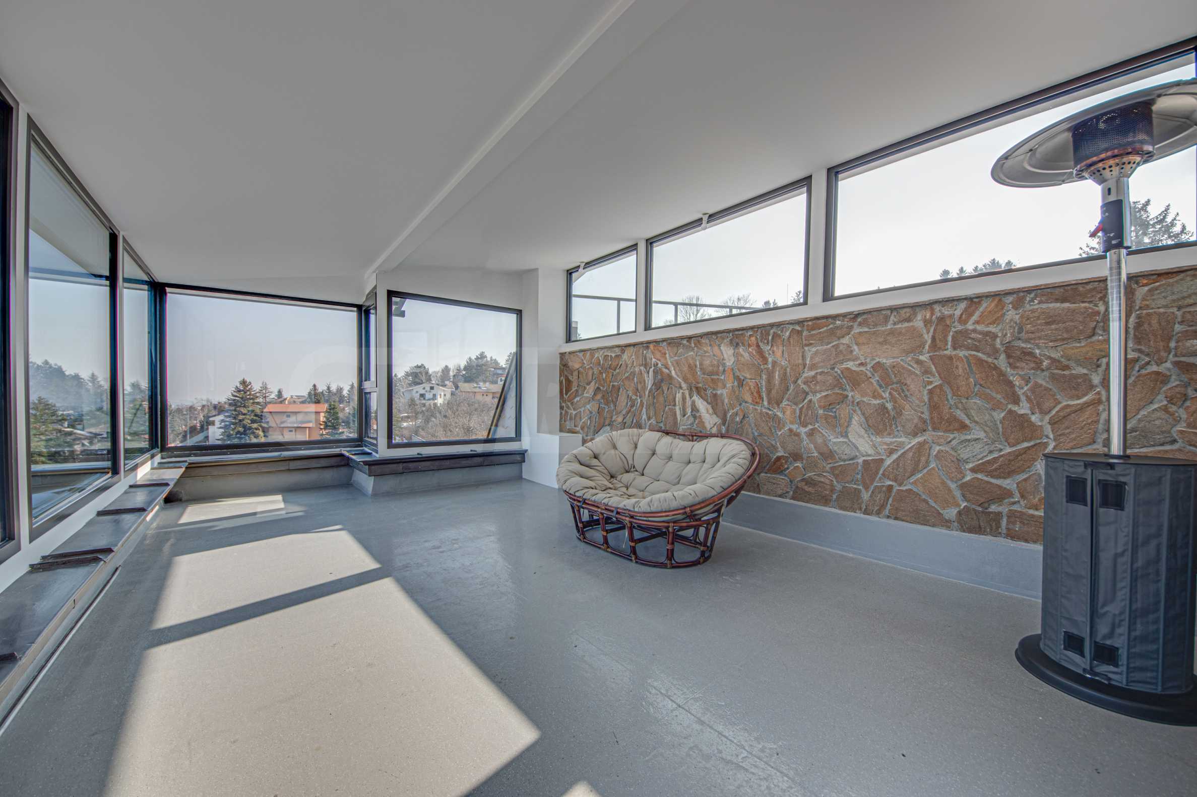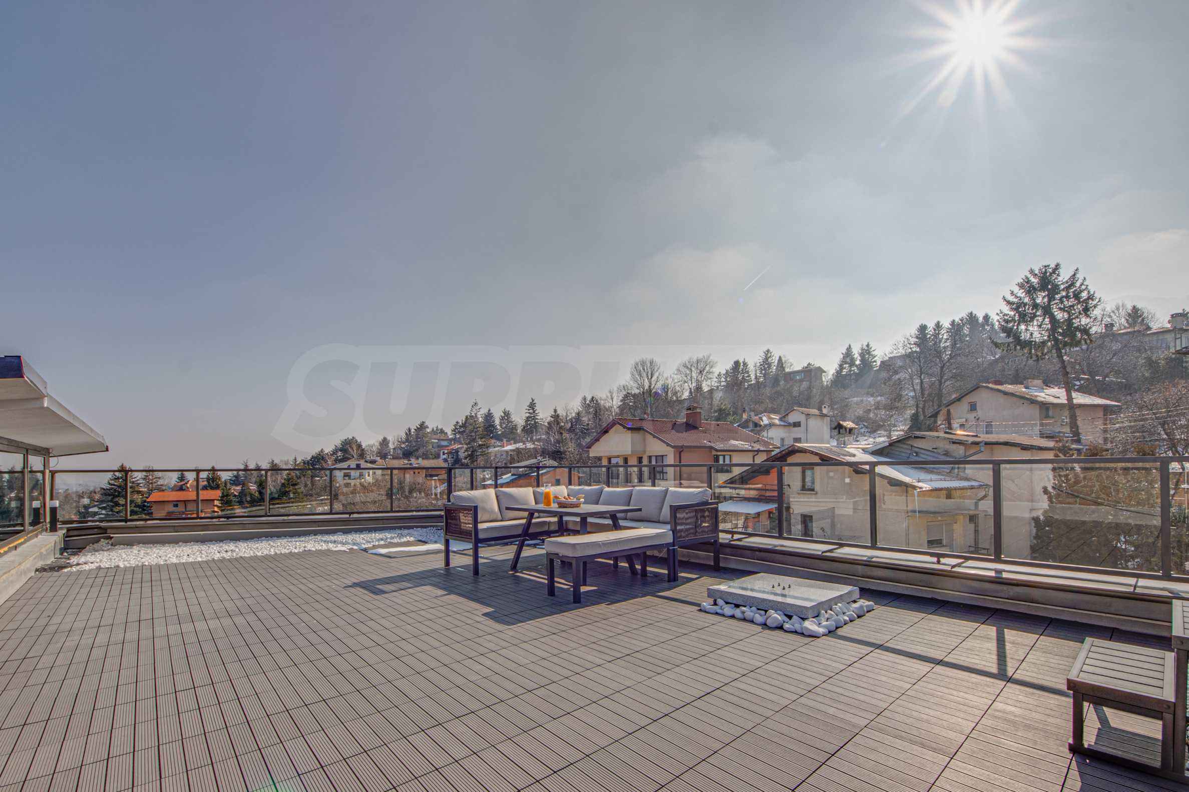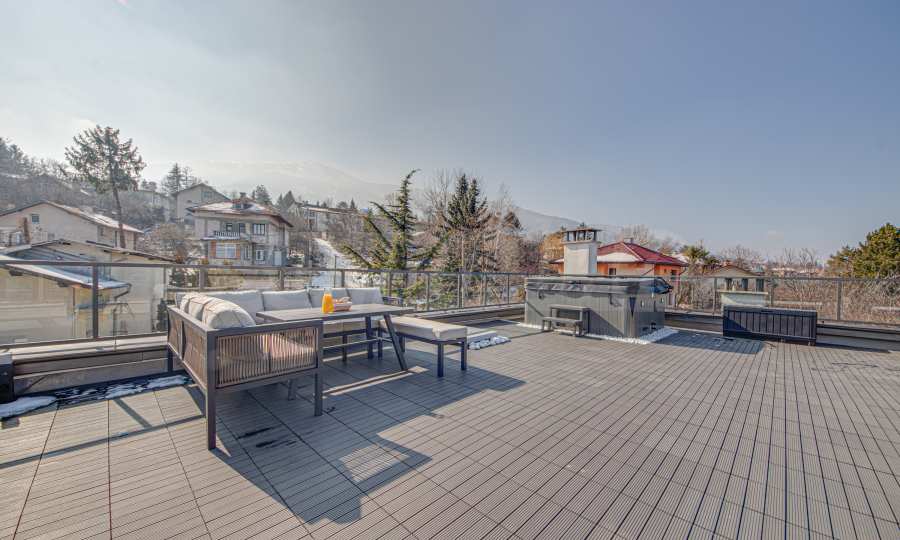 Прекрасни слънчеви тереси откриват впечатляващи гледки и към Витоша, Плана планина, Стара планина и към града. Последния етаж на къщата е особено внушителен - панорамните му прозорци са връзка с тераса притежаваща джакузи. Пространството предполога да бъде използвано, както за почивка, така и за парти.