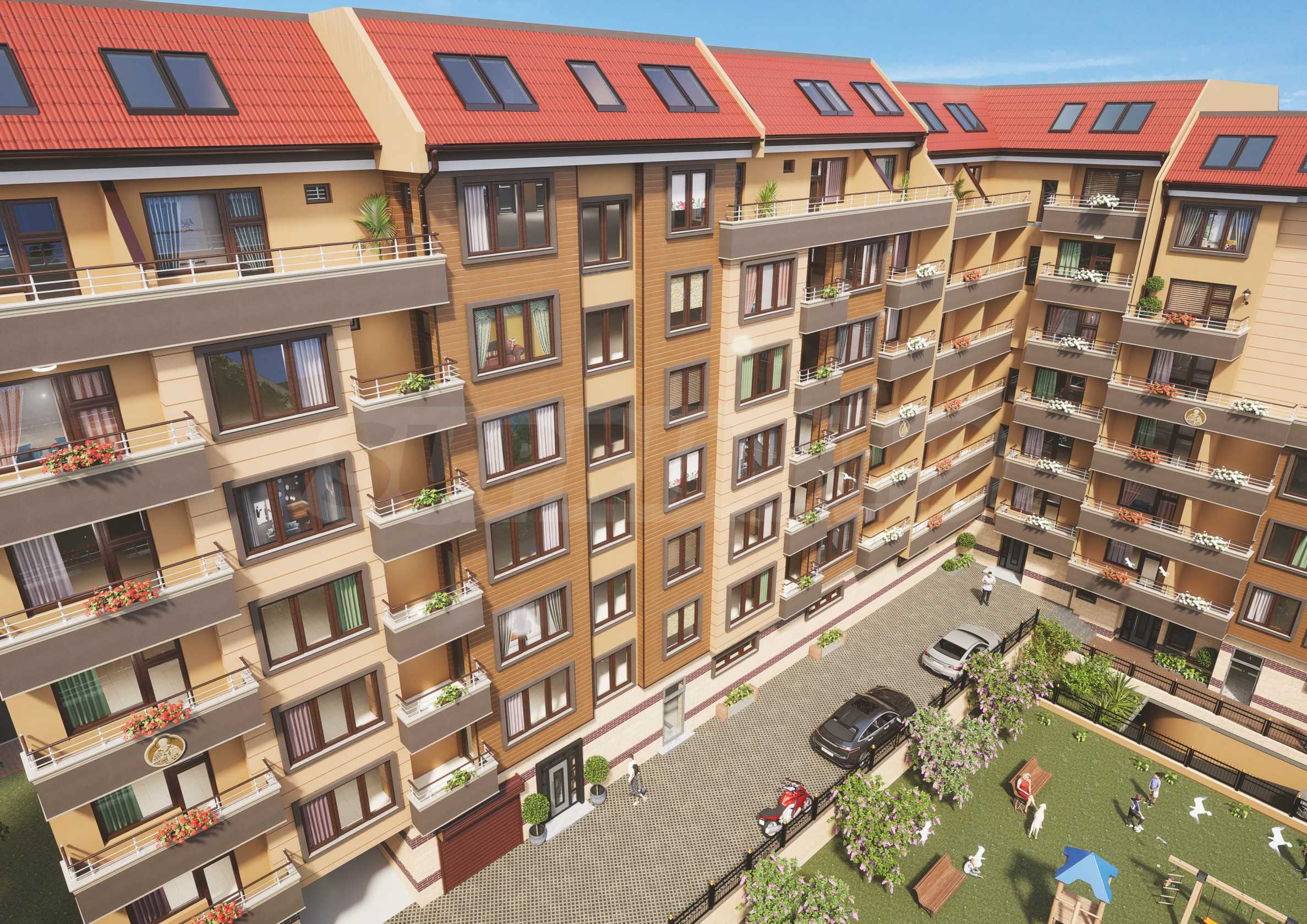 - общи части на сградата – напълно завършени, стени - камък „Травертин” на партерен етаж, останалите етажи – водоотблъскваща и UV устойчива мазилка „Тракон”, подови настилки – гранитогрес, стълбище-естествен гранит (цели стъпала);