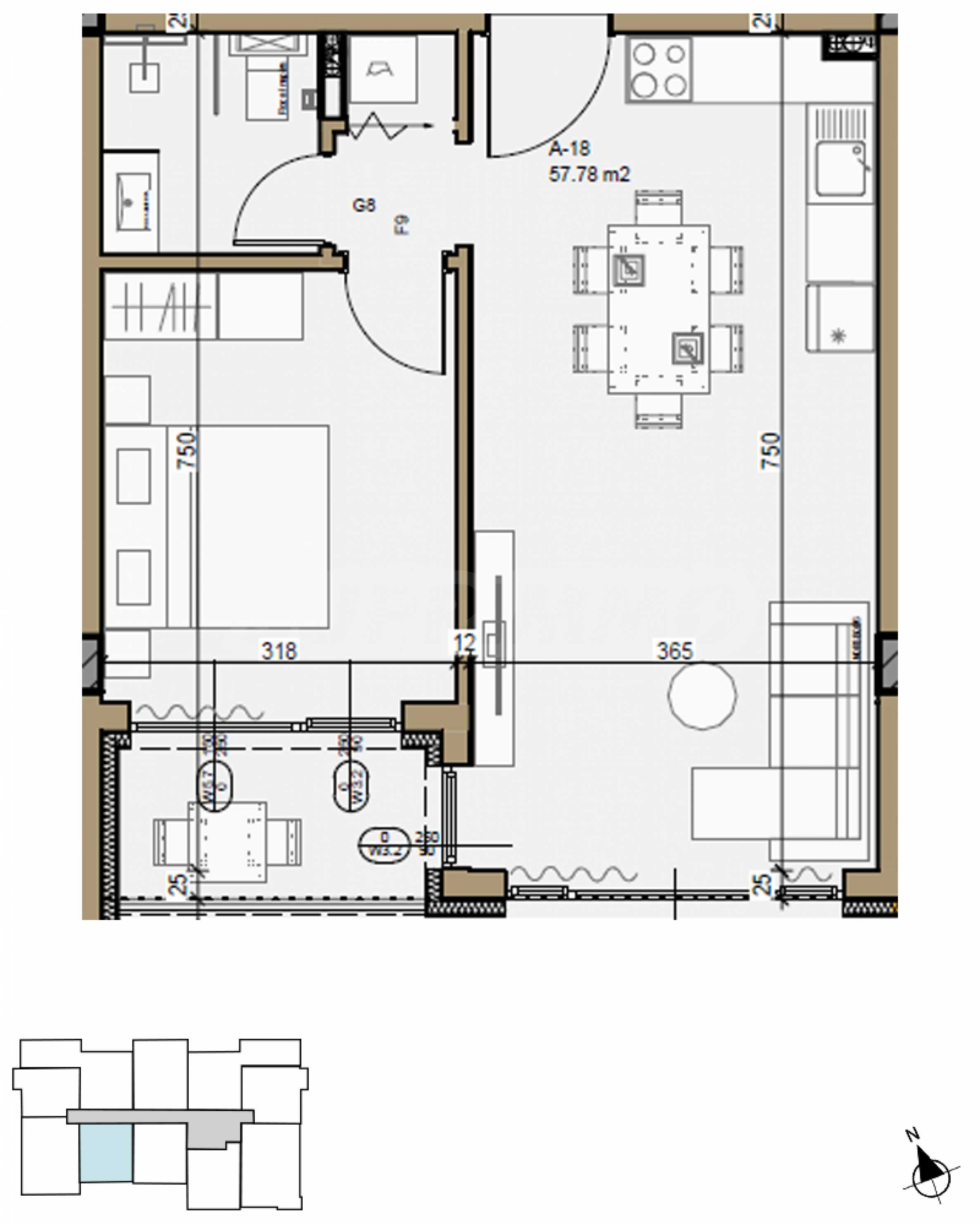 Разпределение: Предвижда се просторна всекидневна с кухненски бокс, уютна спалня, баня с тоалетна, антре и тераса.