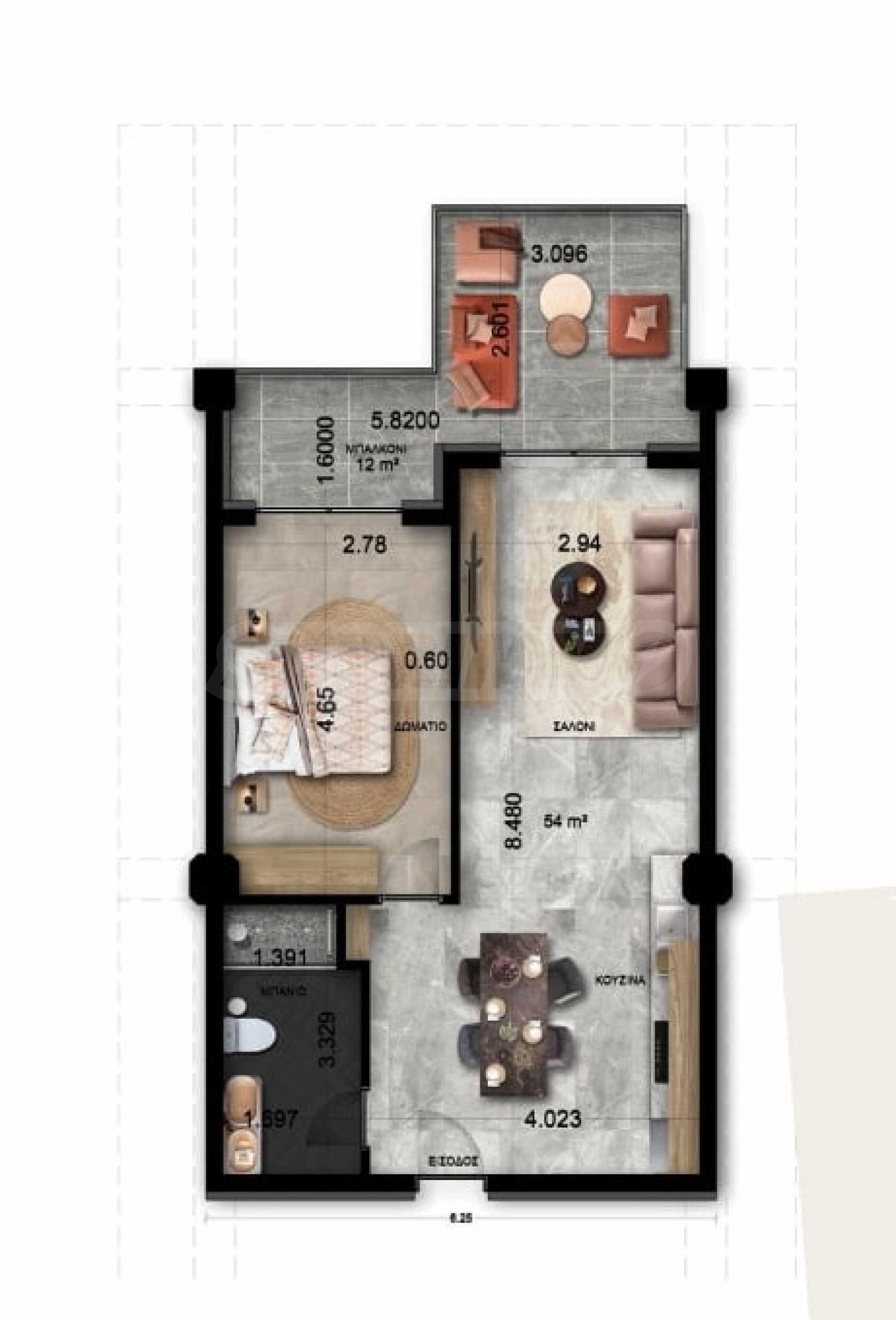 Имотът е на първи етаж в триетажна сграда и е разположен на 73.18 кв.м обща площ. Разпределението включва уютна всекидневна с кухня, спалня, баня с тоалетна и тераса.