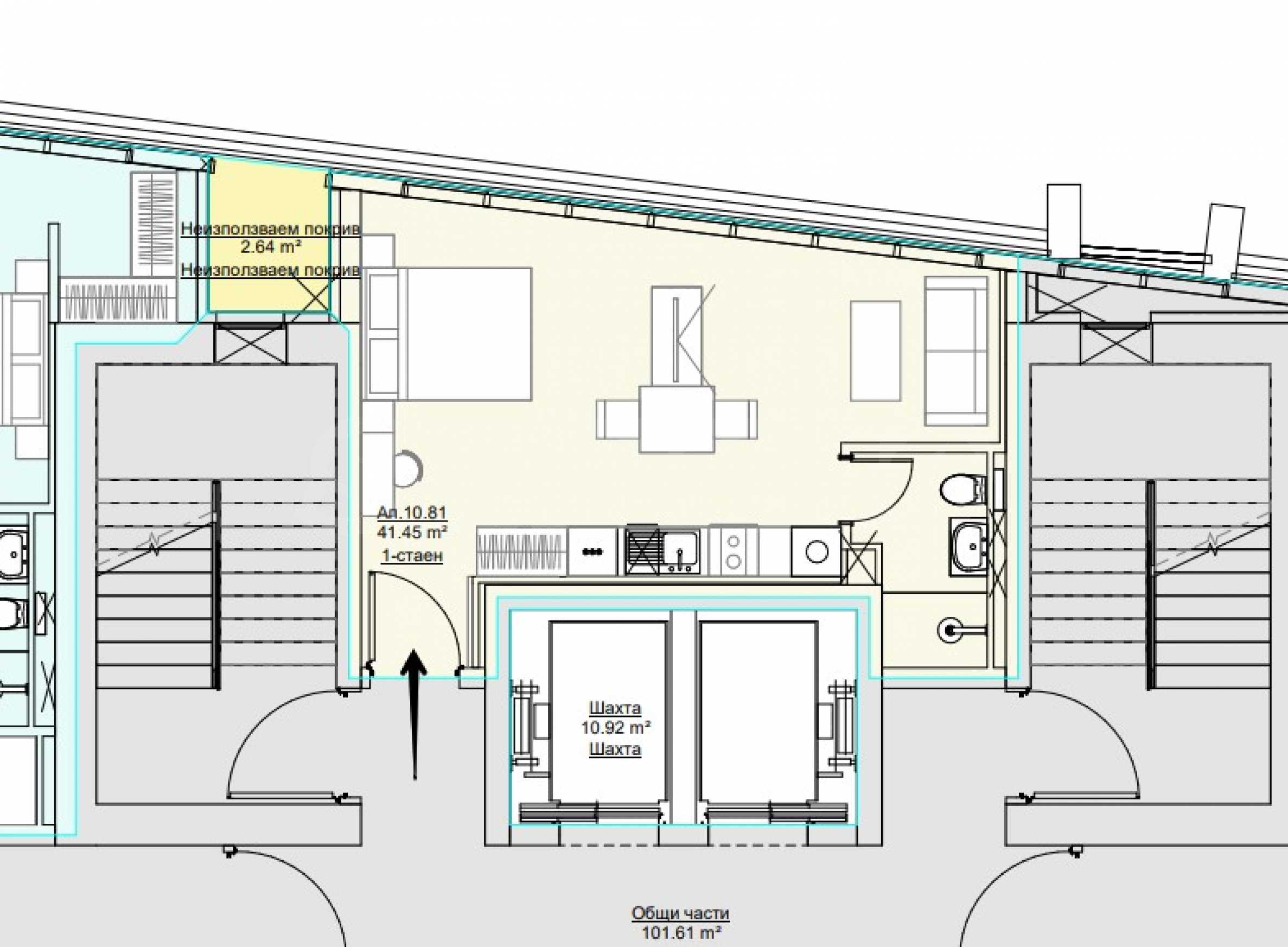 Апартаментът е ситуиран на 10-ти етаж от общо 15 и предлага обща площ 50.59 кв.м (нетна площ 41.45 кв.м + общи части 9.14 кв.м).