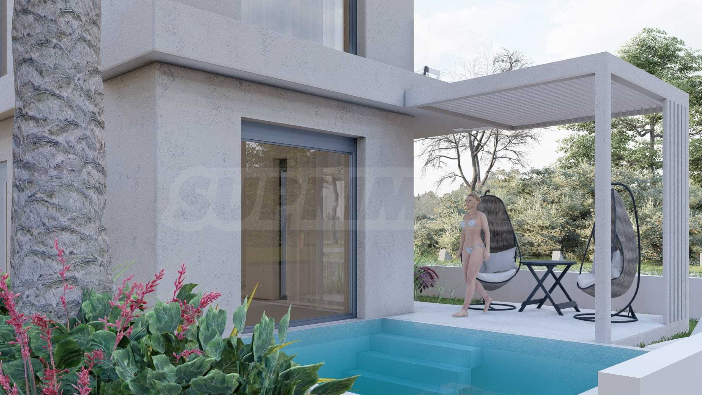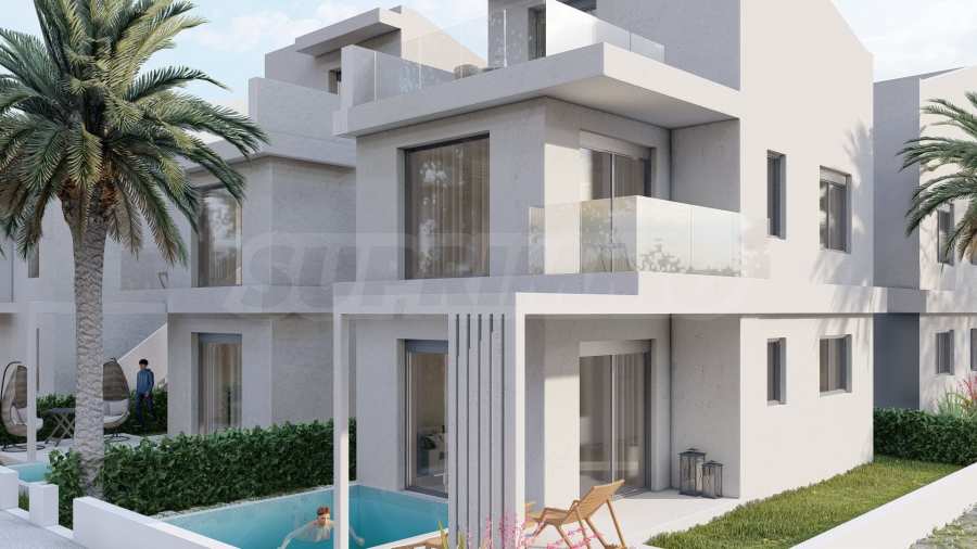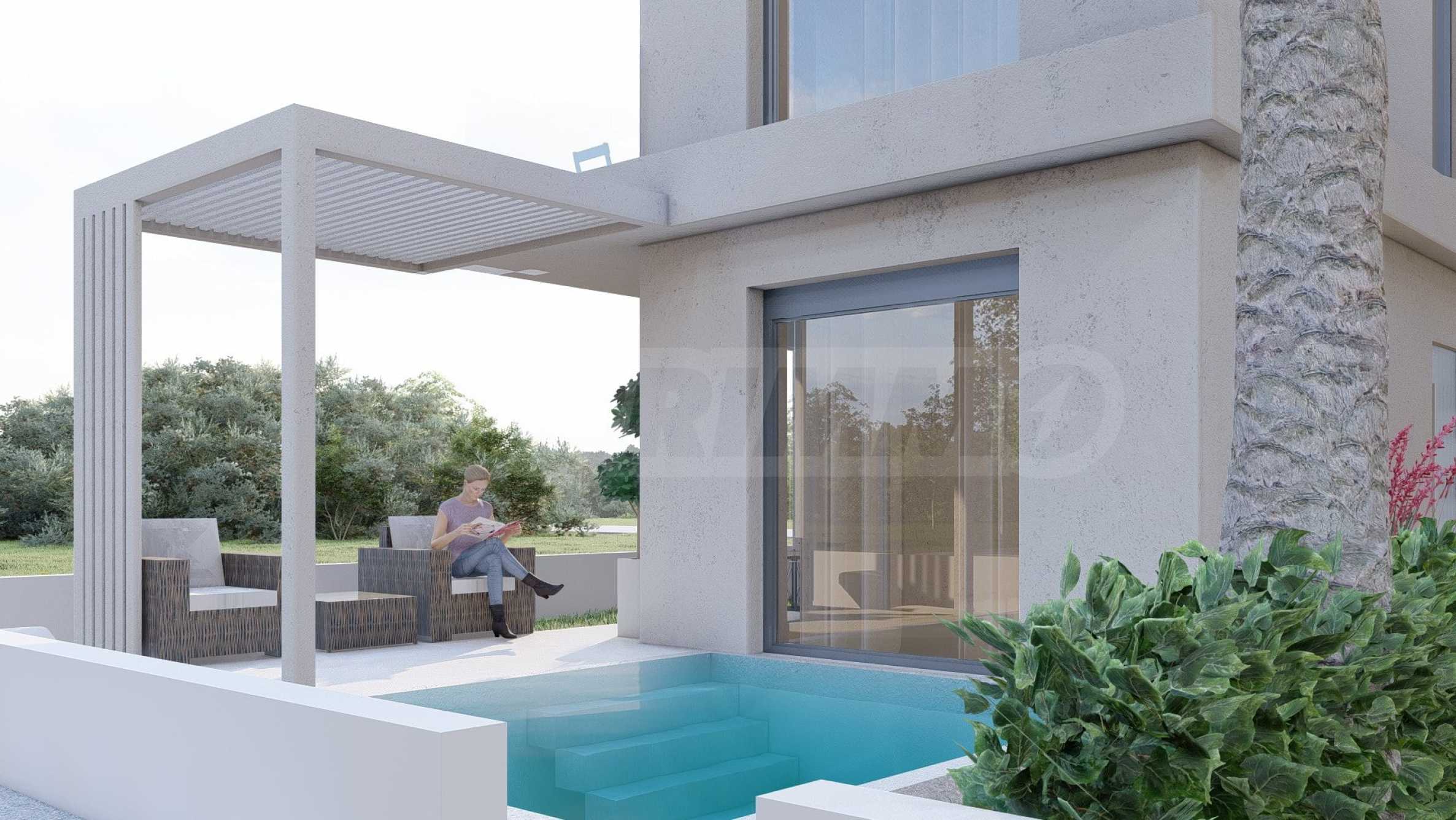 Триетажна къща с басейн на 50 м от плажа в Паралия Офринио