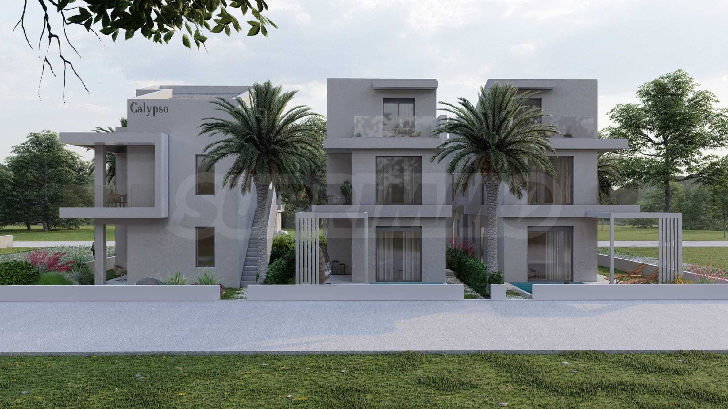 Най-голямото предимство на комплекса е неговата локация - намира се само на 50 метра от плажа и на 70 метра от главната пешеходна улица, където се намират всички магазини, ресторанти и заведения, здравен център, аптека и др. Calypso се състои от 7 комфортни летни резиденции, като компанията инвеститор не прави компромиси по отношение на качеството на обекта и в строителството е заложено на качествени материали. Жилищата се предават с кухненско обзавеждане, оборудвана баня, централна входна врата, интериорни врати и поставена PVC дограма с комарници. Избрани резиденции разполагат със собствен външен басейн точно до верандата, превръщайки пространството в отлично място за релаксация и пълноценна почивка.