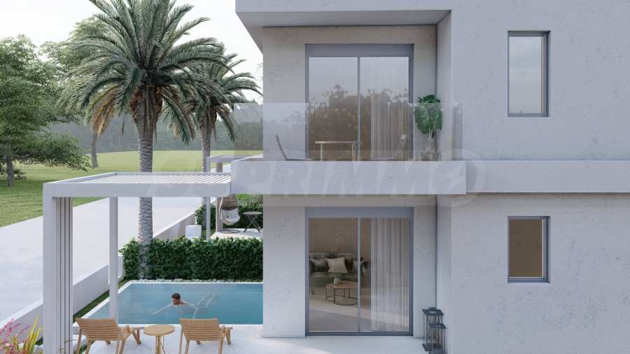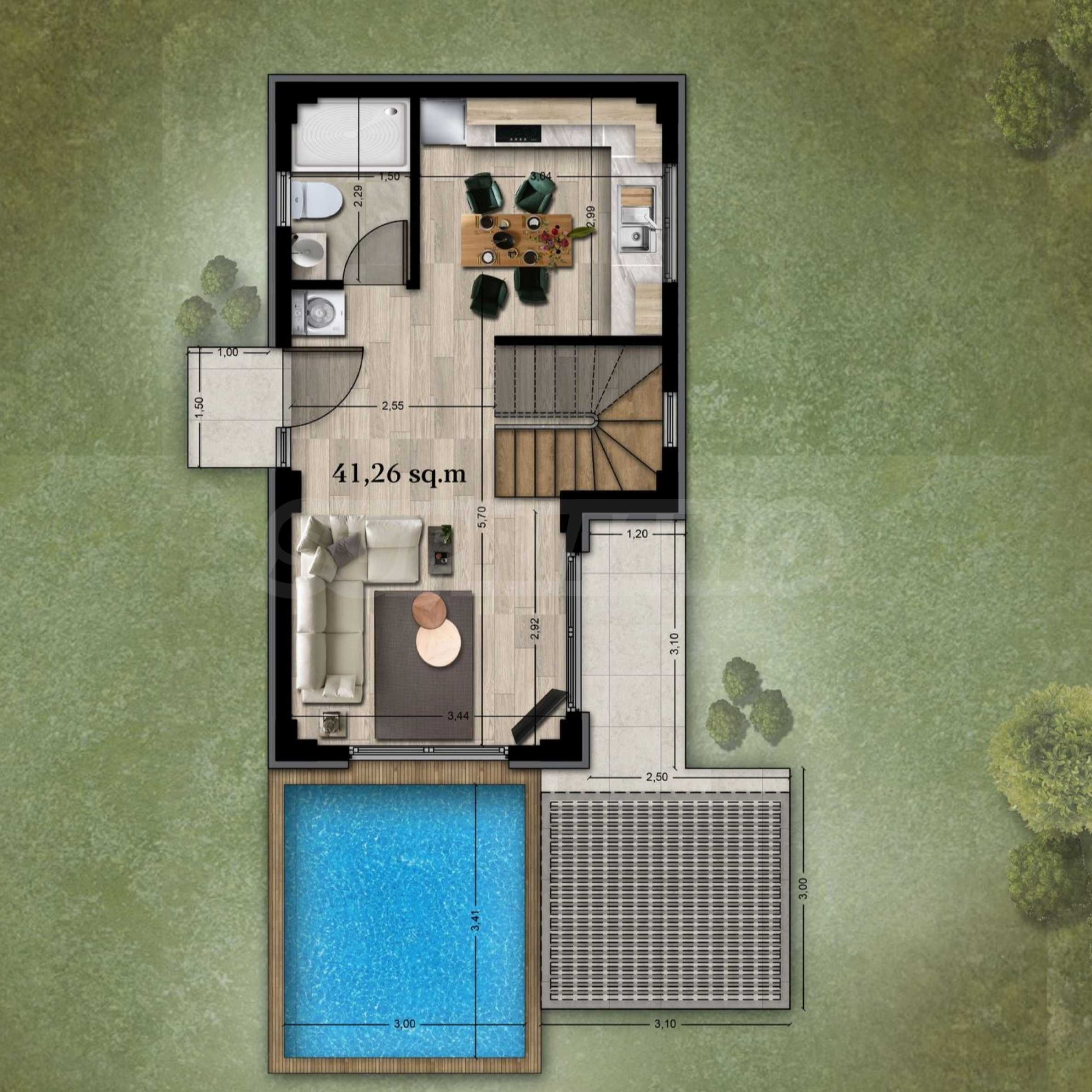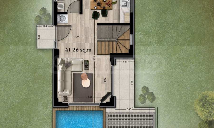 - Първо ниво: просторен хол с кухня и трапезария, баня с тоалетна, излаз към веранда и външен басейн;