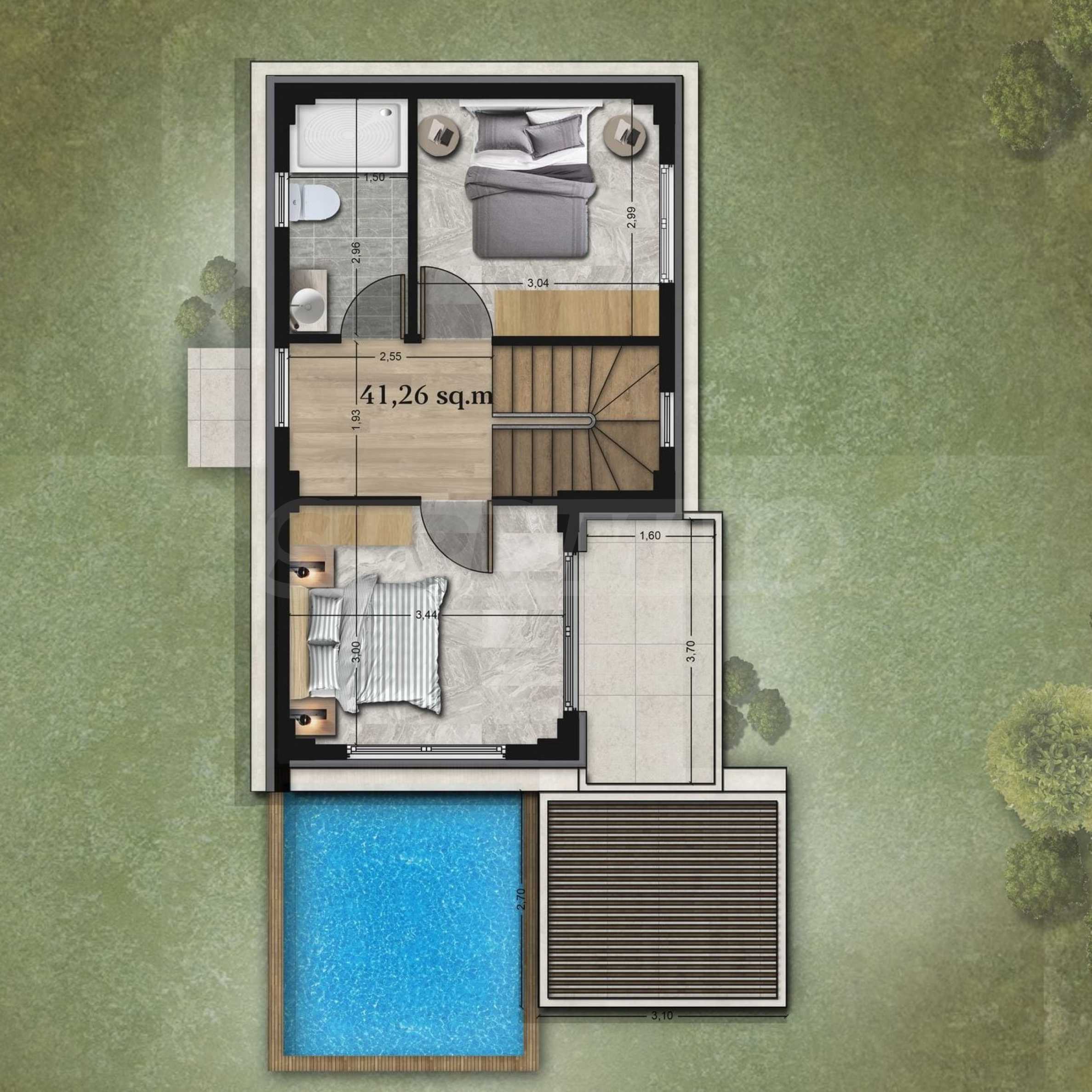 - Второ ниво: две спални, баня и тоалетна, тераса;