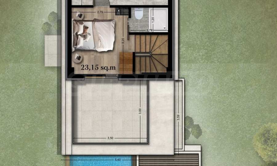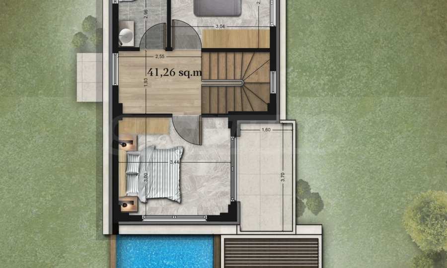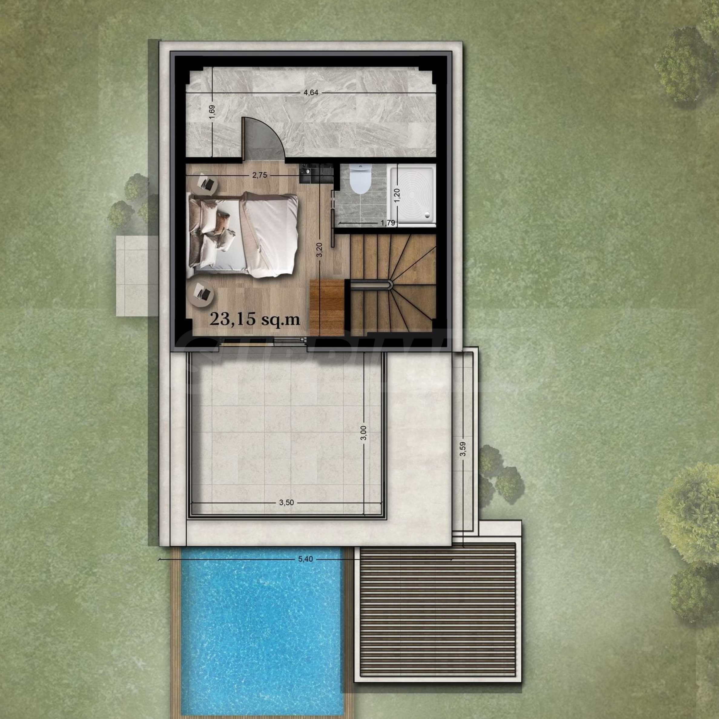 - Трето ниво: спалня с баня и тоалетна и излаз към тераса.