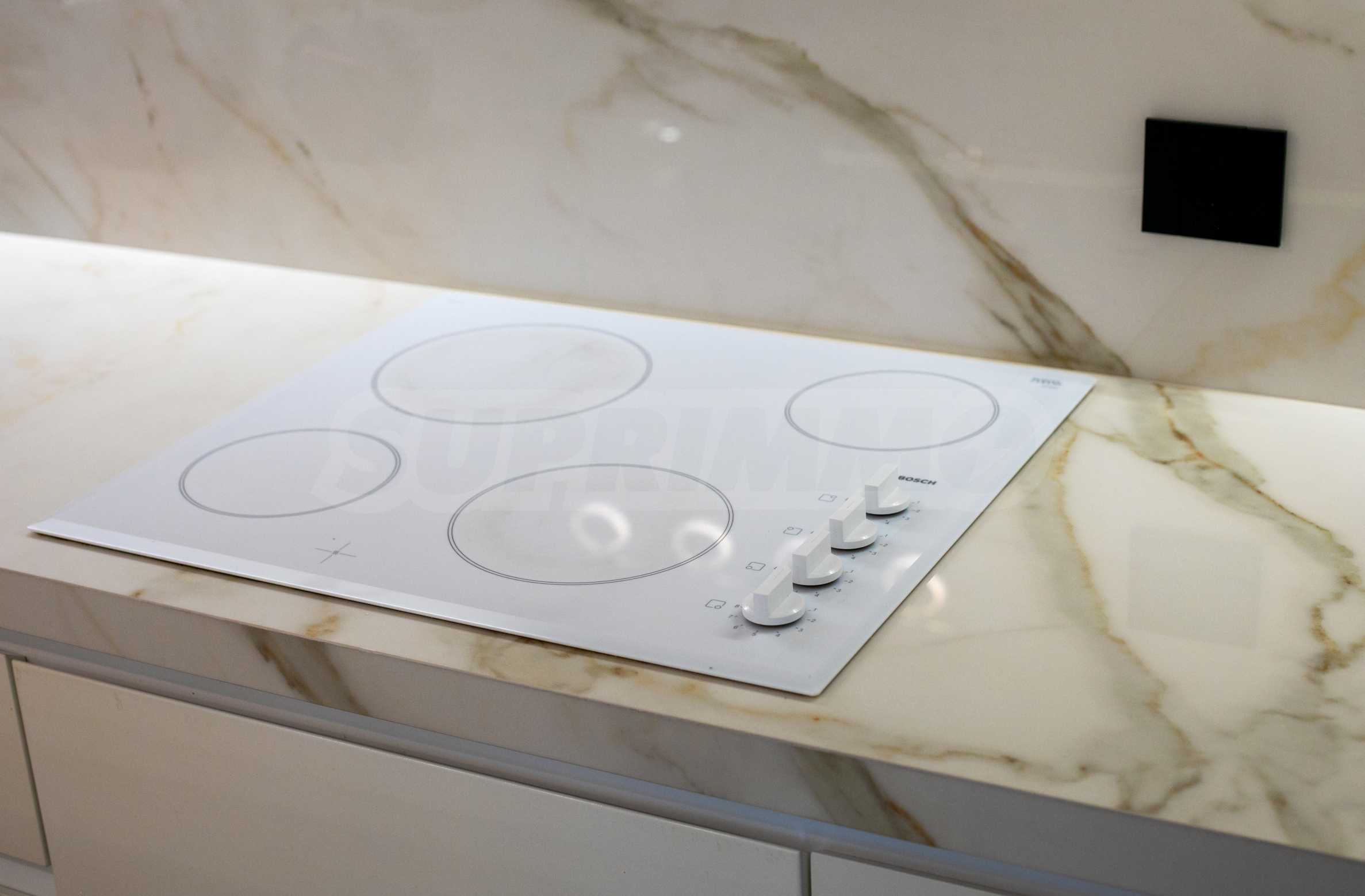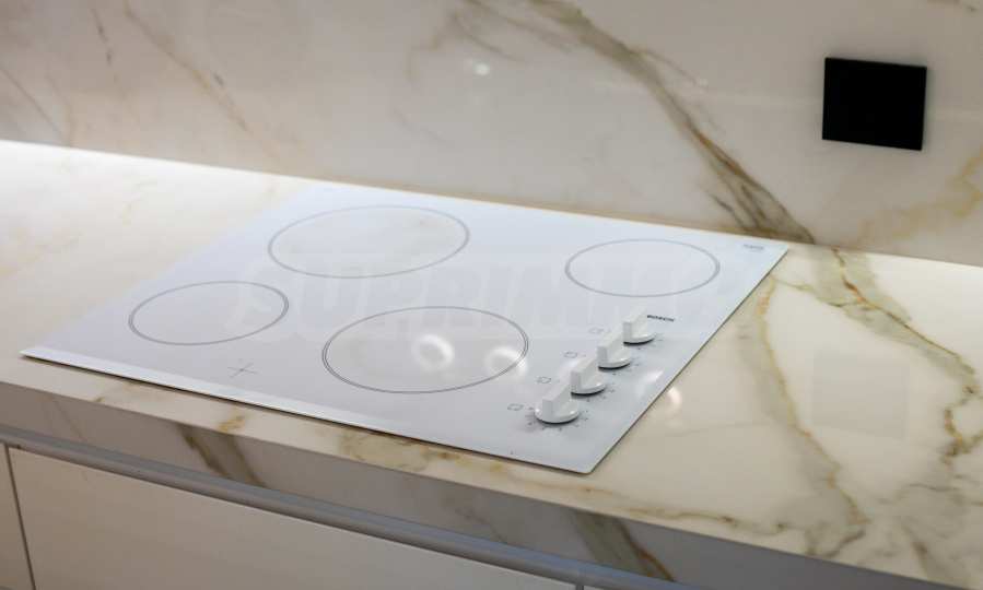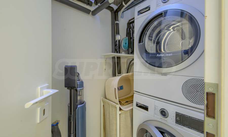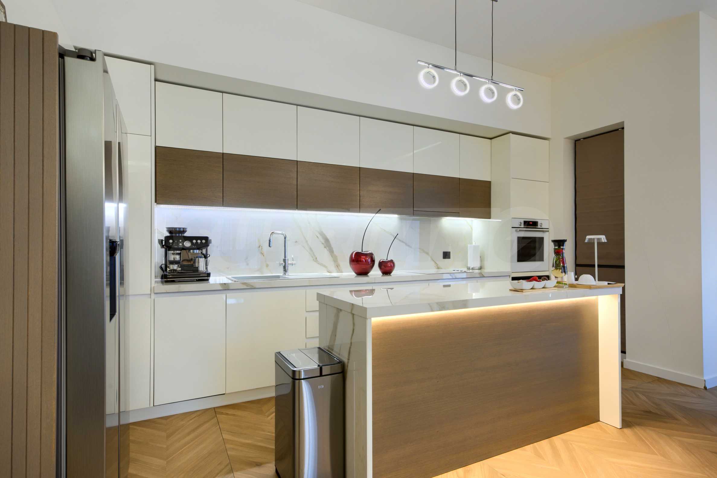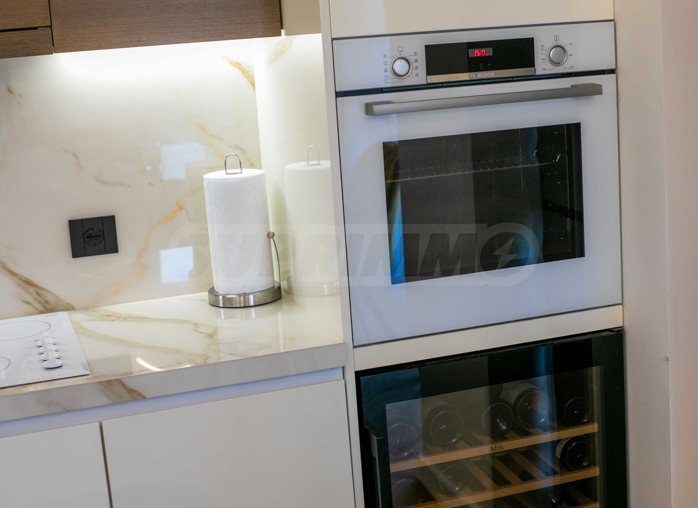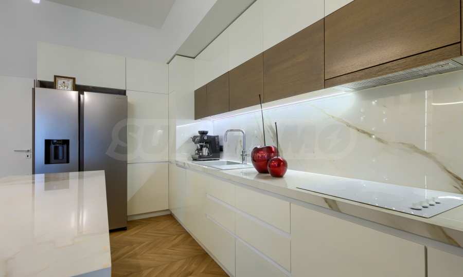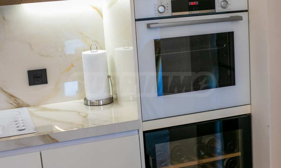 Кухнята е напълно оборудвана с бяла техника от Bosch и Samsung, включително витрина за вино AEG и **система Grohe за пречистване на питейна вода с охлаждане и газировка. Черната техника включва 4 телевизора (Sony 75" и 43", Samsung 55" и 43"), саундбар Bose, както и робот за сухо и мокро почистване Dreame L20 ultra.