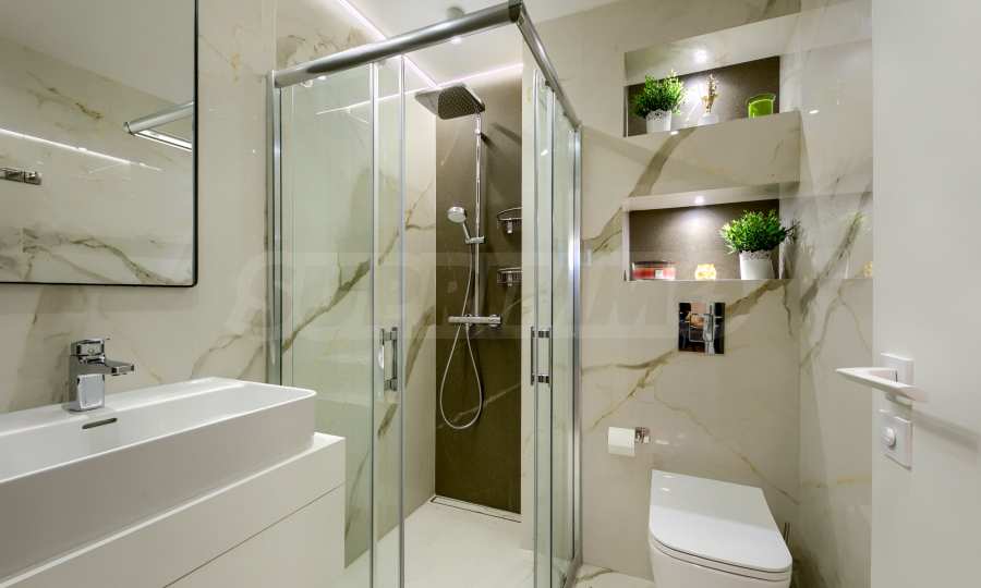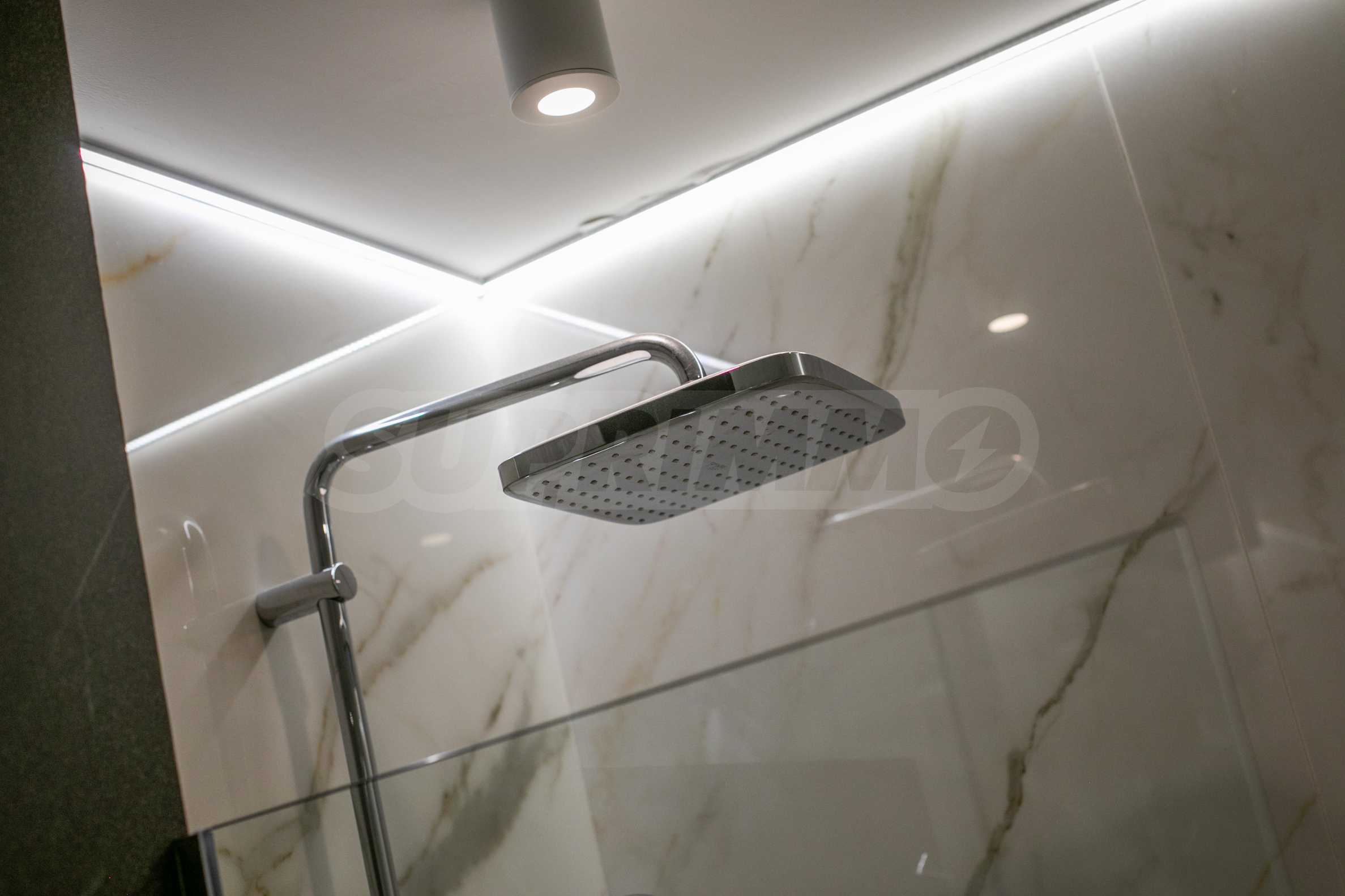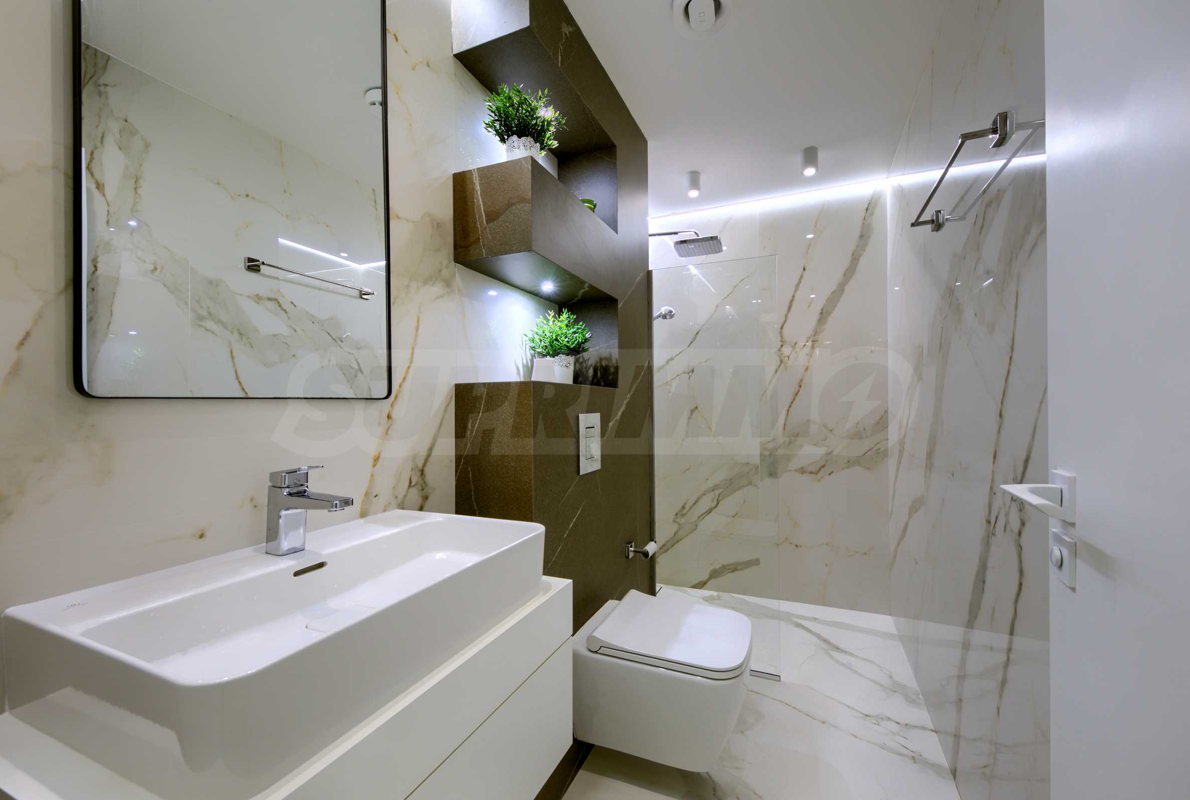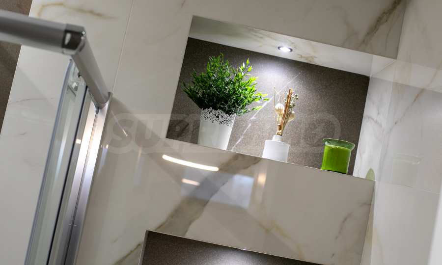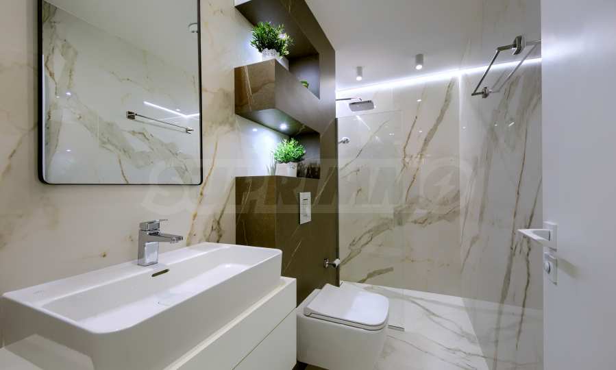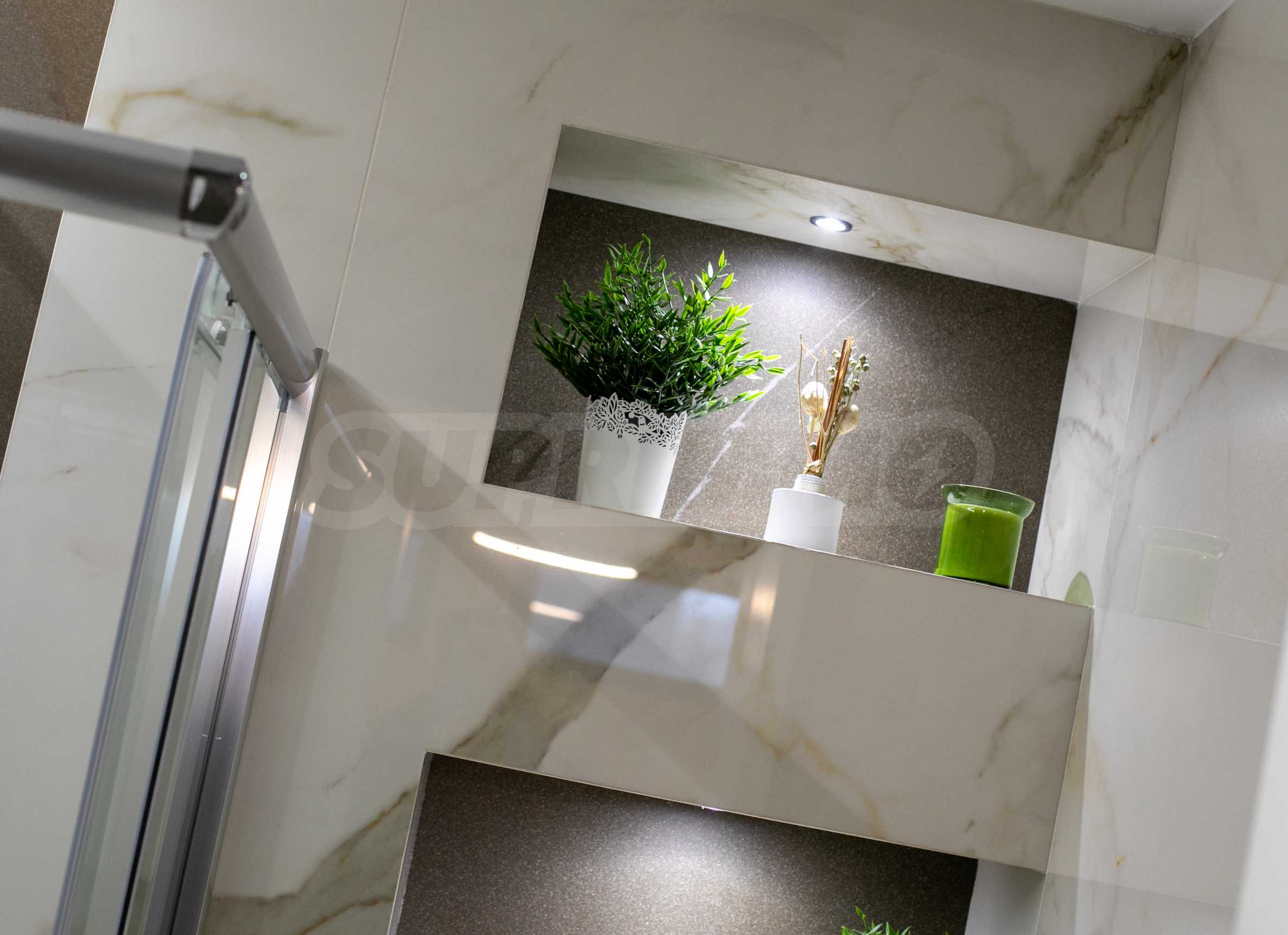 Довършителните материали са от най-висок клас: широкоформатни керамични плочи LAMINAM в баните, коридора и върху кухненските плотове, а душ системите Grohe осигуряват лукс и комфорт.