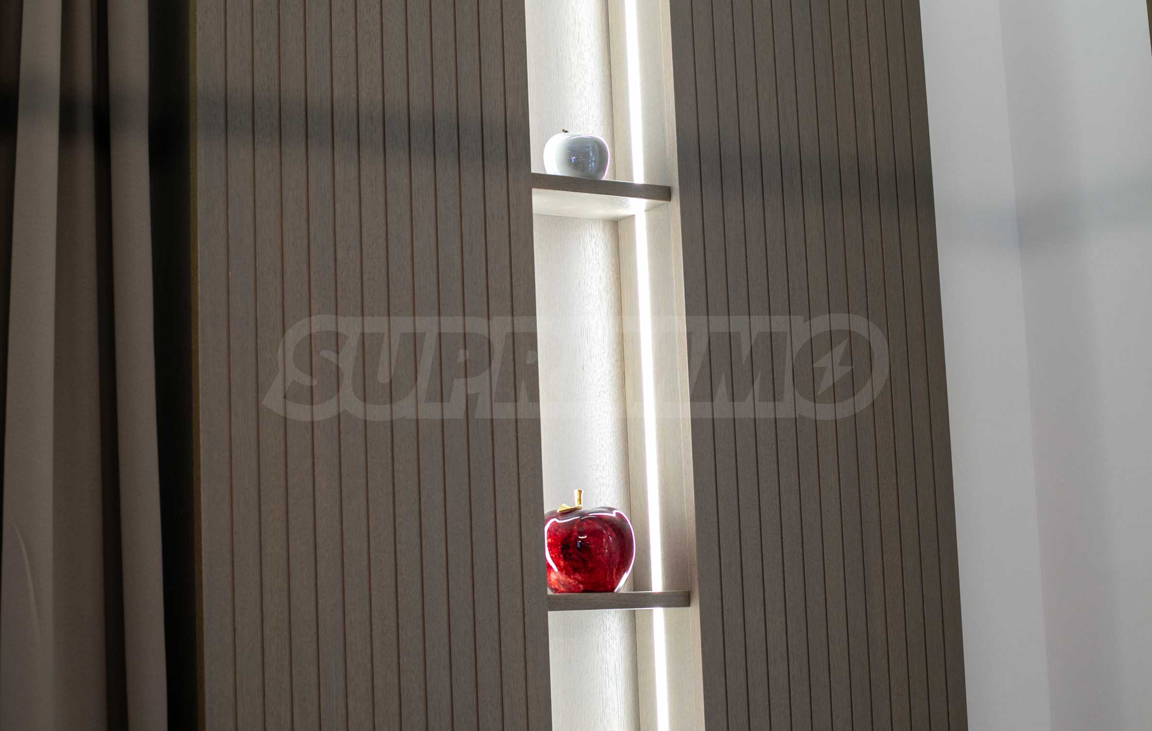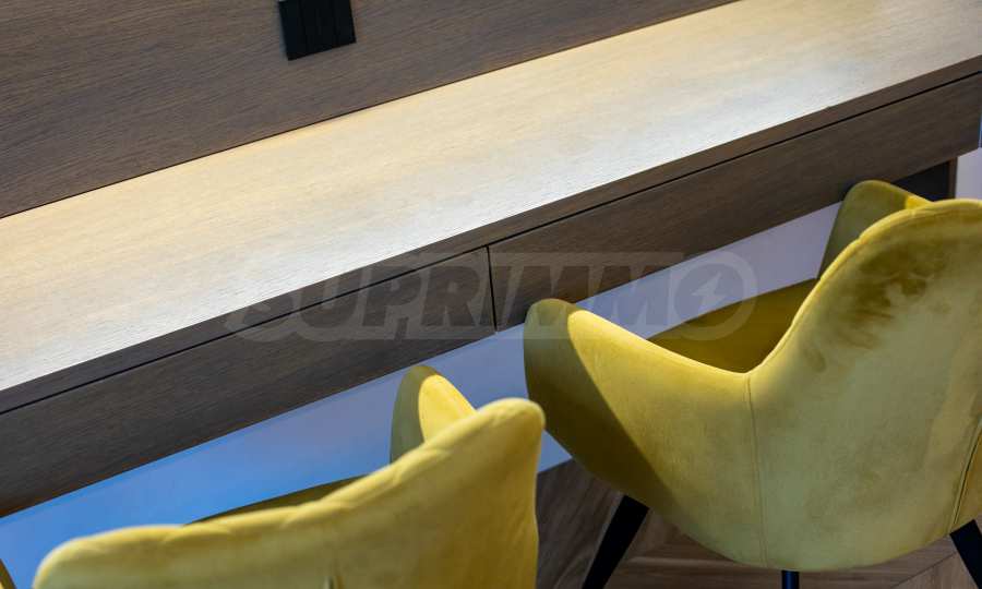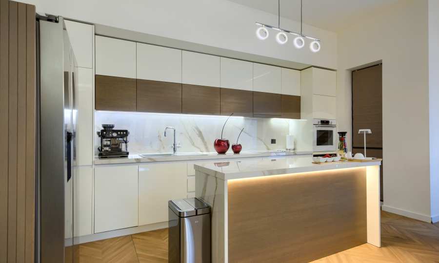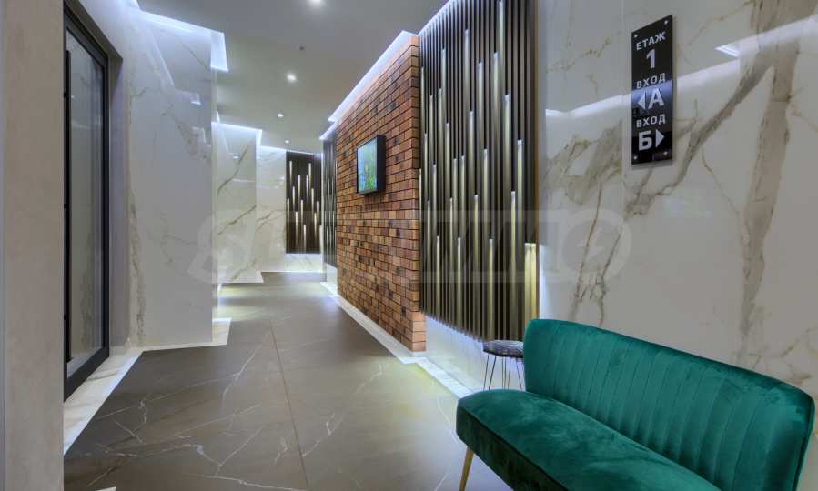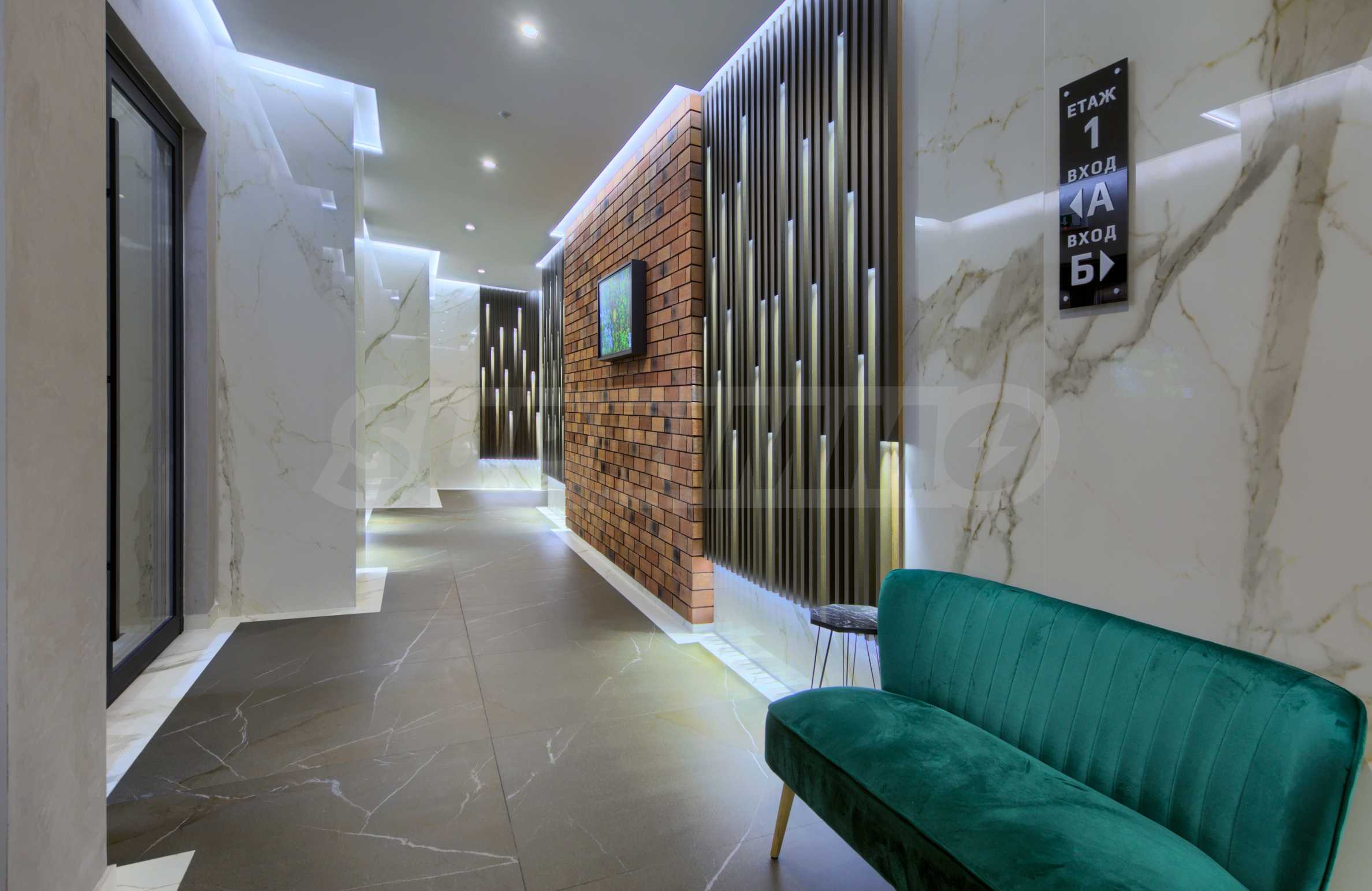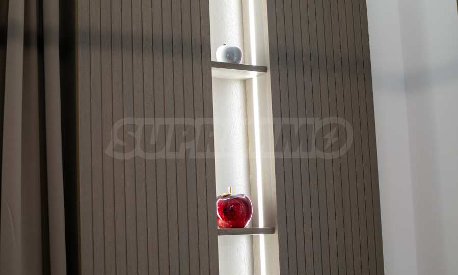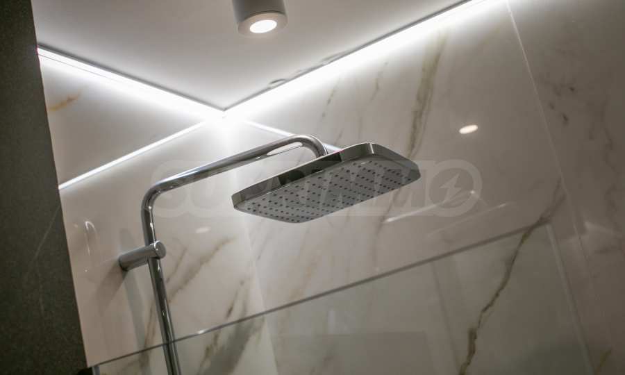 Довършителните материали са от най-висок клас: широкоформатни керамични плочи LAMINAM в баните, коридора и върху кухненските плотове, а душ системите Grohe осигуряват лукс и комфорт.