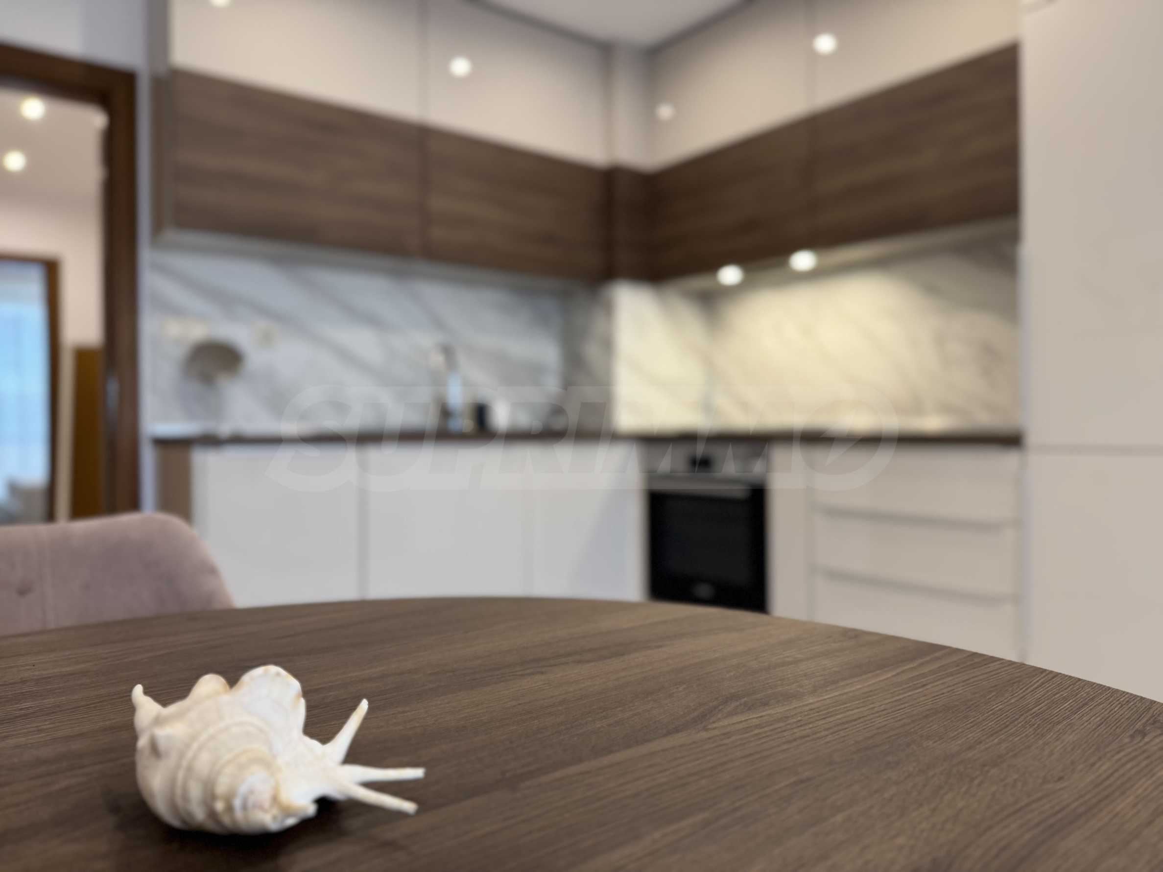 Апартаментът е напълно обзаведен и оборудван с всичко необходимо за живеене като нови мебели и ел. уреди. С внимание към всеки детайл се отличава със съвременен дизайн и внимание към функционалността. Отоплението е решено с климатици.