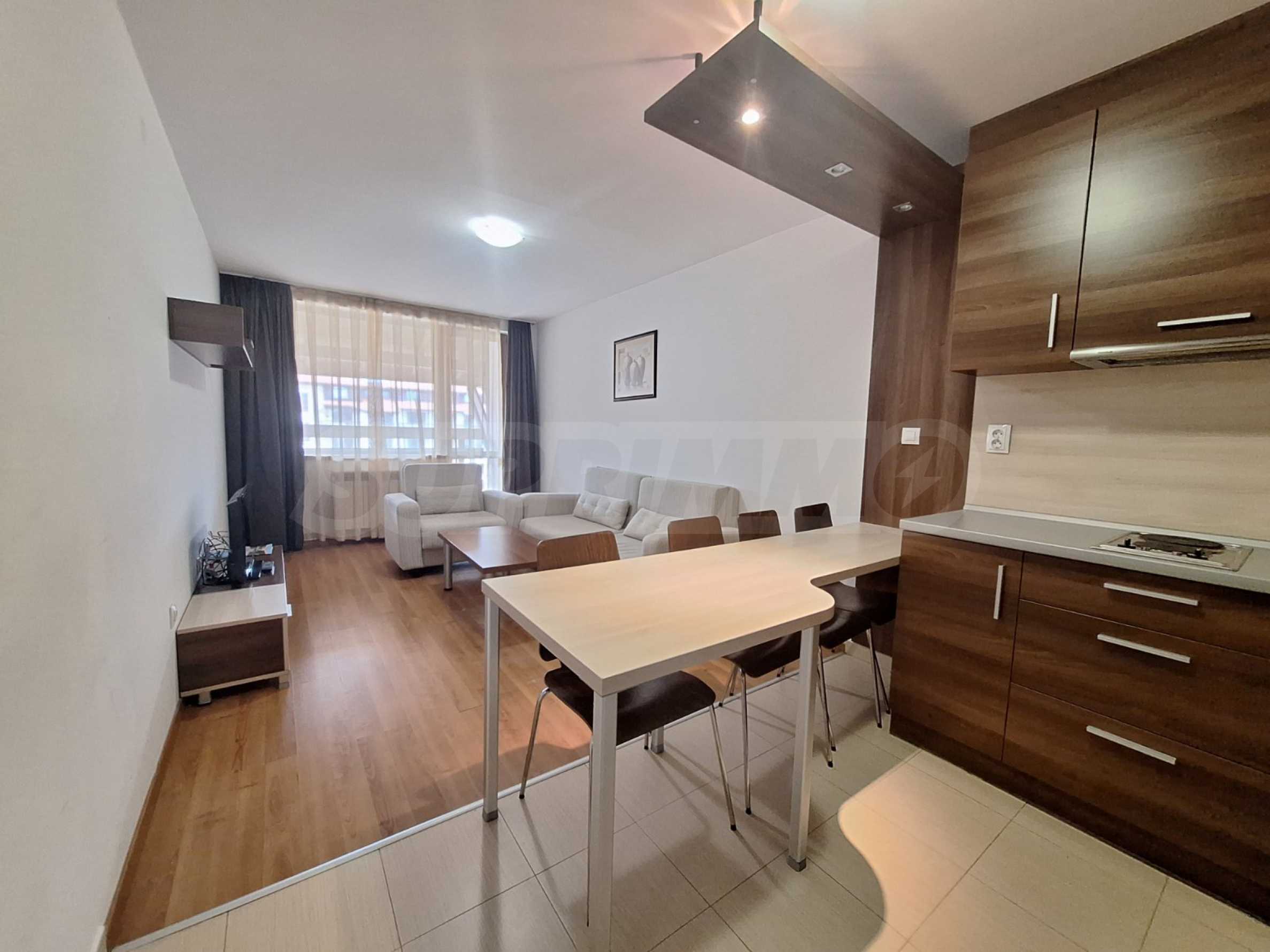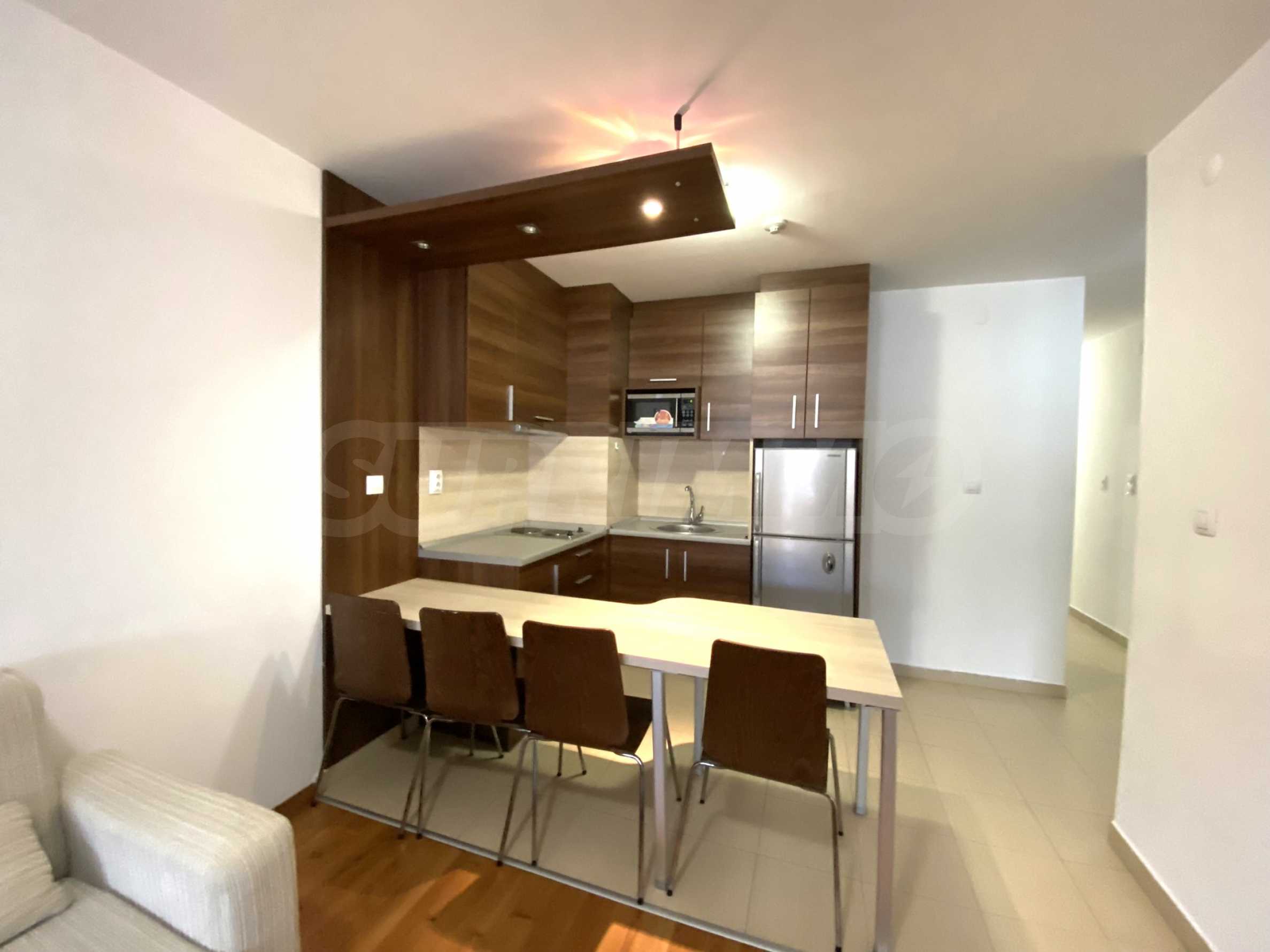 Кухня – напълно обзаведена и оборудвана с котлон (две гнезда), абсорбатор, микровълнова фурна, хладилник, бар-плот;