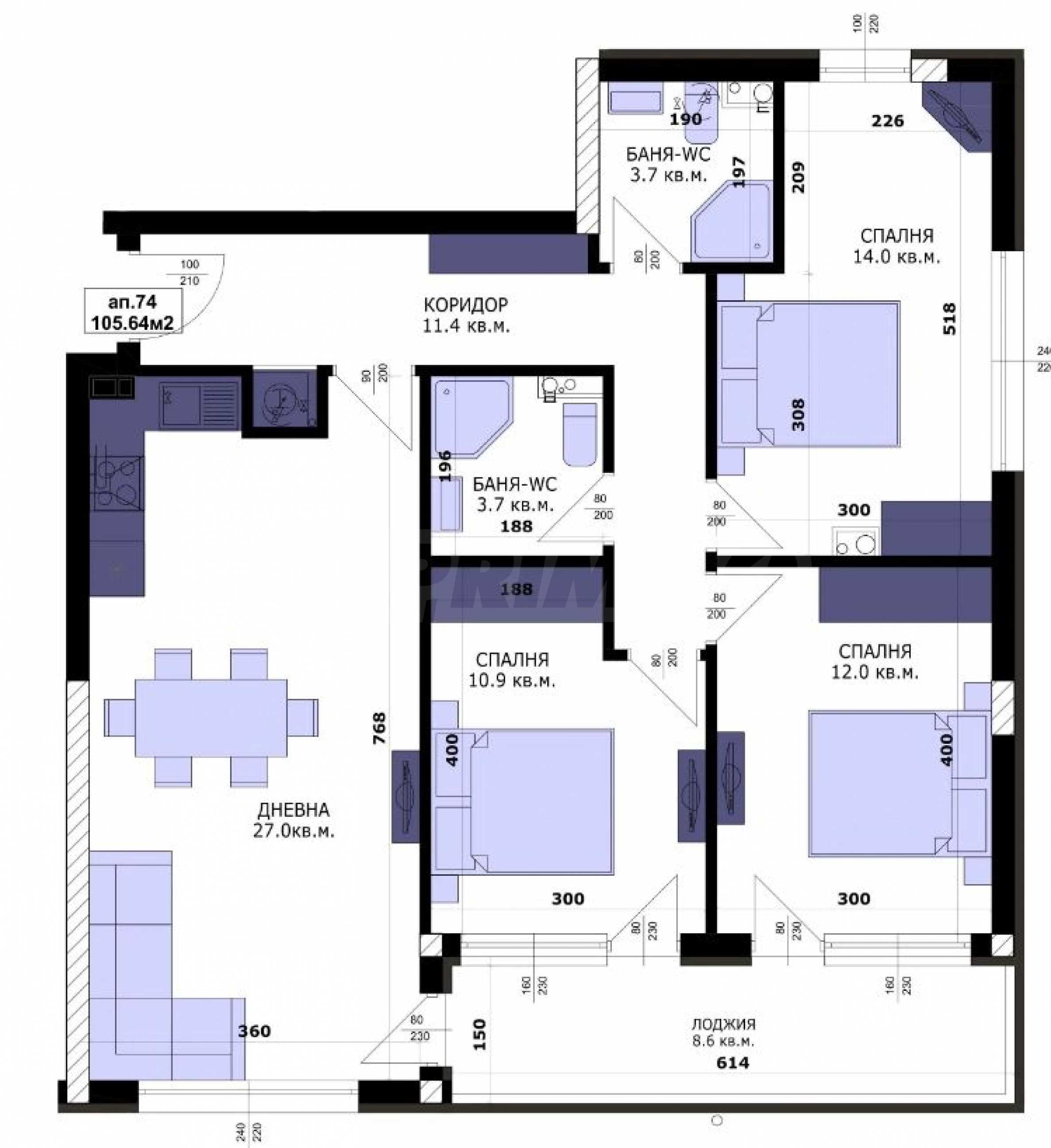 Жилището с обща площ от 119.44 кв.м е разположено на 11-и етаж от 11.