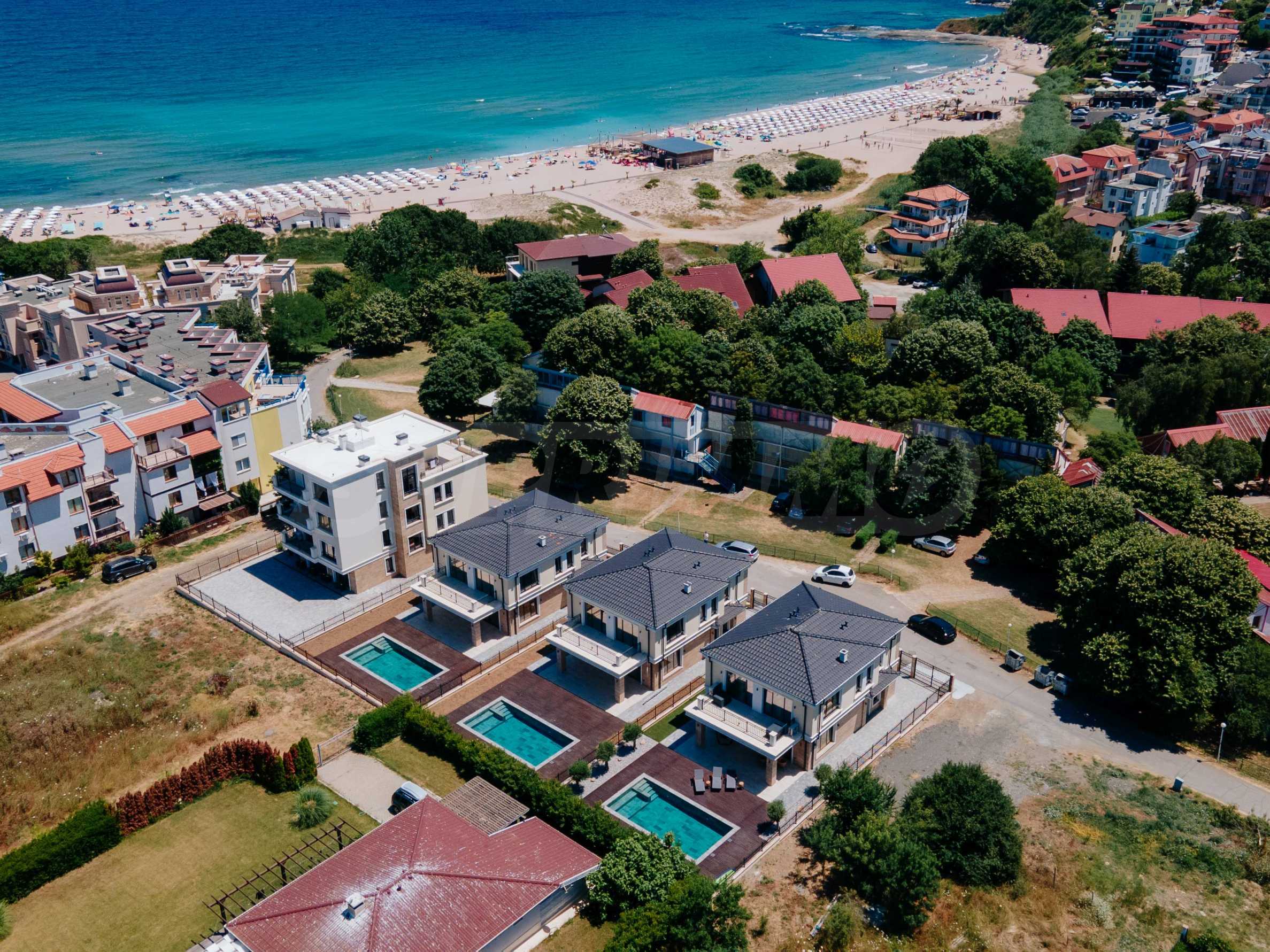 Представяме за продажба двуетажна къща с елегантна визия, собствен двор и басейн, на 100 метра от Централния плаж на курорта Лозенец.