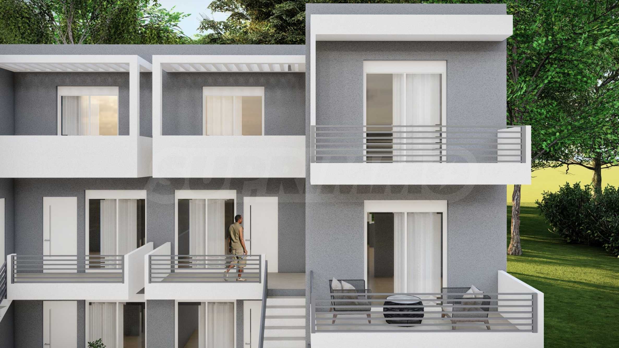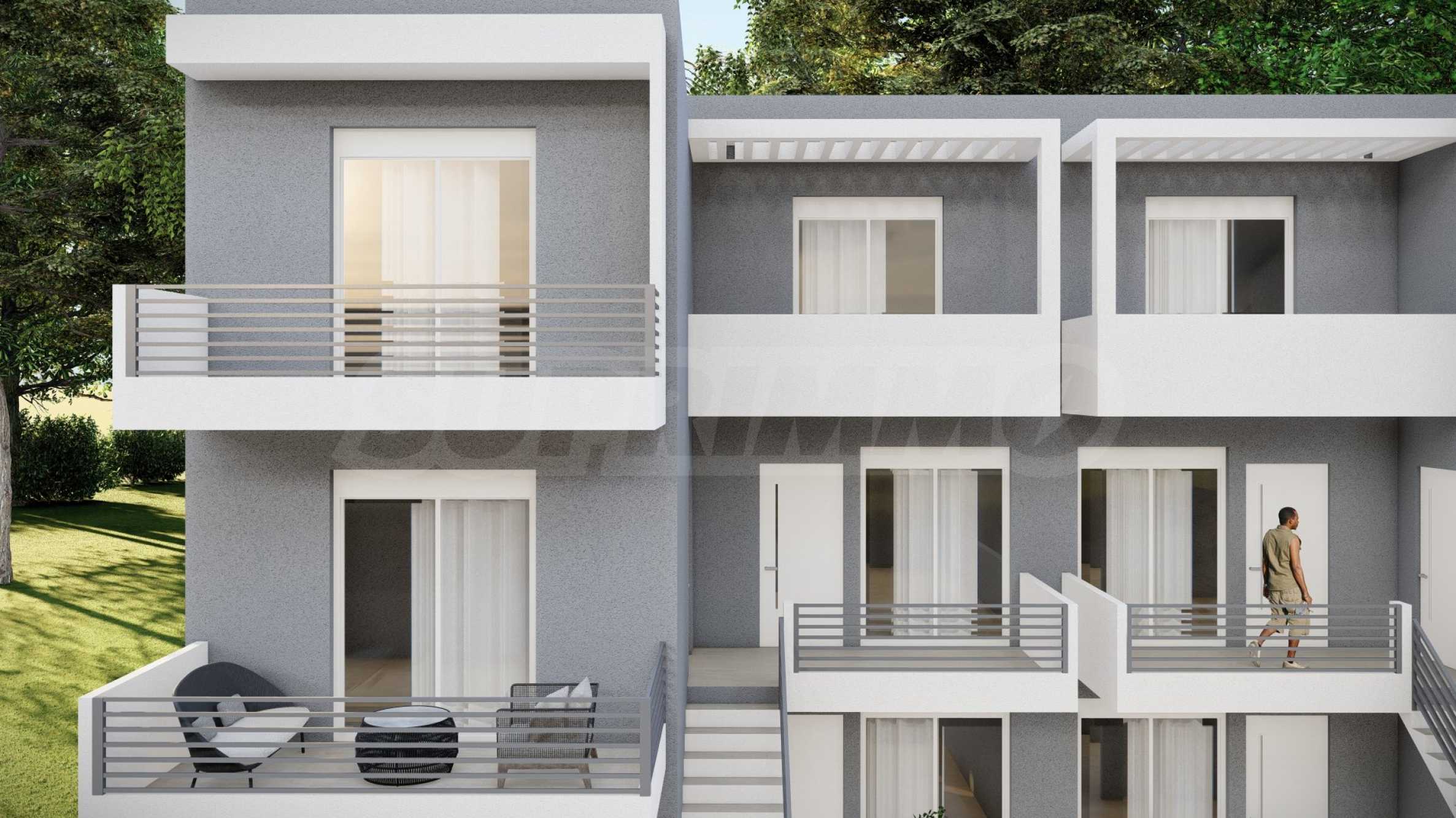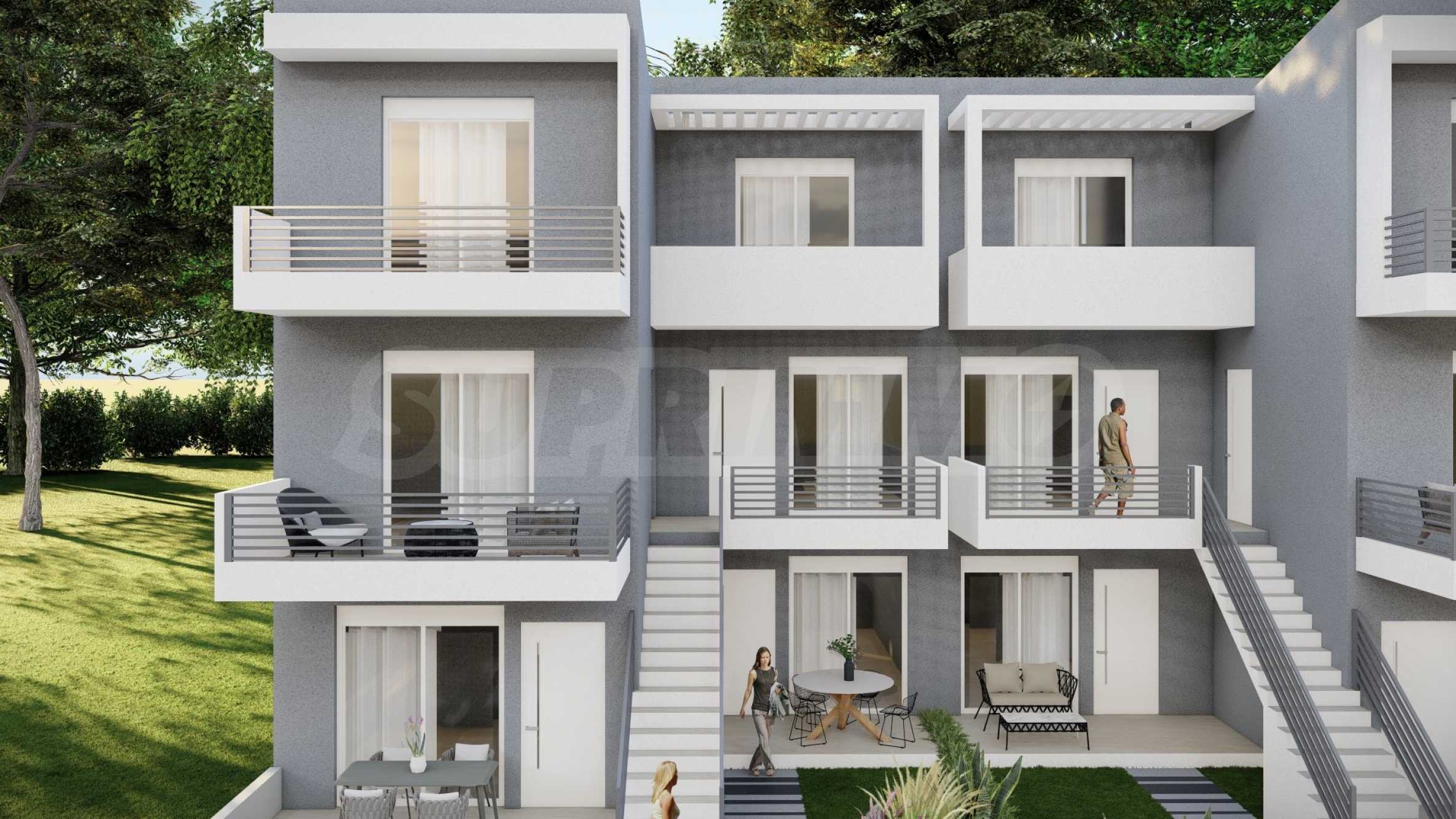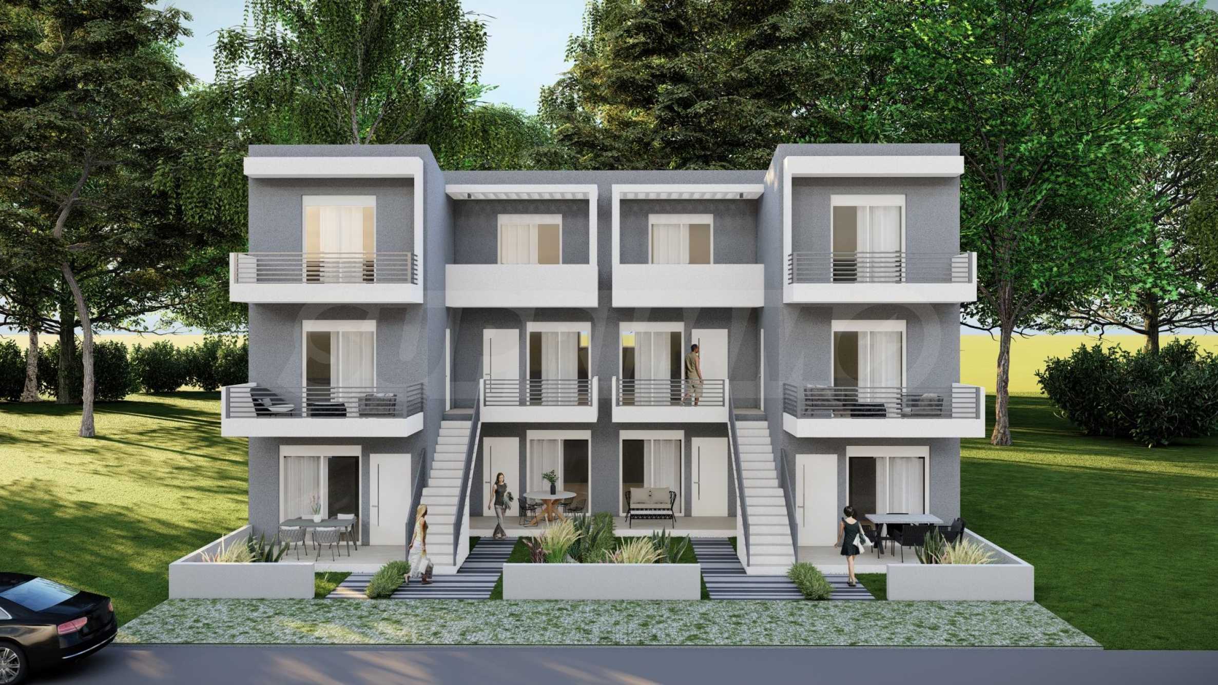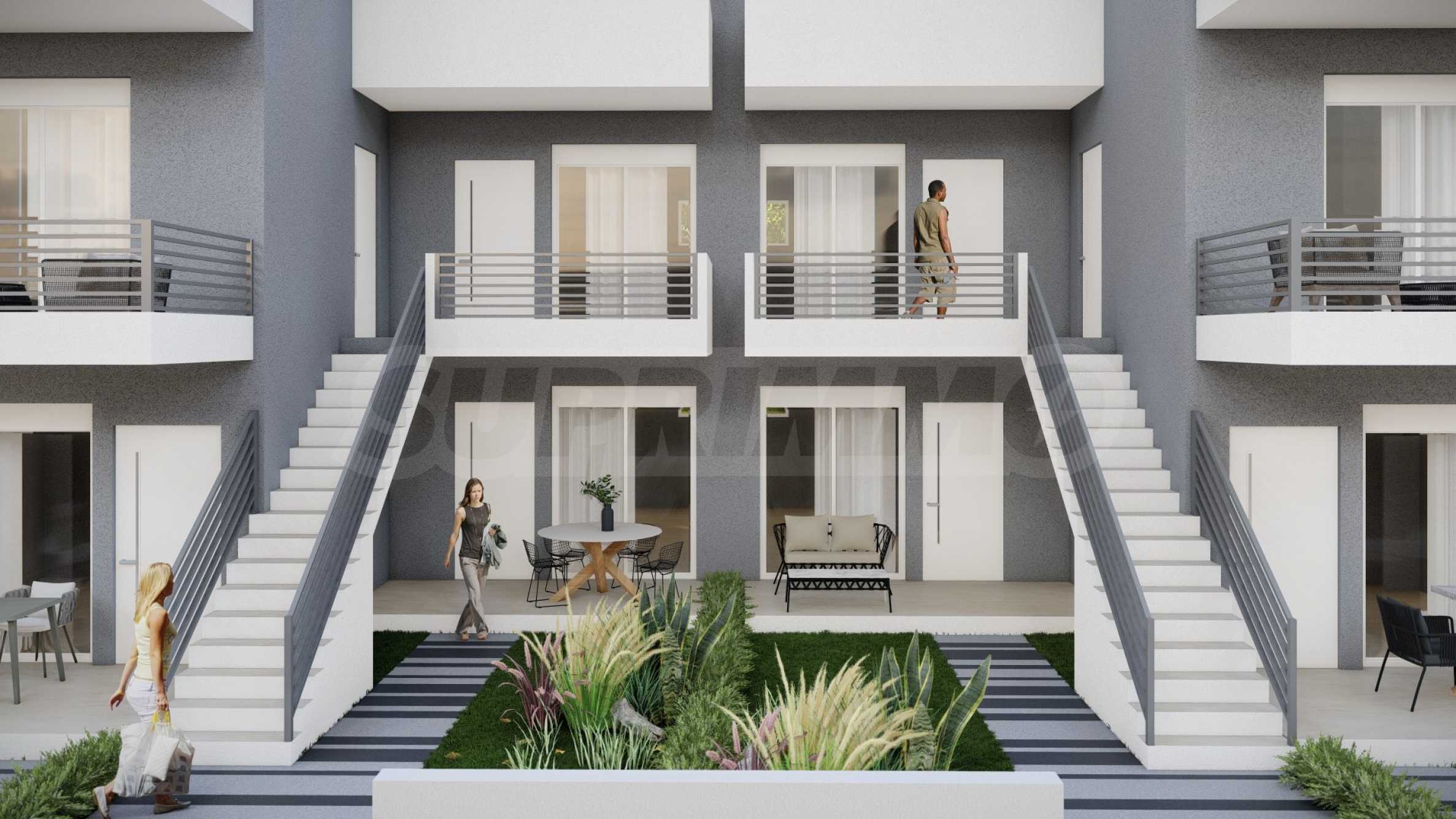 Апартаментите са с площ от 49.79 кв.м до 56.05 кв.м и са разположени на 2-ри и 3-ти етаж на сградата, като до тях се достига чрез удобни външни стълбища, които спестяват пространство и елиминират необходимостта от общи части. Разпределението включва хол с кухня, спалня, баня с тоалетна и тераса на първо ниво и спалня с баня и тераса на второ ниво. Всички апартаменти се издават завършени "до ключ", с поставени входни и интериорни врати, подови настилки, PVC дограма, кухненски шкафове и оборудвана баня.
