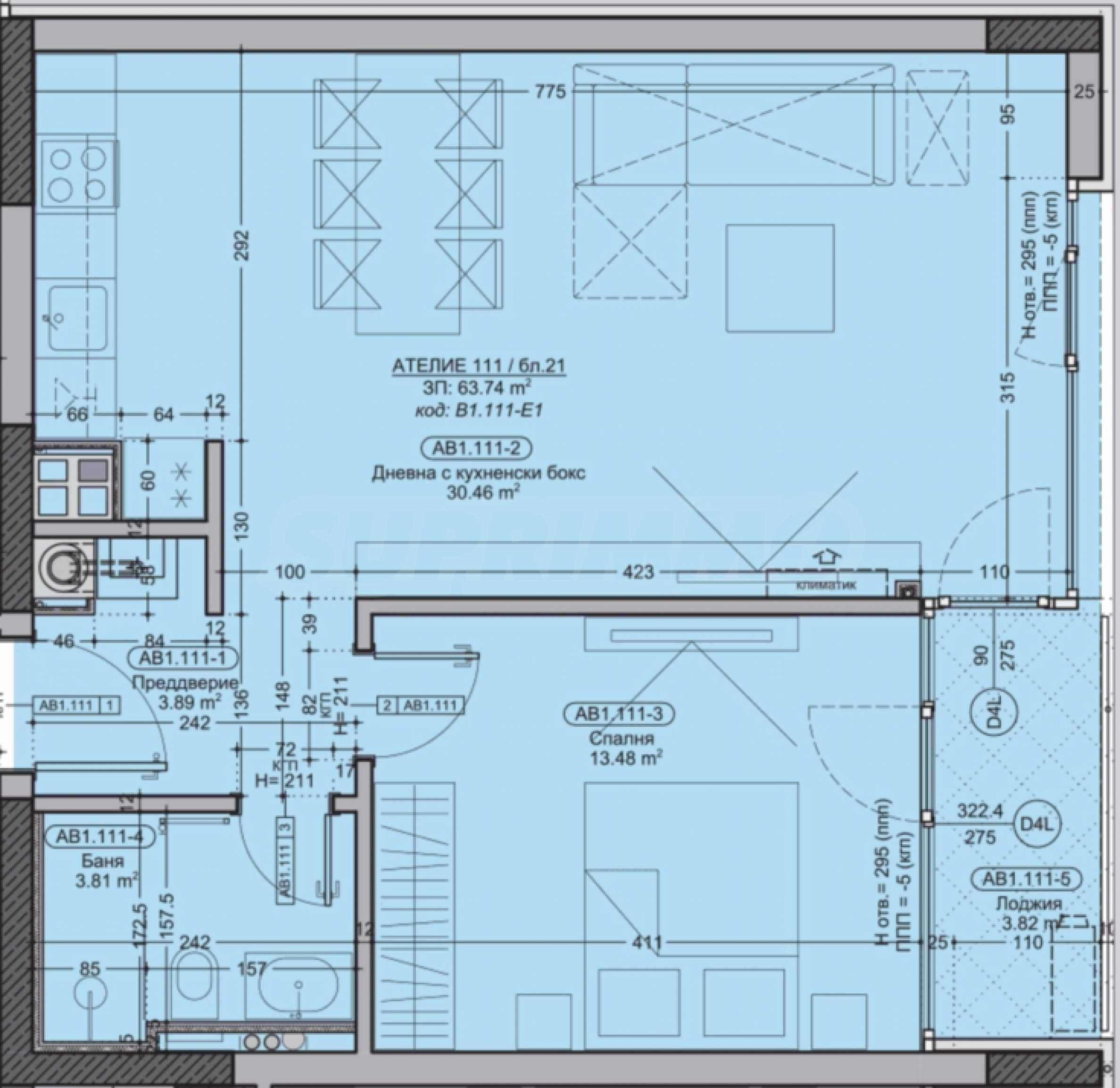 Апартаментът се намира на 1-ви етаж, с изложение север/изток и има обща площ 76.34 кв.м. Състои се от антре, баня с тоалетна, спалня, всекидневна с кухня, тераса тип лоджия, с излаз от дневната и спалнята.