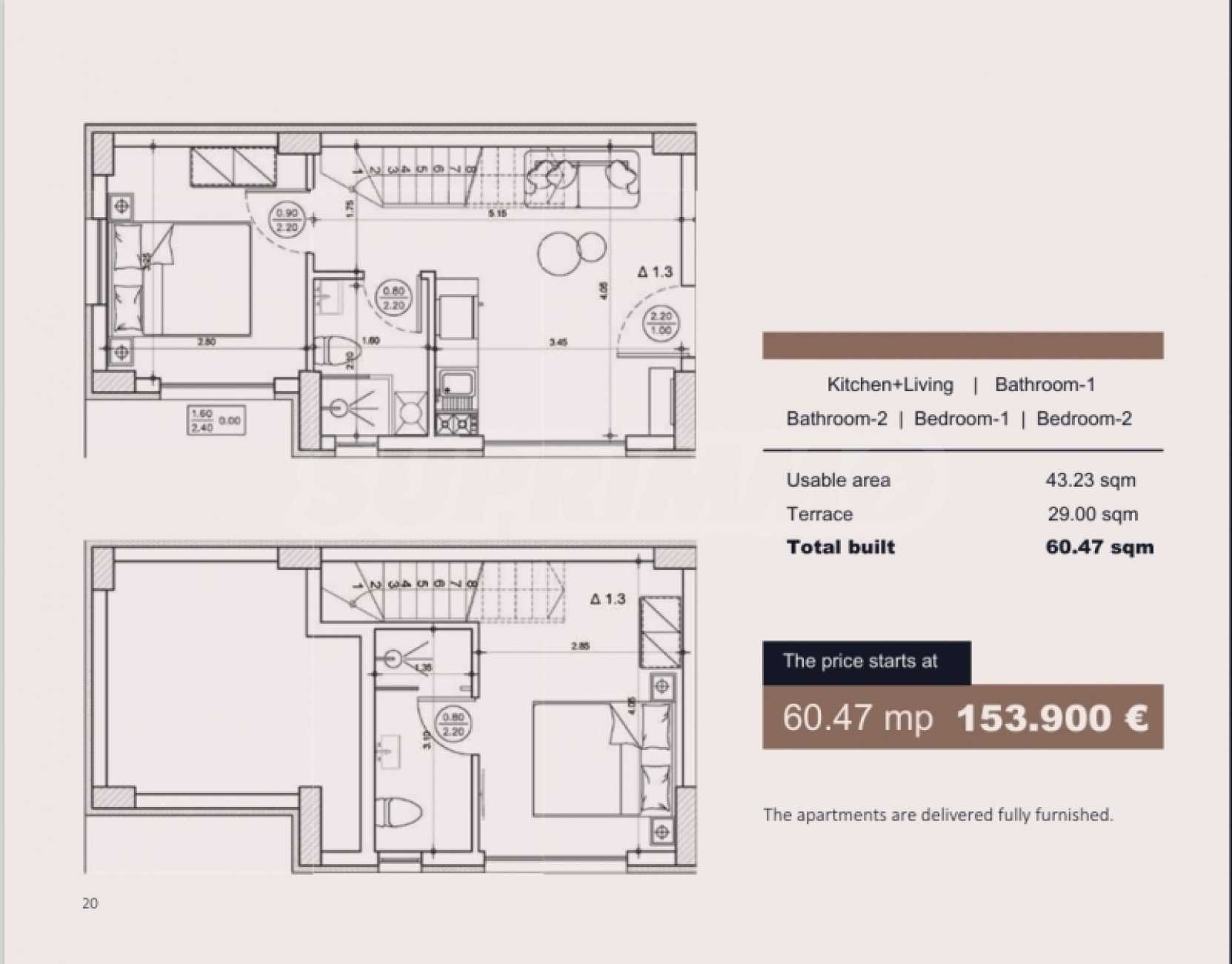кв.м. вътрешно пространство с 2 спални, 2 бани и хол/кухня