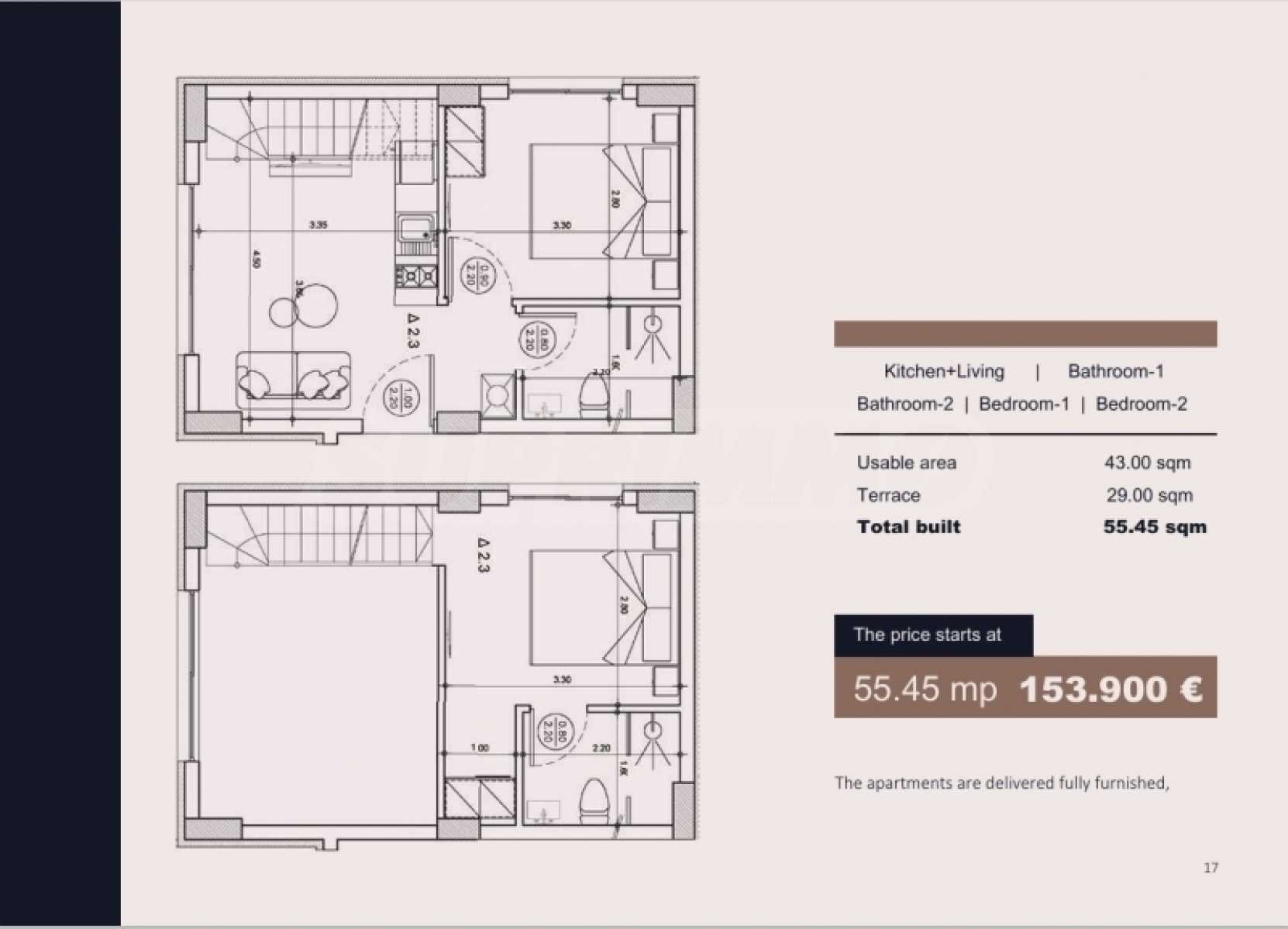 Открийте най-доброто преживяване за почивка или постоянно пребиваване в този напълно оборудван апартамент, само на 130 метра от красивия плаж на Скала Принос. Апартаментът разполага с 55,45 кв.м вътрешно пространство с 2 спални, 2 бани и всекидневна/кухня и допълнителни 29 кв.м тераса, идеални за моменти на релаксация и забавление на открито. Апартаментът ще бъде напълно оборудван с мебели и електроуреди (с изключение на легло матрак и телевизор). Намира се в изискан комплекс от 12 апартамента, предлагащ идеални условия за живеене с достъп до общ басейн, който ще ви предложи прохлада и релакс през цялото лято. Апартаментът е оборудван с всичко необходимо за комфортен и модерен живот, а местоположението му на пешеходно разстояние от магазини, ресторанти и морето го прави идеален за плаж и спокойствие влюбени. Апартаментът ще бъде предаден в началото на ЮНИ 2025 г. За да видите имота е необходимо да представите лична карта.