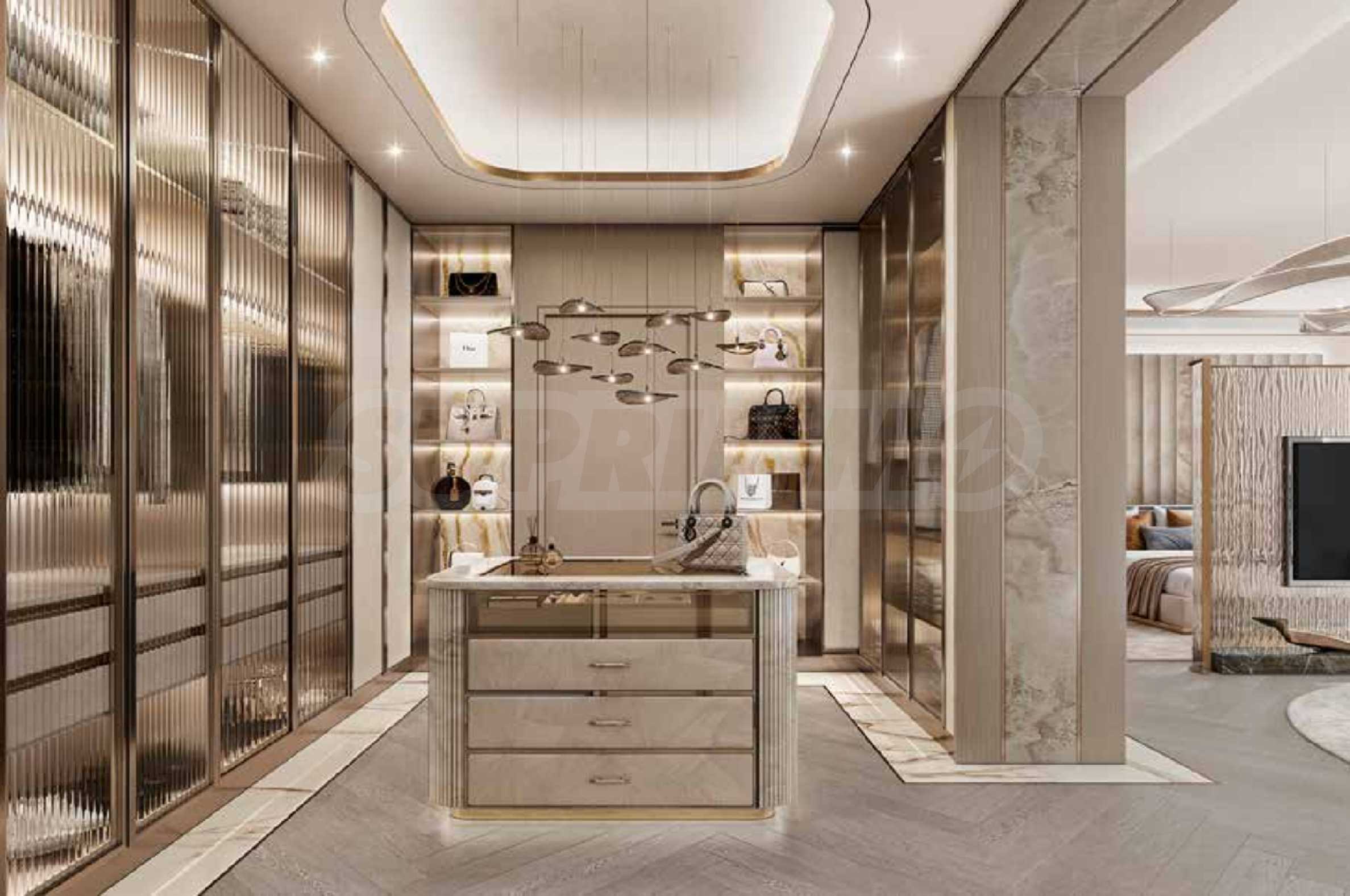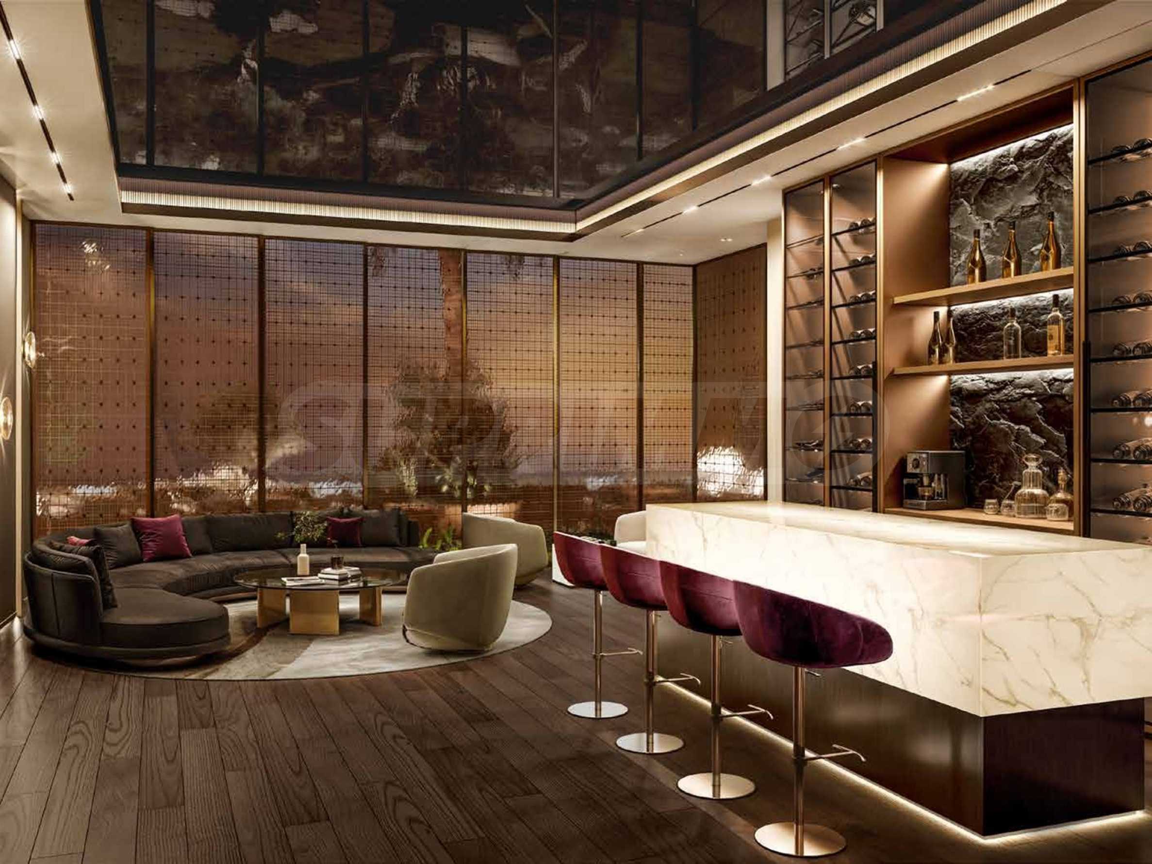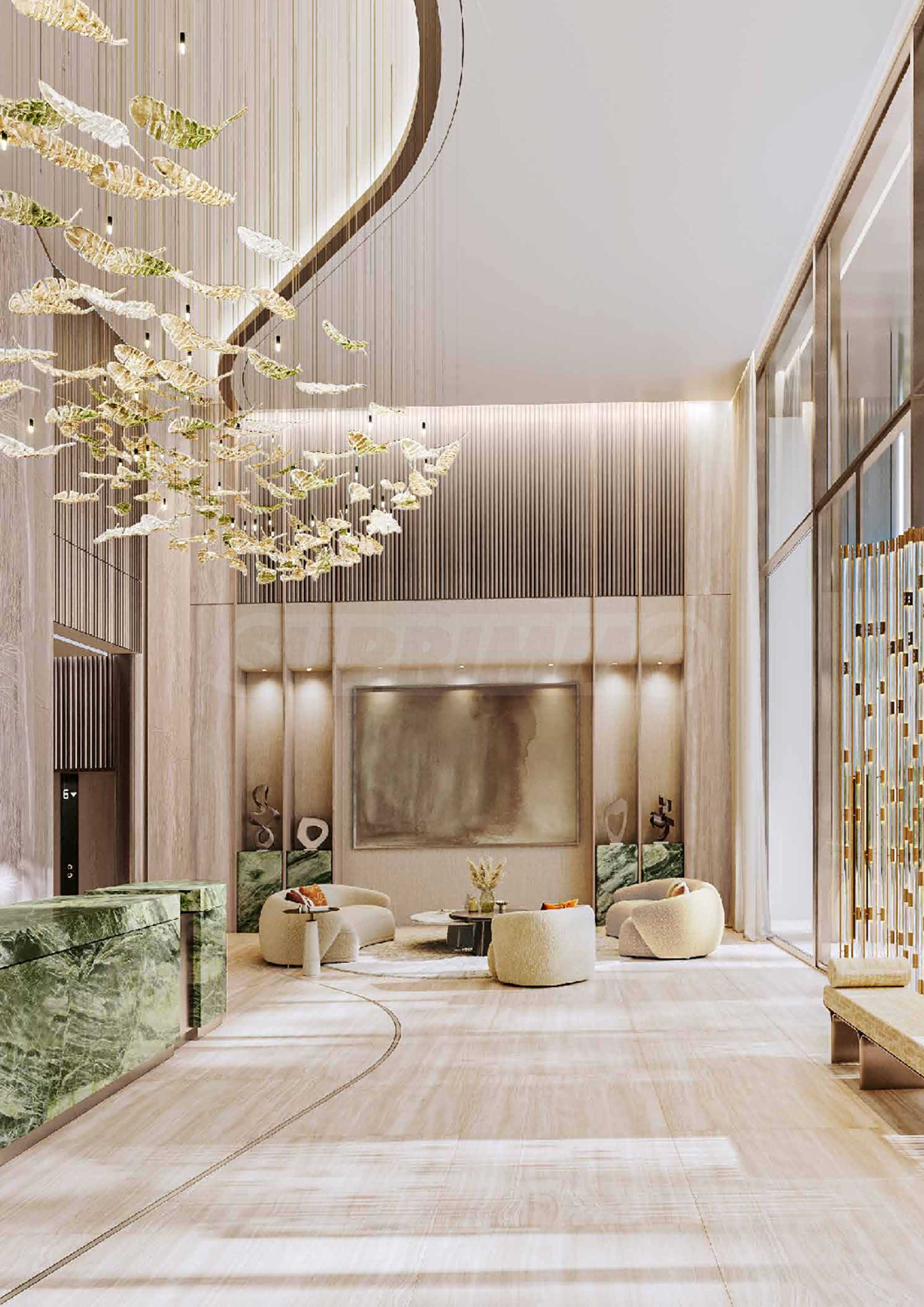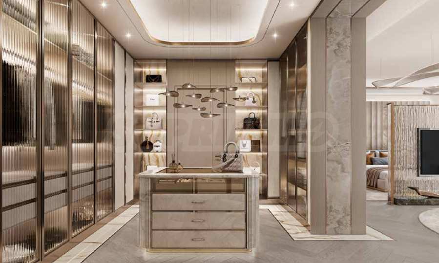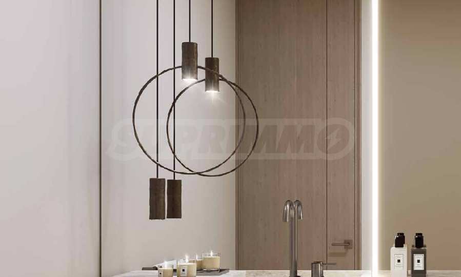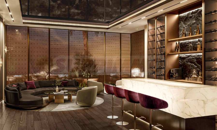 Интериорният дизайн е израз на безкомпромисна елегантност – естествени материали като дърво, камък и мрамор се преплитат с фини и изтънчени детайли, създавайки атмосфера на стил и уют. Жилищата се предлагат с напълно завършени бани и кухни, оборудвани с висок клас санитария и електроуреди.