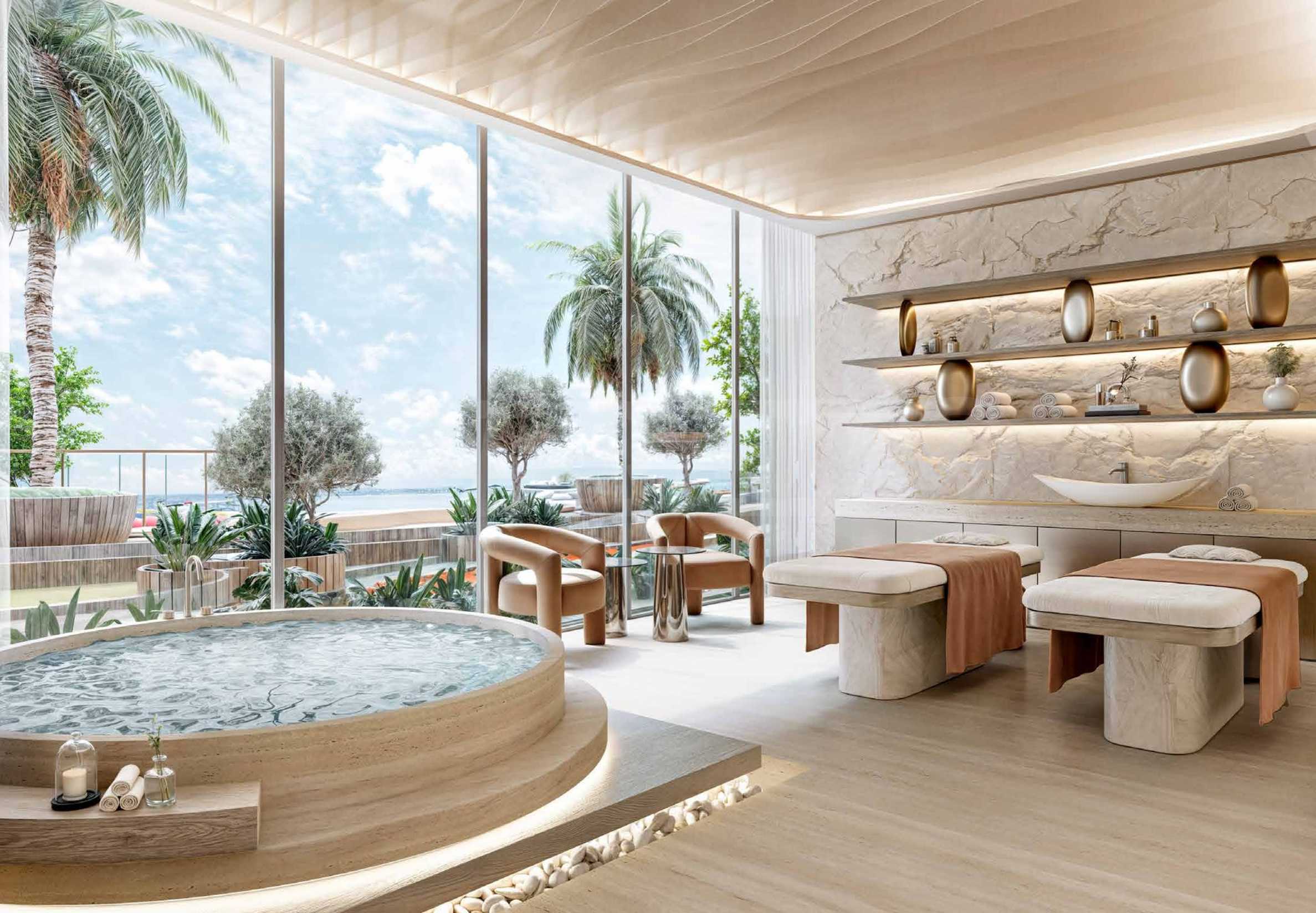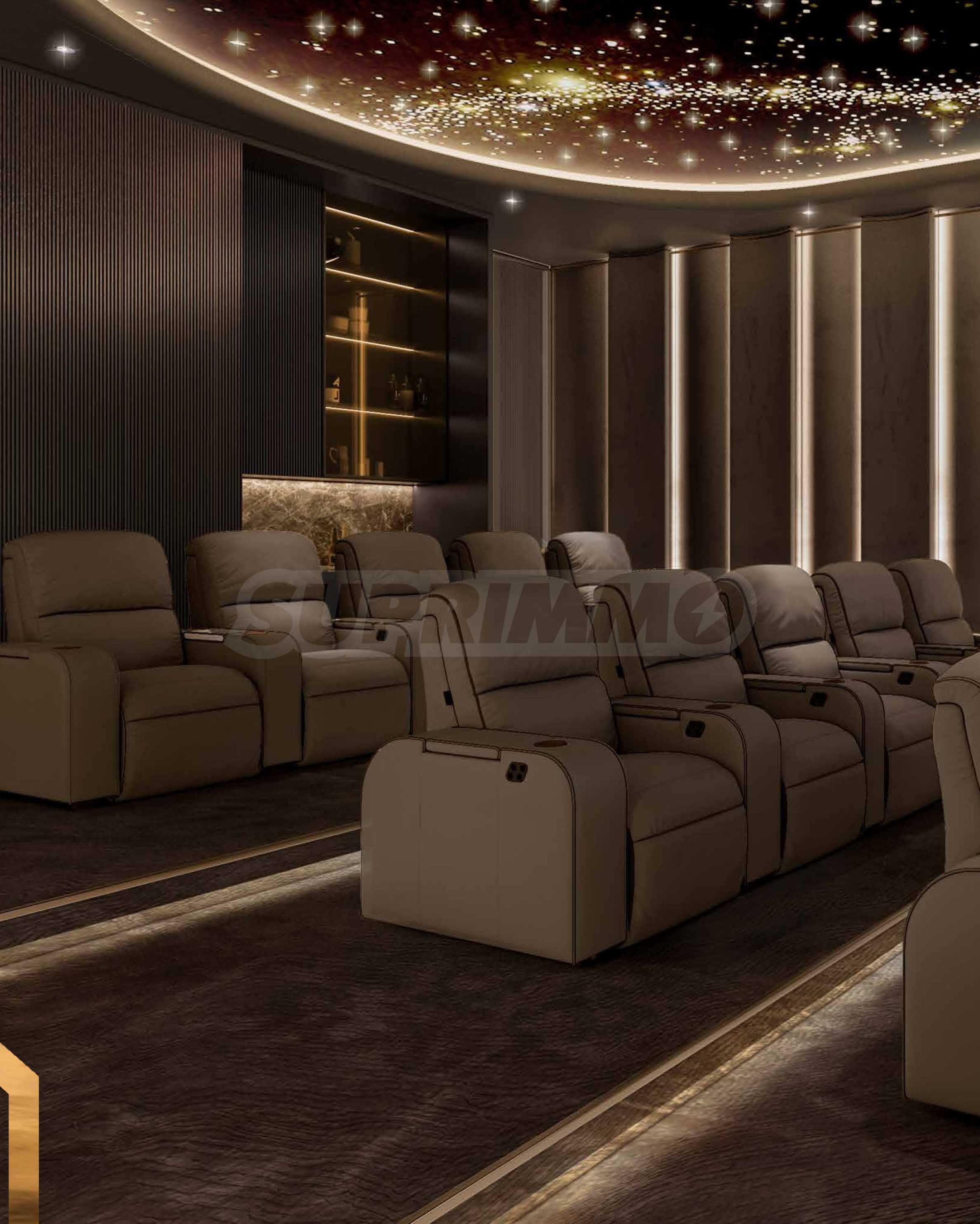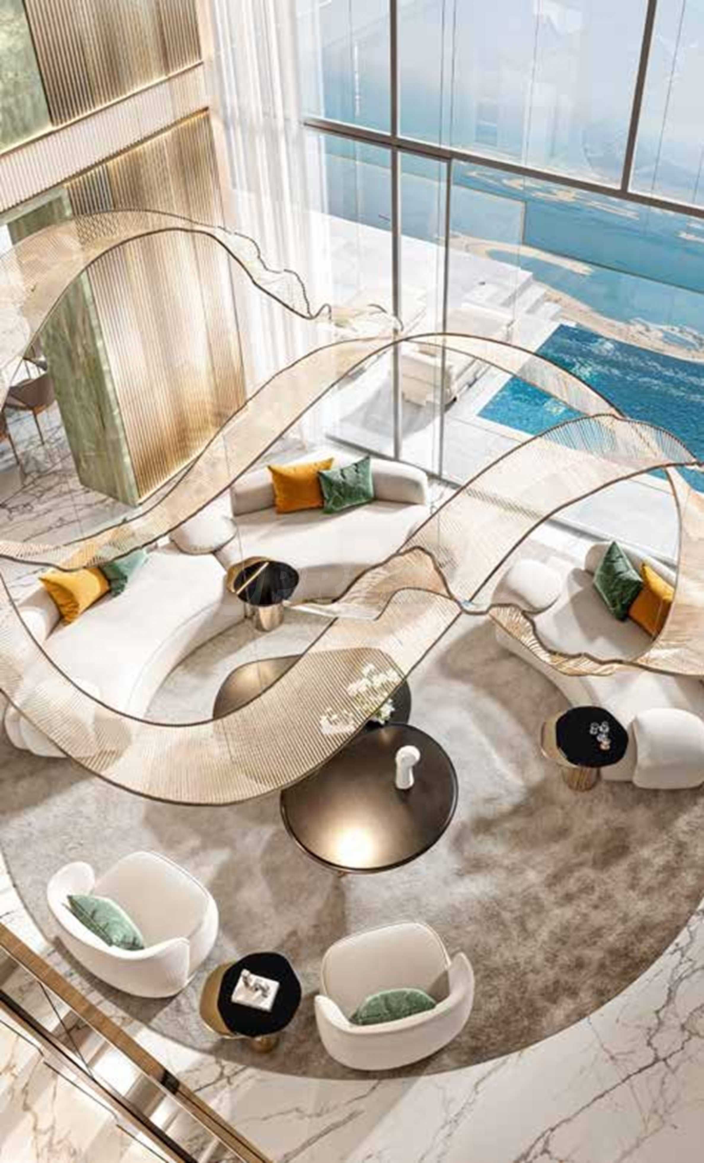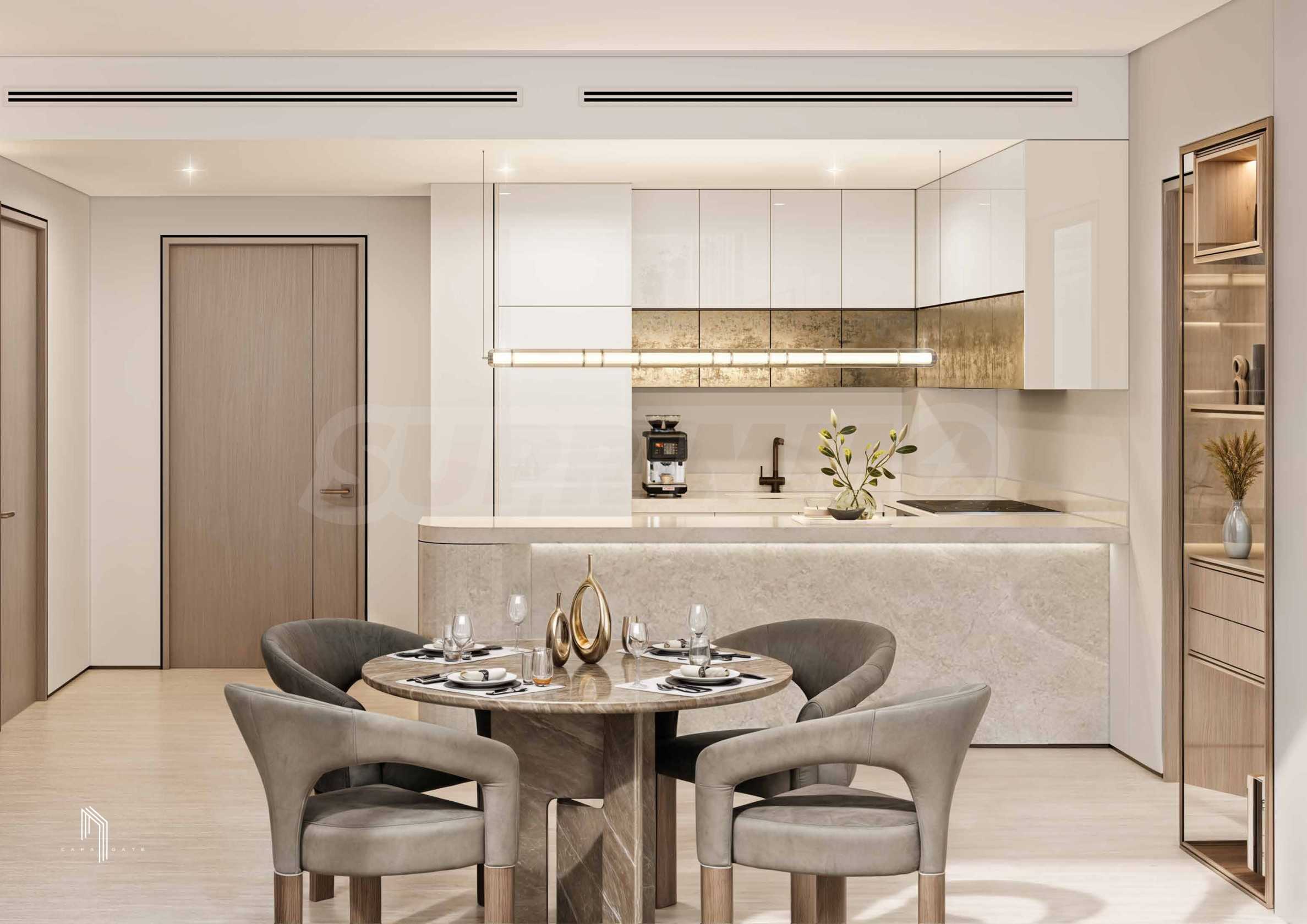 Интериорният дизайн е израз на безкомпромисна елегантност – естествени материали като дърво, камък и мрамор се преплитат с фини и изтънчени детайли, създавайки атмосфера на стил и уют. Жилищата се предлагат с напълно завършени бани и кухни, оборудвани с висок клас санитария и електроуреди.