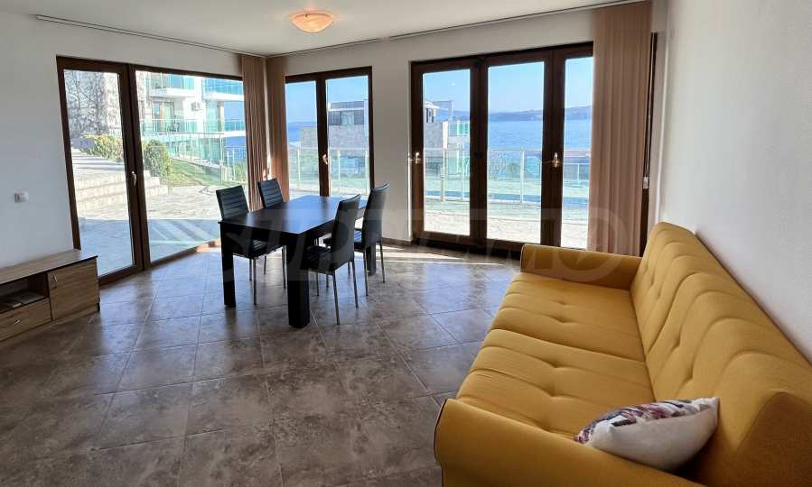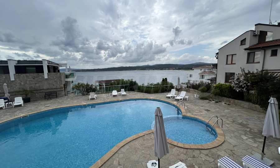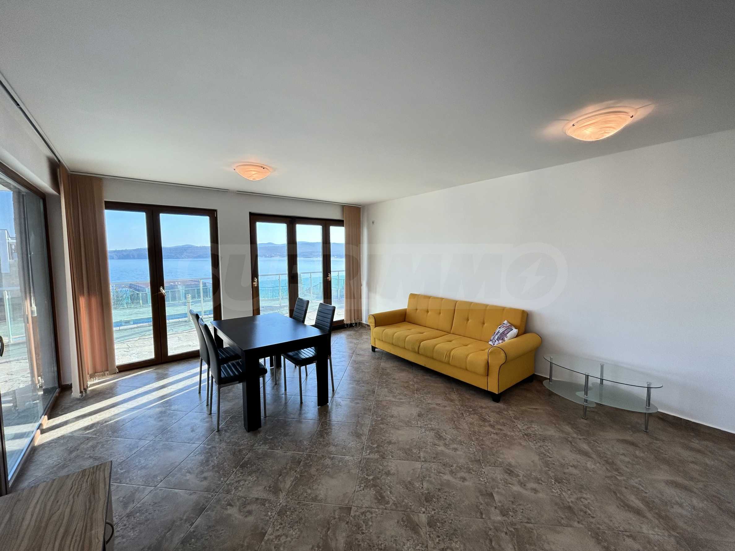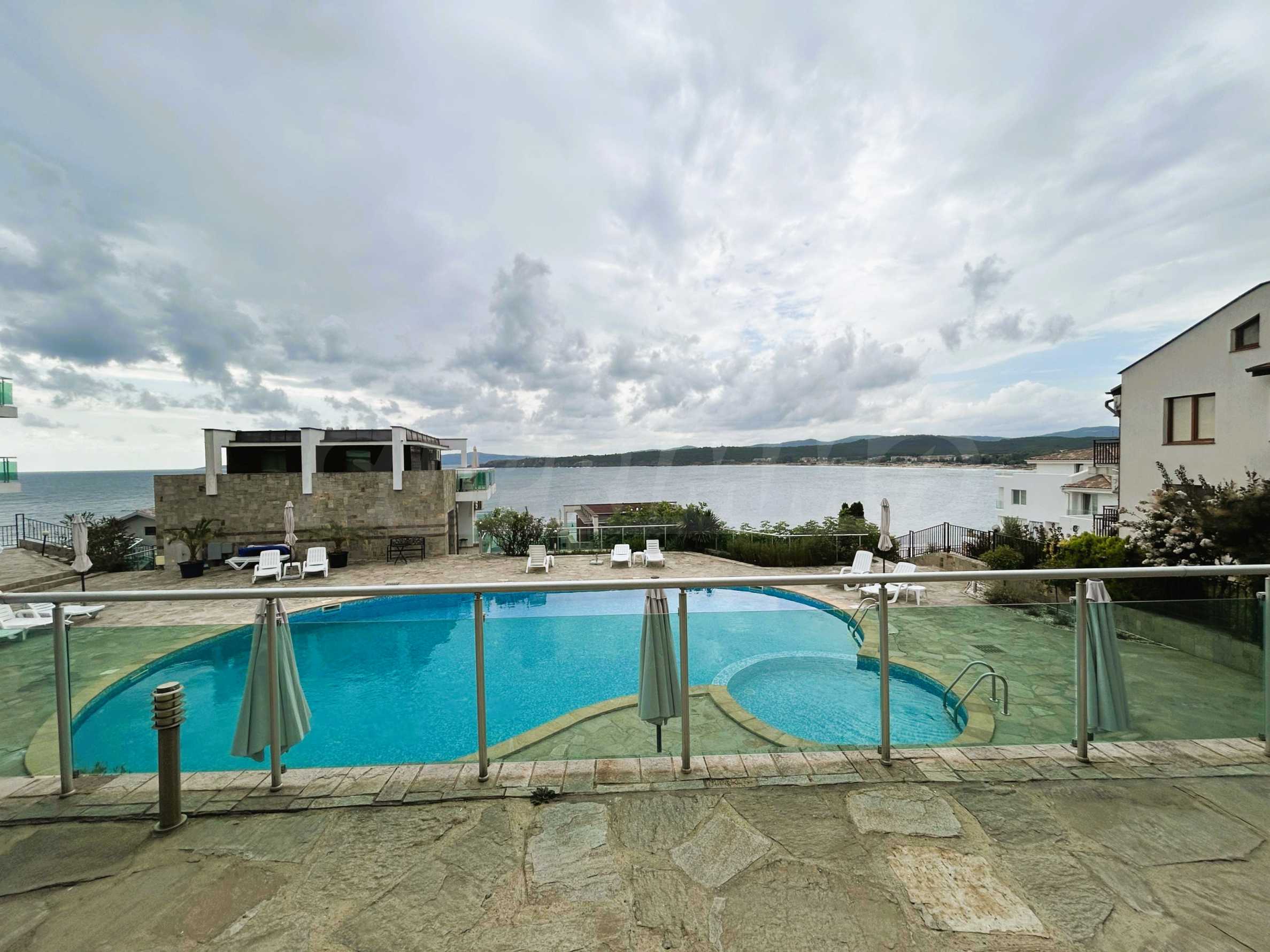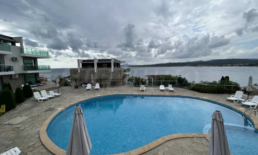 Представяме светъл и просторен двустаен апартамент с изключителна гледка към морето и басейна, разположен в луксозен затворен комплекс на първа линия в Созопол.