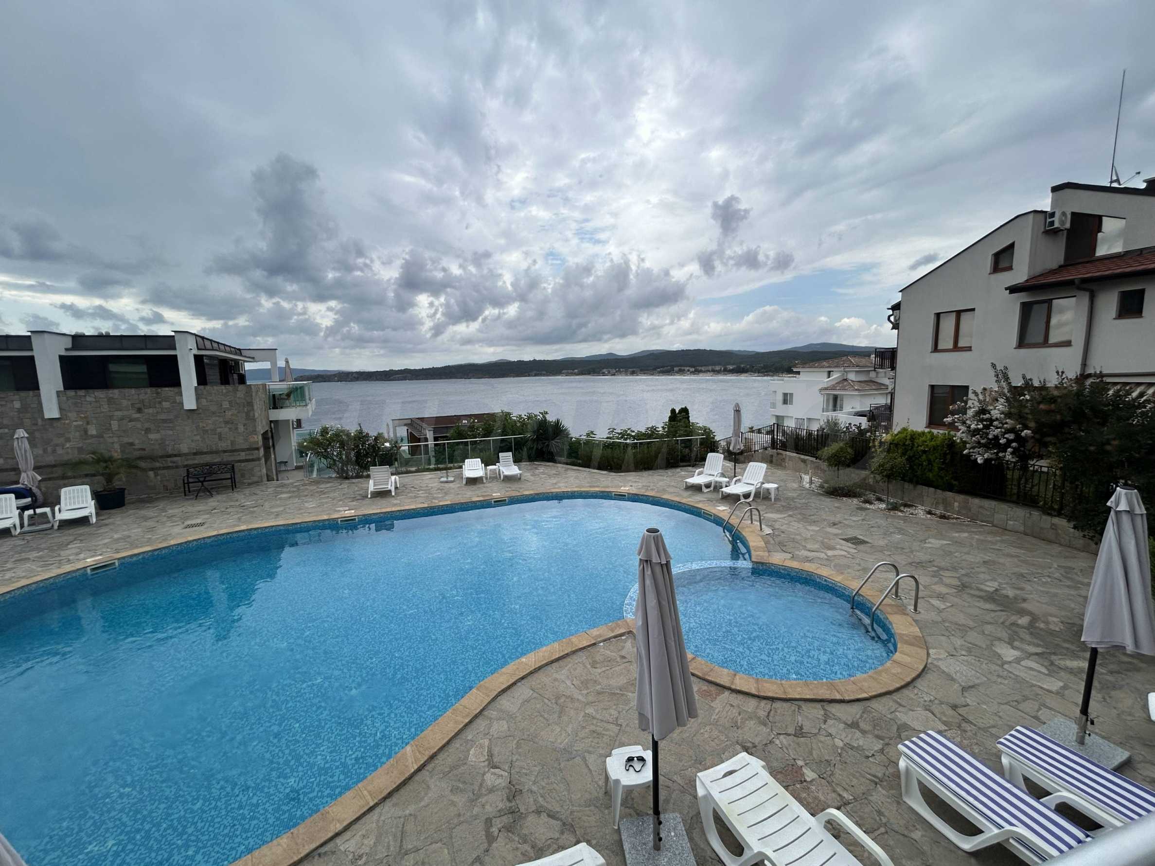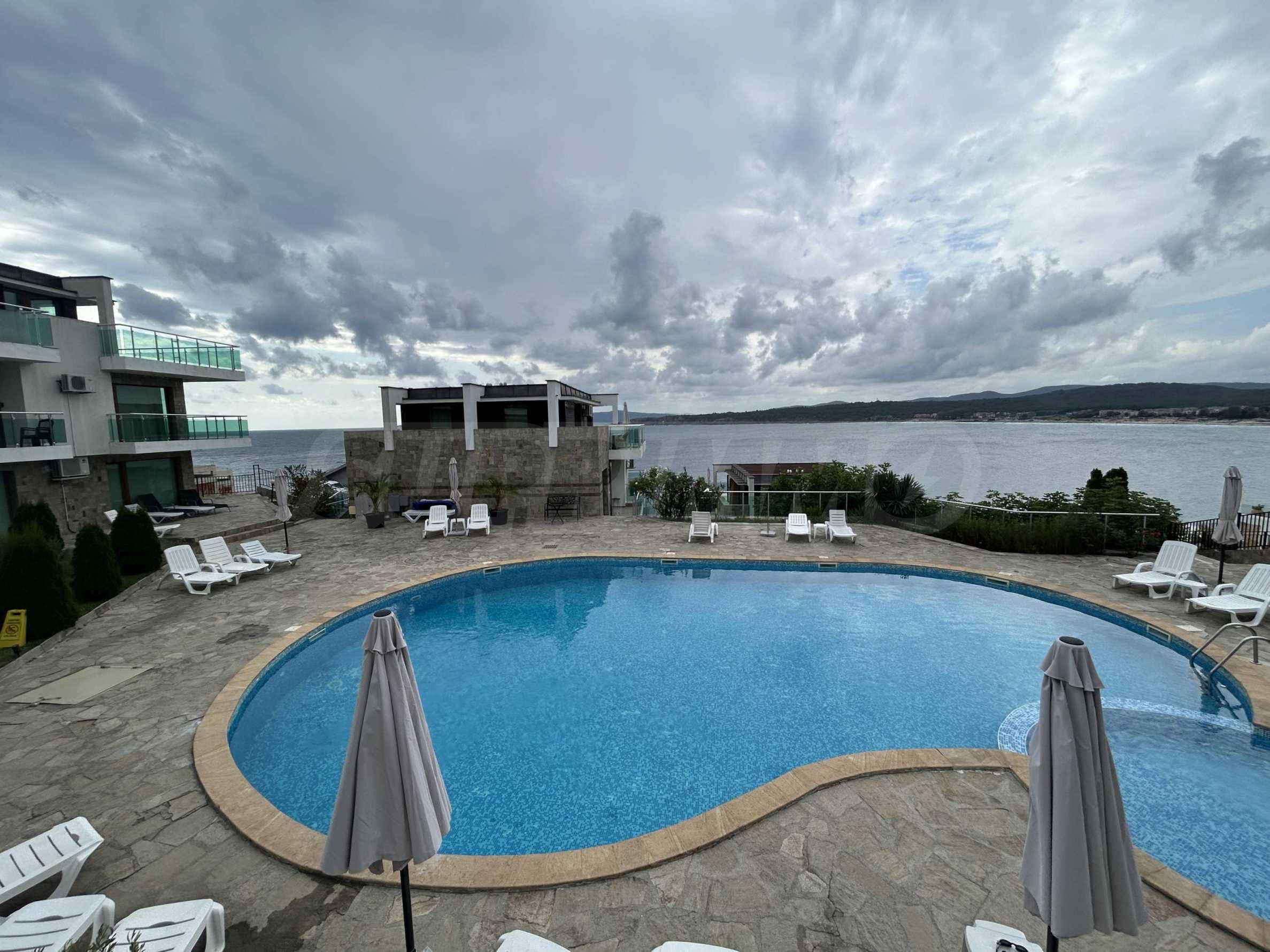 - фронтална гледка към басейна и панорамни гледки към морето от всяка стая;