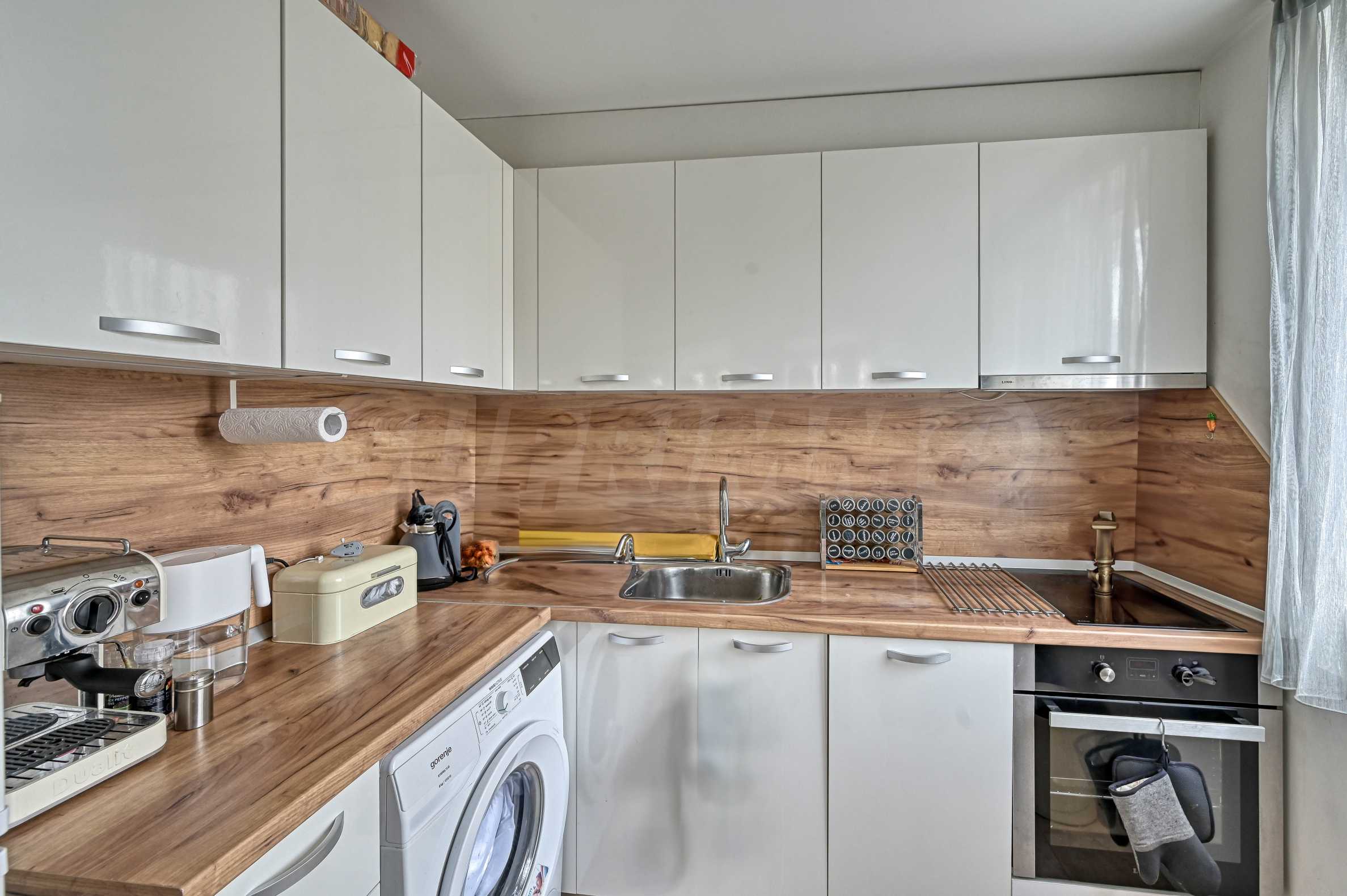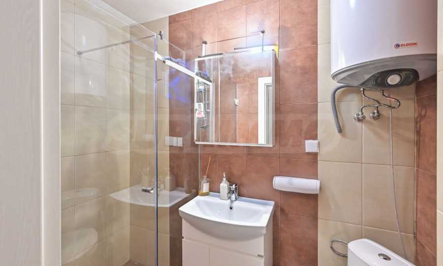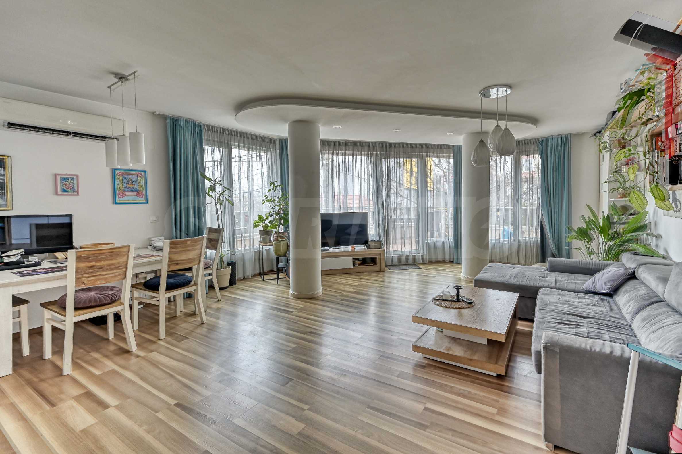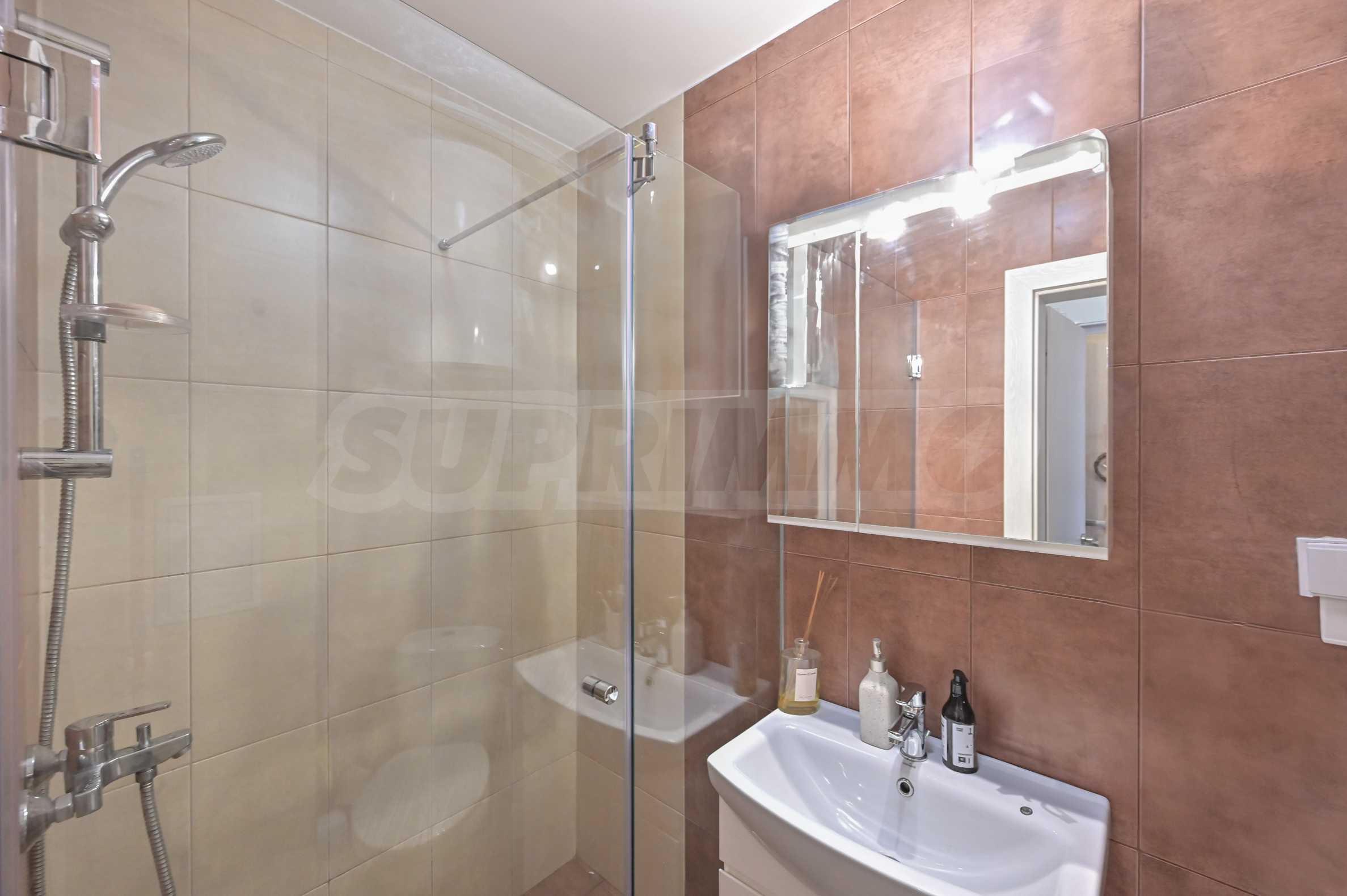 Апартамента е изпълнен по индивидуален проект с обзавеждане и оборудване. Предлага атрактивен дизайн от светли тонове, с отлично зонирано пространство и модерно устройство.