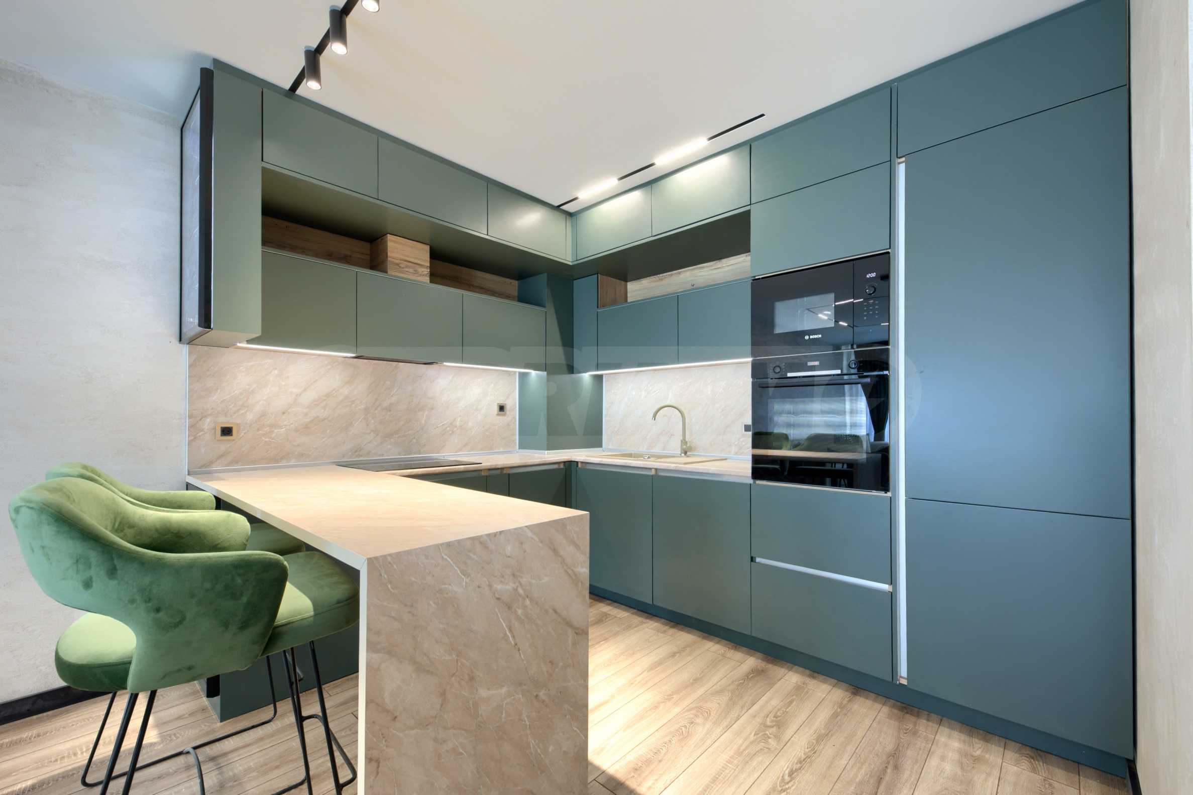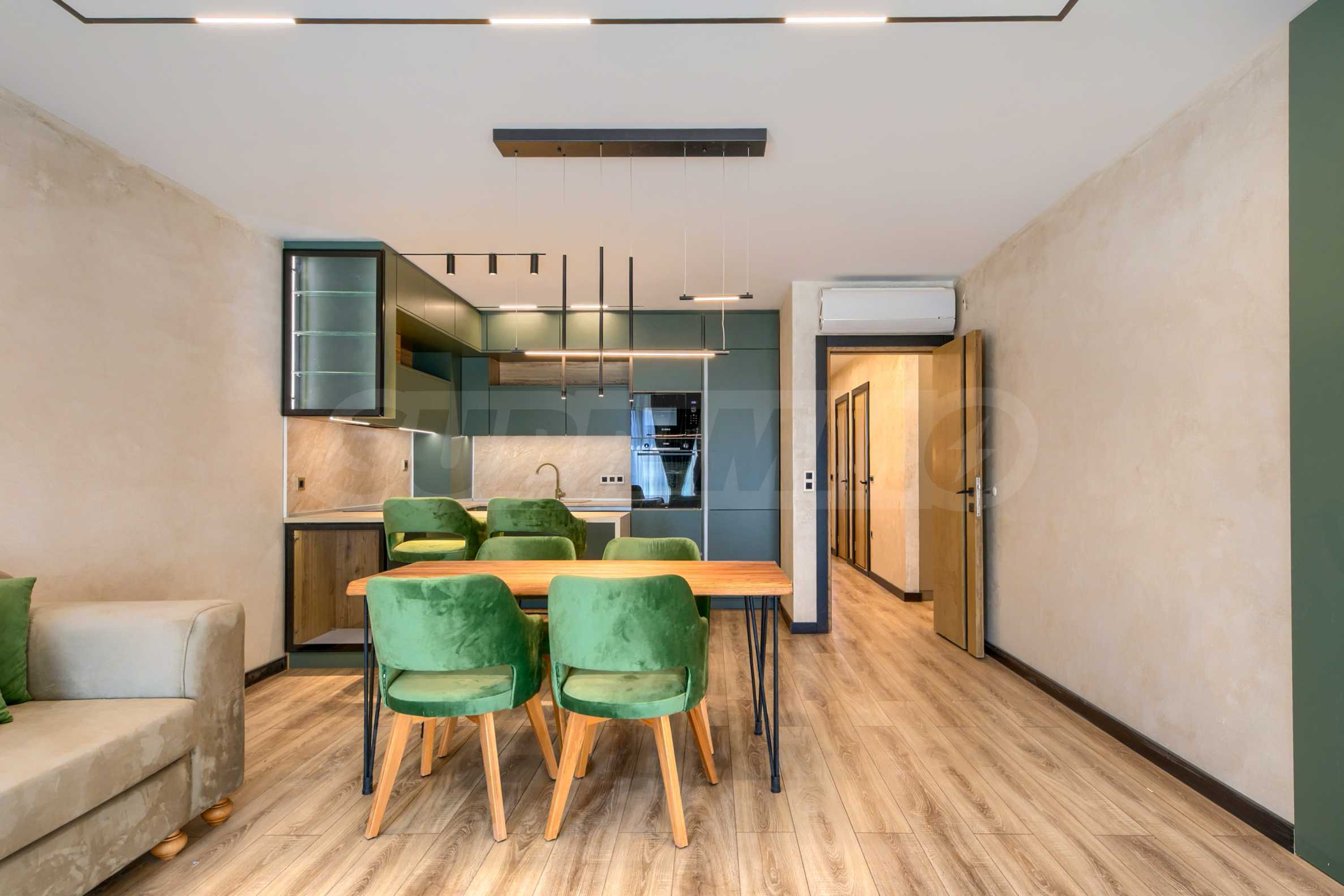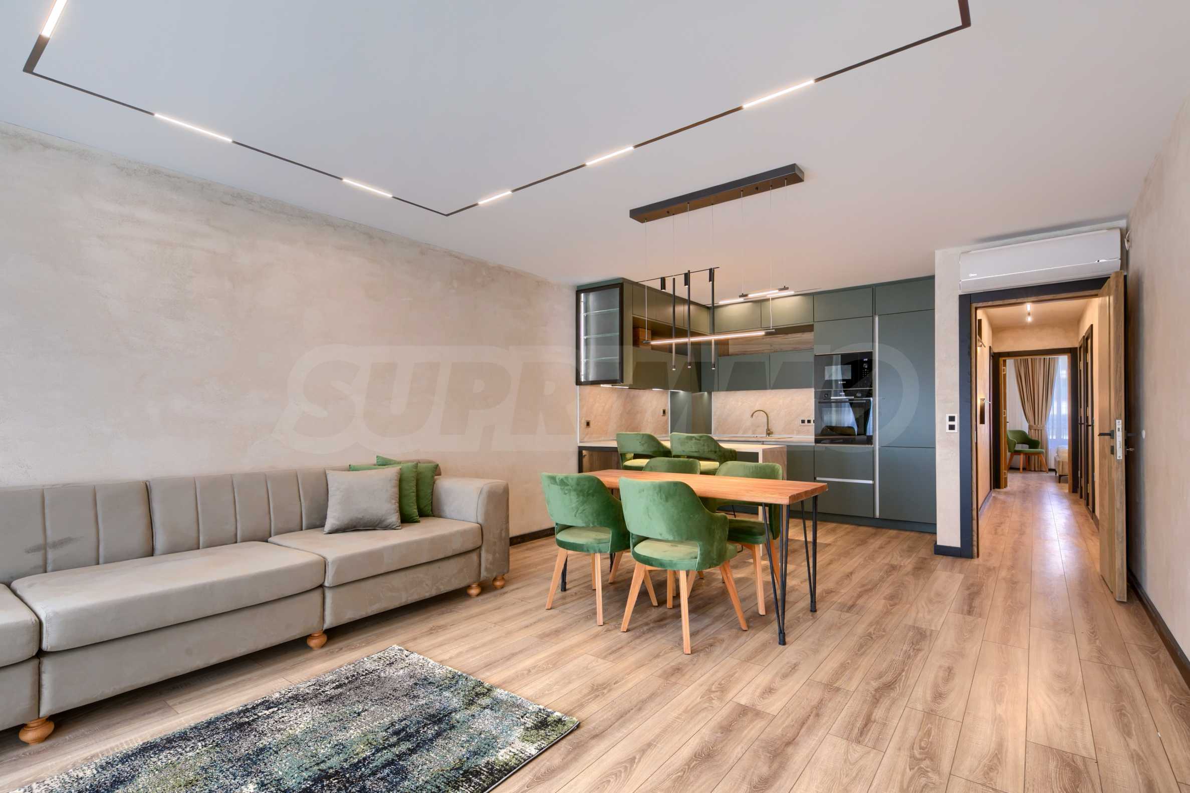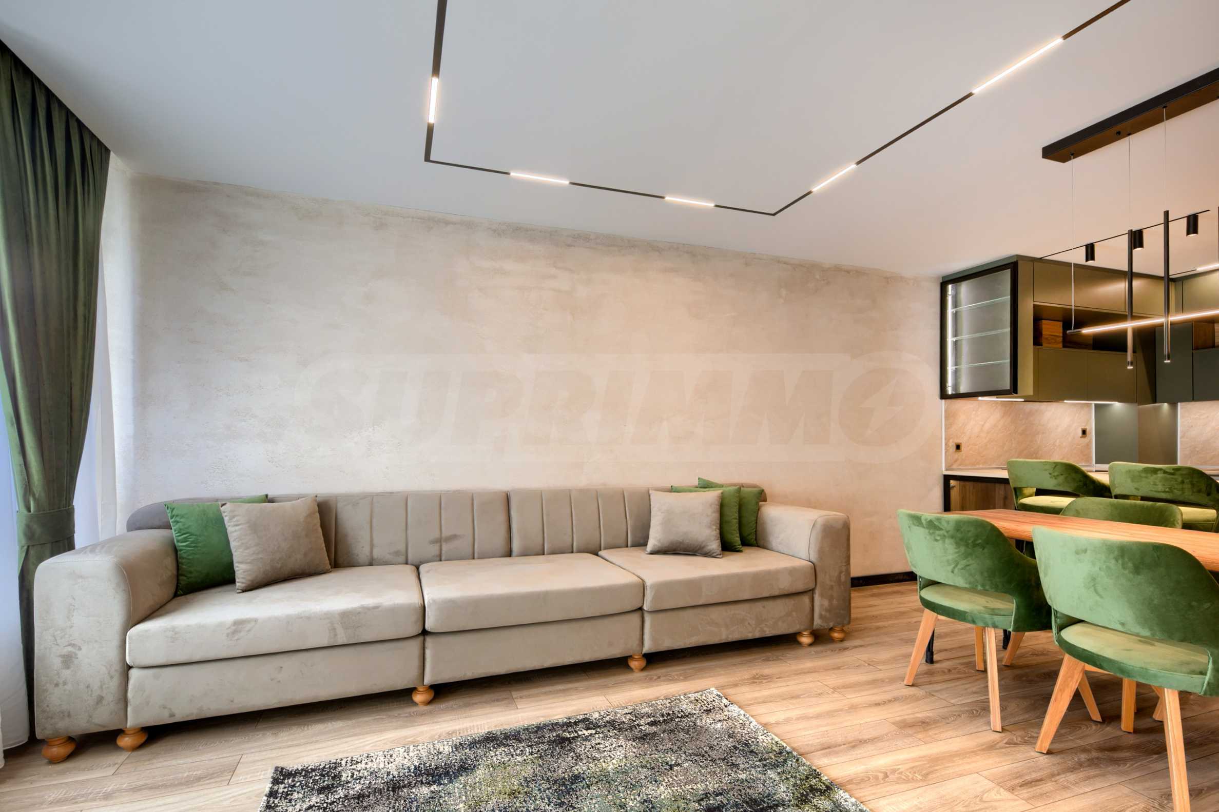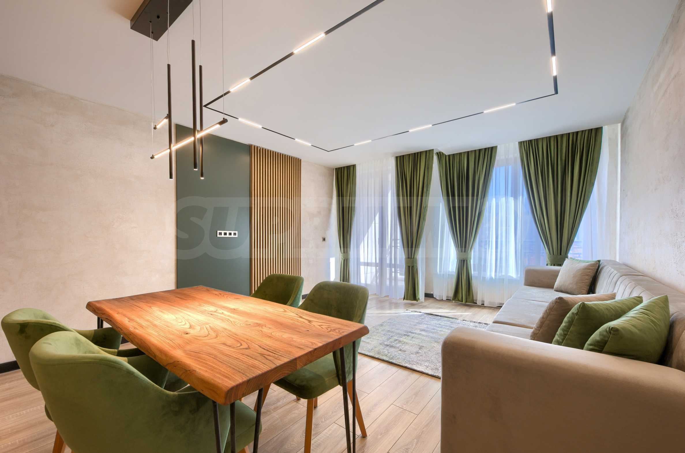 Имотът разполага с просторна и слънчева всекидневна с южно изложение, завършена в земни цветове със зелени акценти. Пространството включва голям диван, трапезна маса и напълно оборудван кухненски бокс с полуостров, а при желание от бъдещите наематели може да бъде закупен и поставен голям smart телевизор.