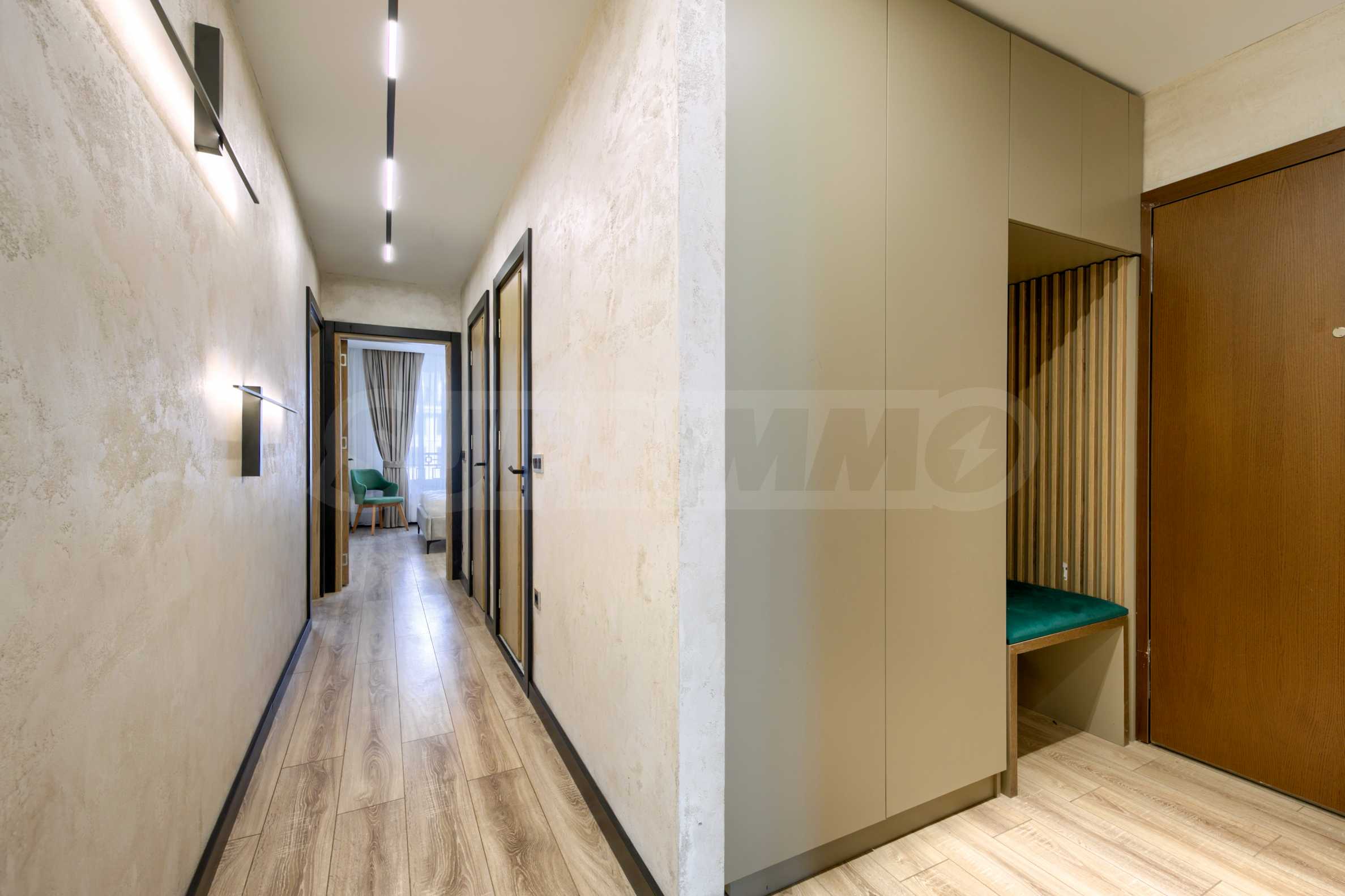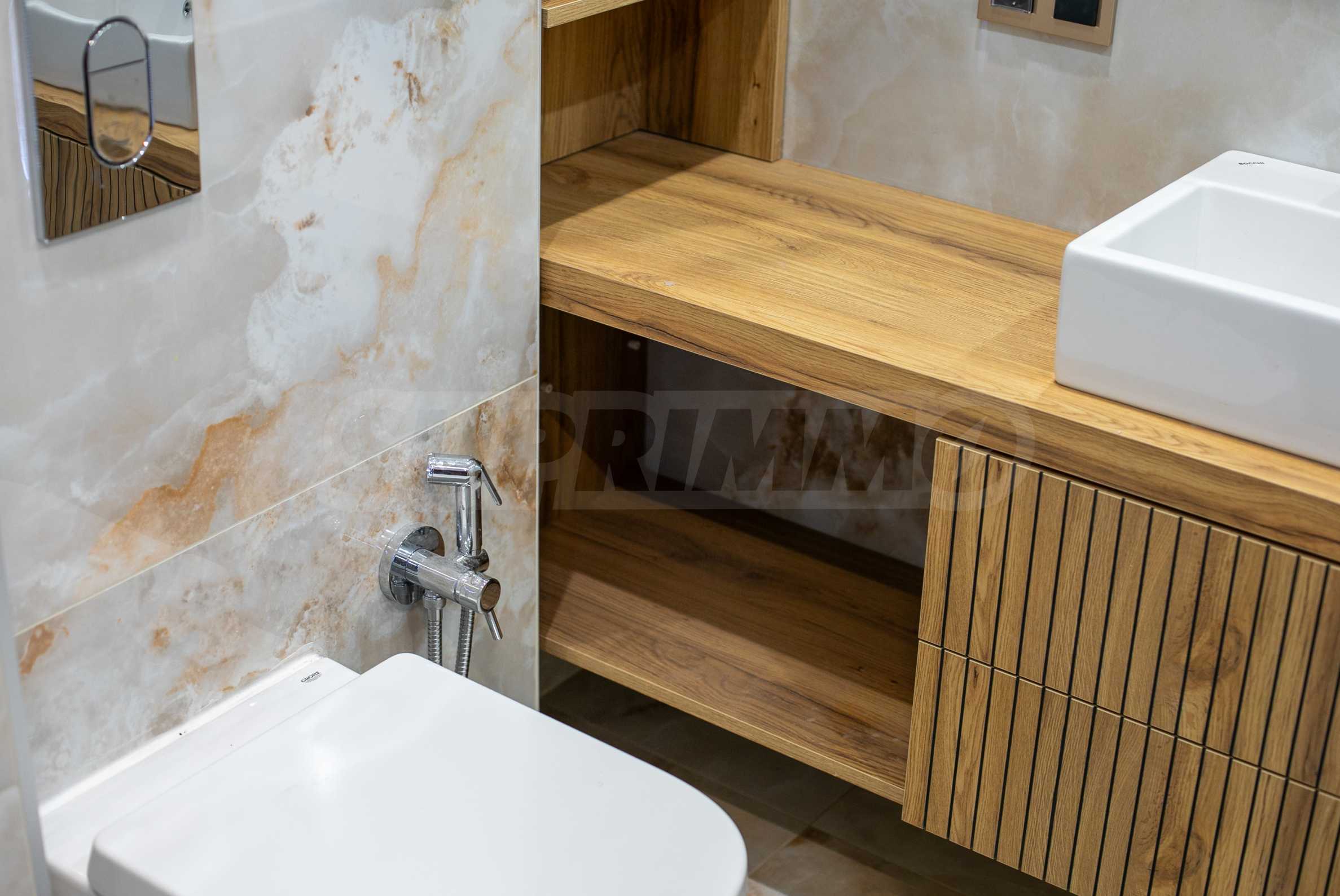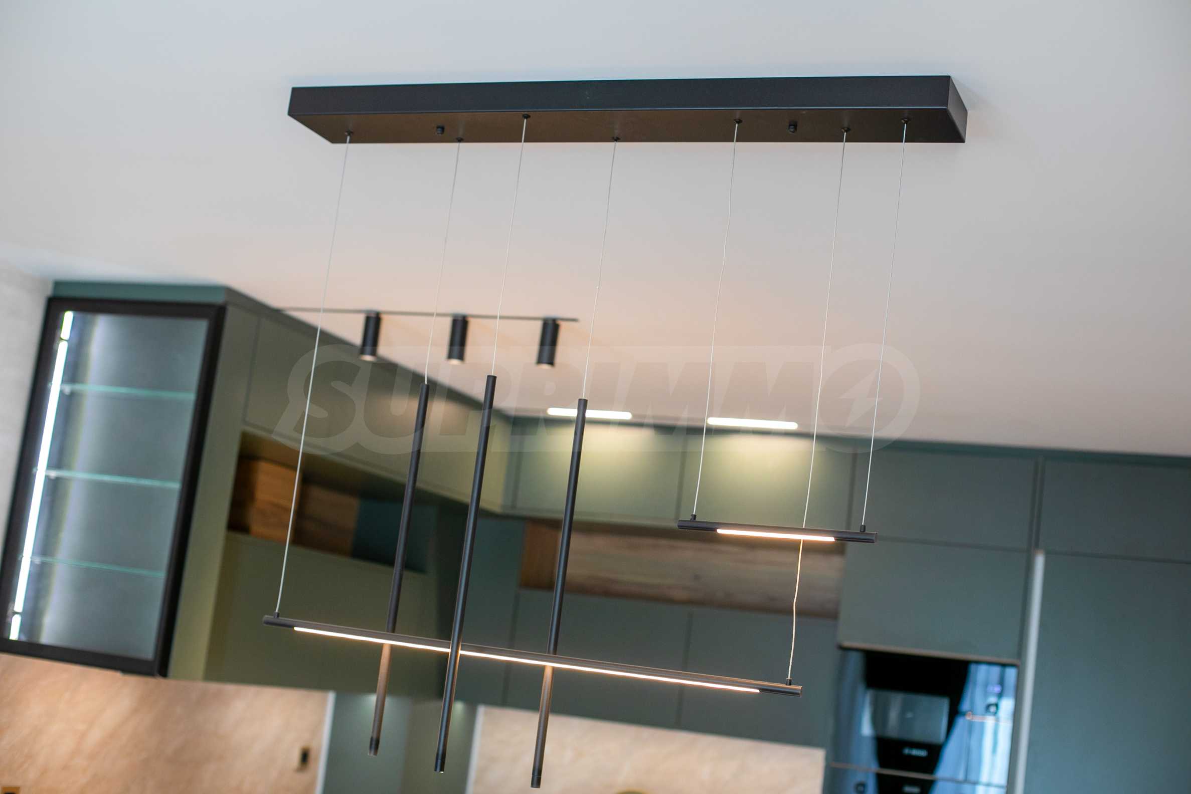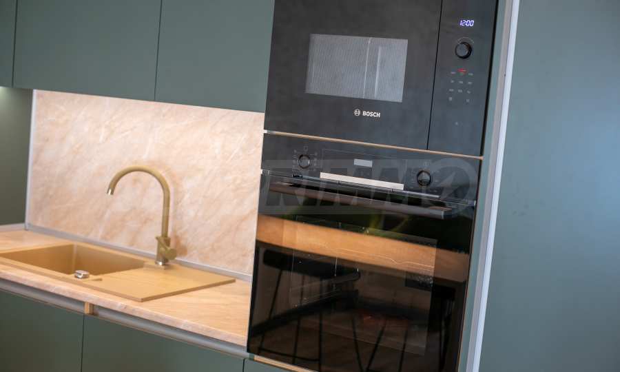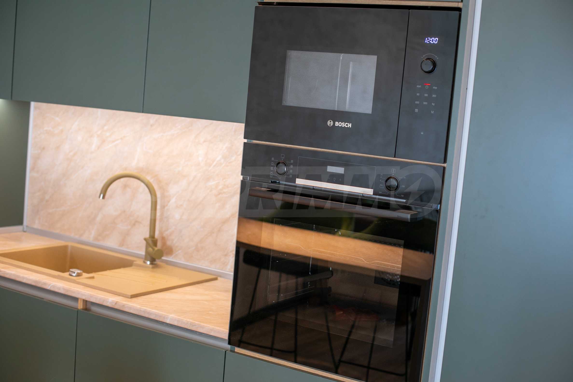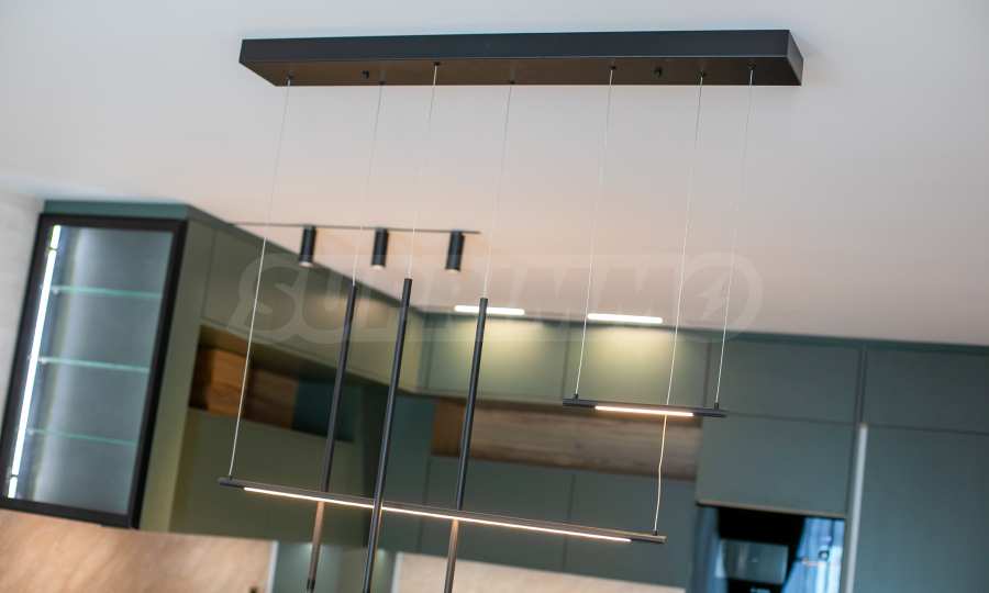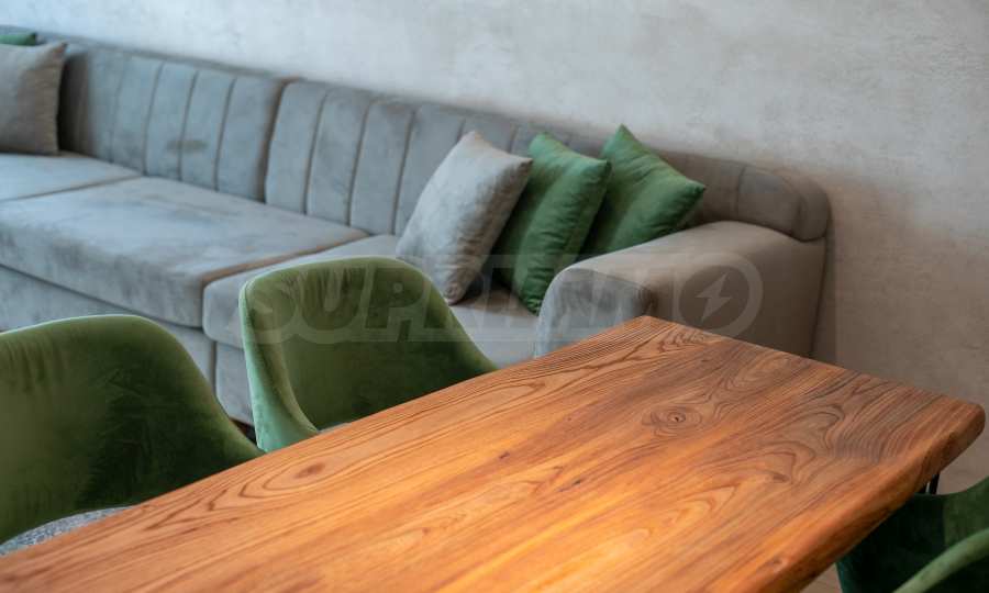 Имотът разполага с просторна и слънчева всекидневна с южно изложение, завършена в земни цветове със зелени акценти. Пространството включва голям диван, трапезна маса и напълно оборудван кухненски бокс с полуостров, а при желание от бъдещите наематели може да бъде закупен и поставен голям smart телевизор.