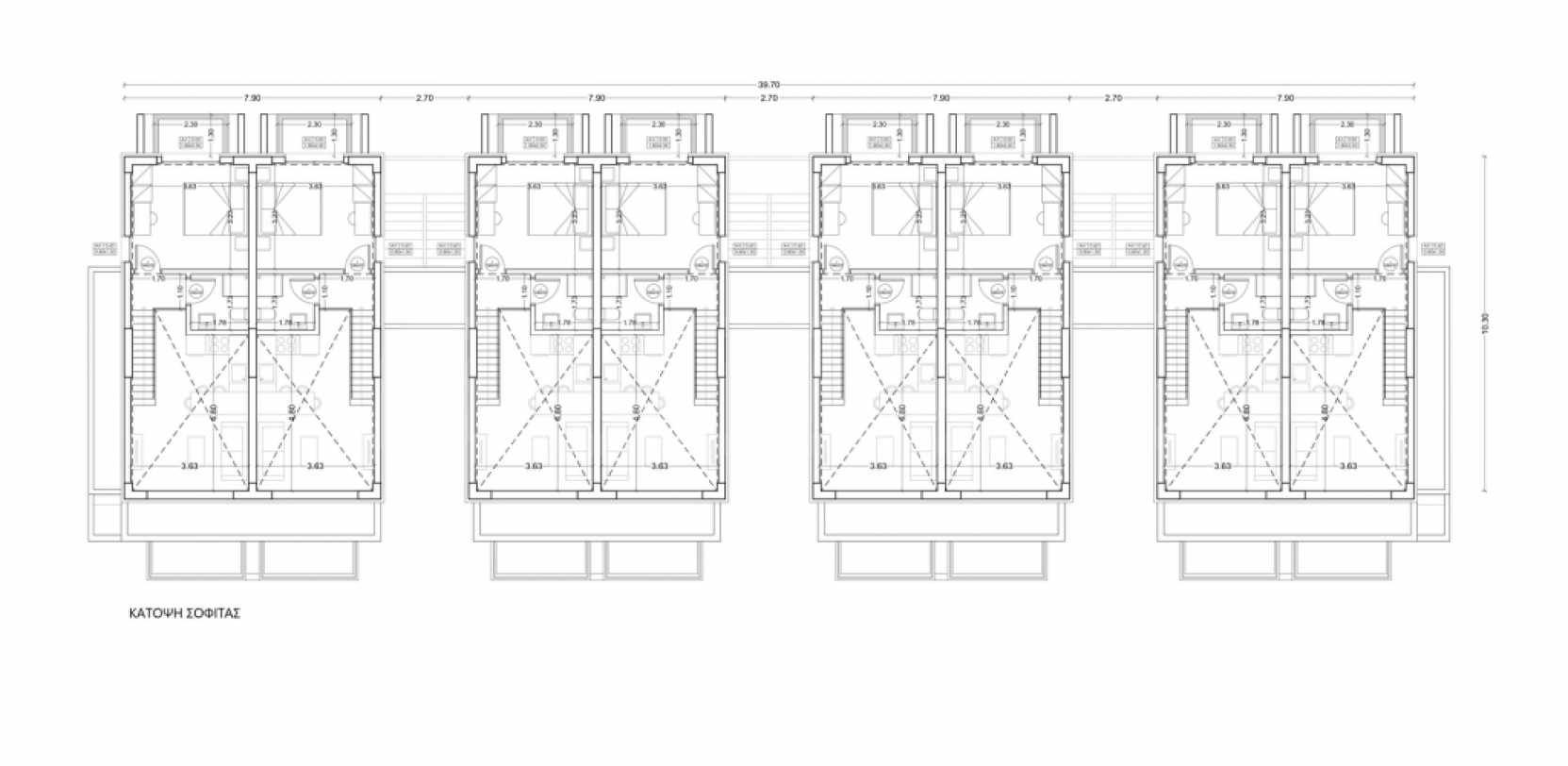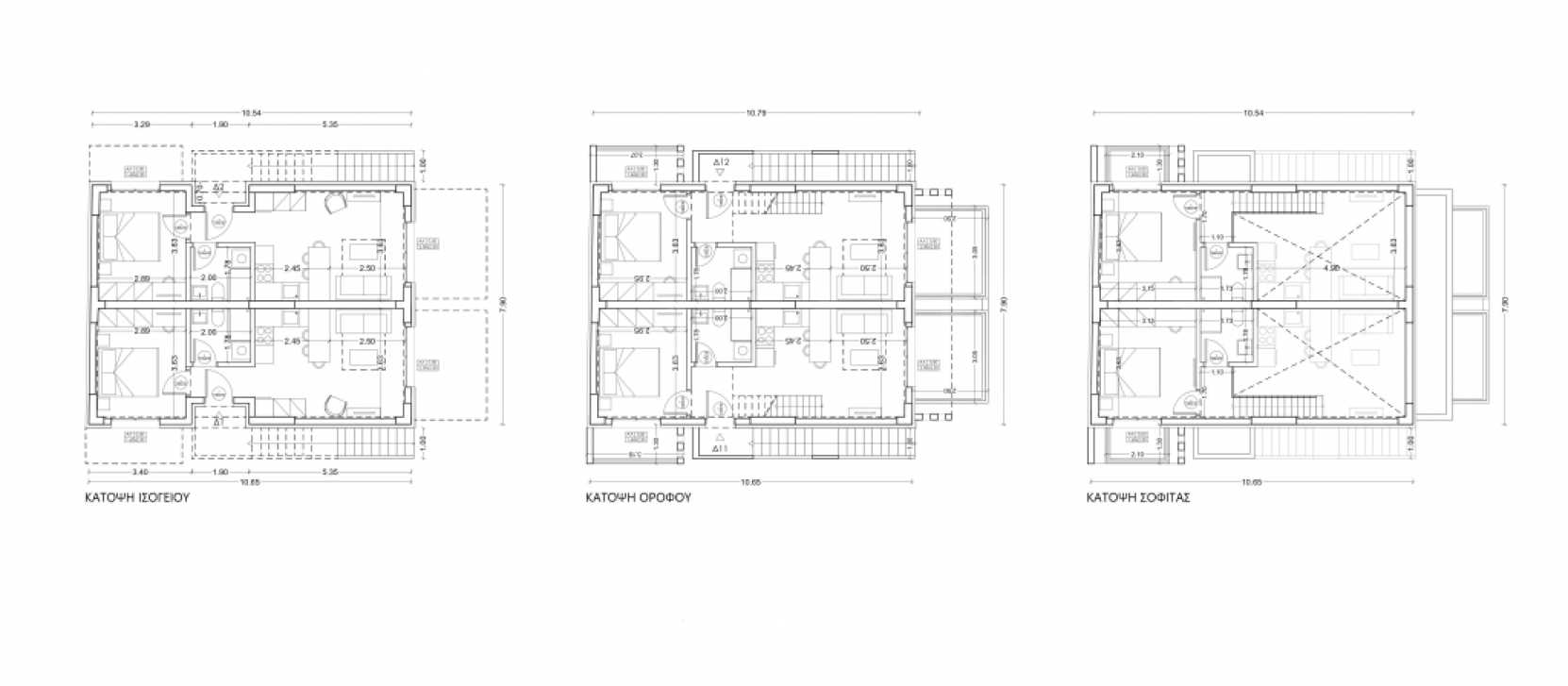 • 10 апартамента на първи етаж с таванско помещение от 64,37 кв.м до 64,84 кв.м, състоящи се от хол с кухня, 2 спални и 2 бани.