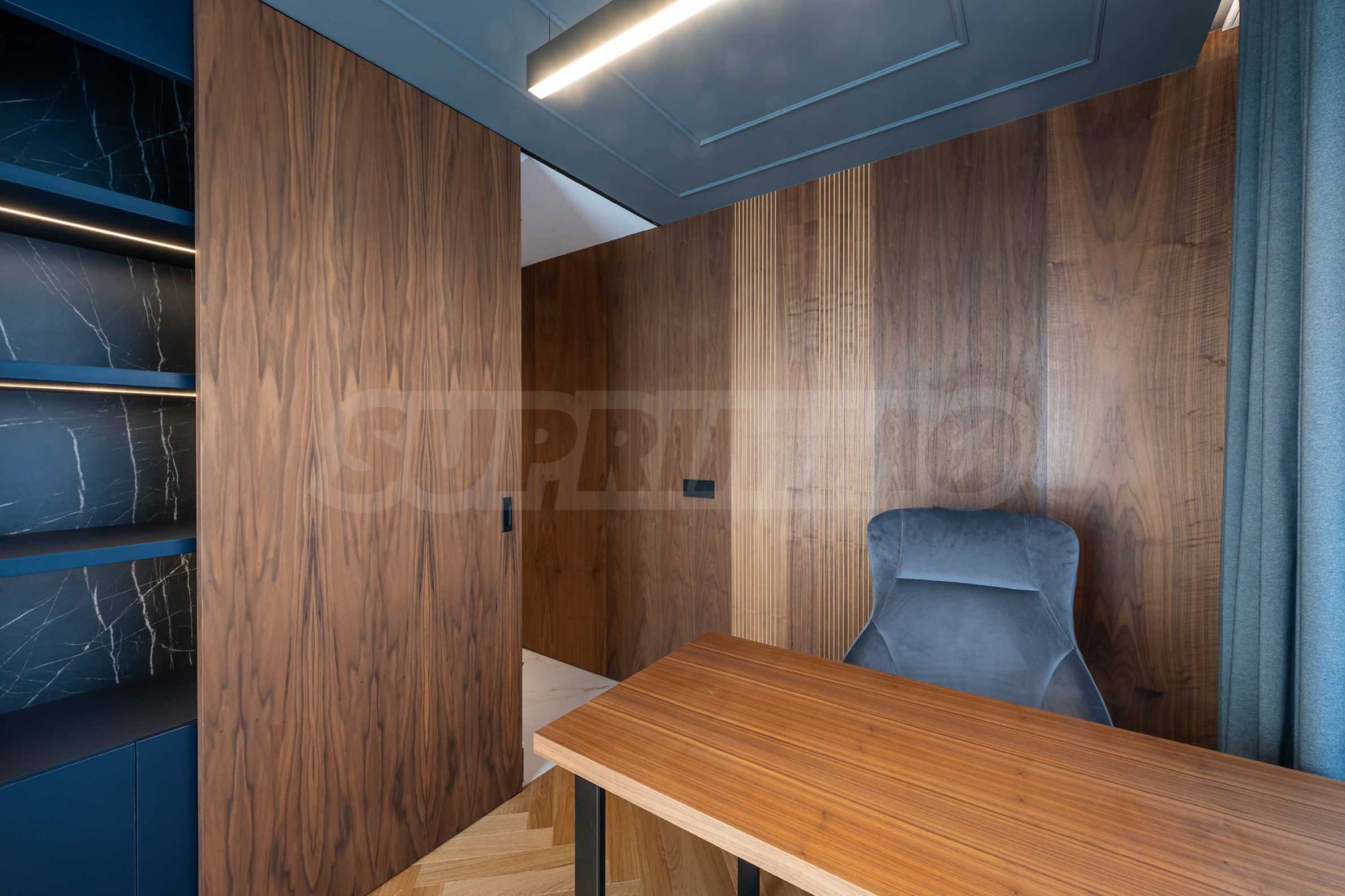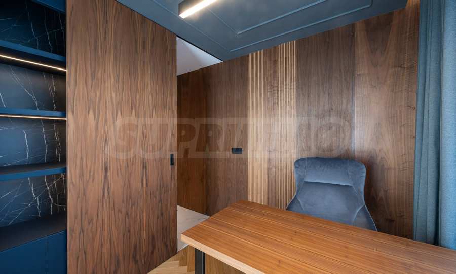- мебелите, интериорните врати и обшивка по стени и тавани е с естествен фурнир от орех;