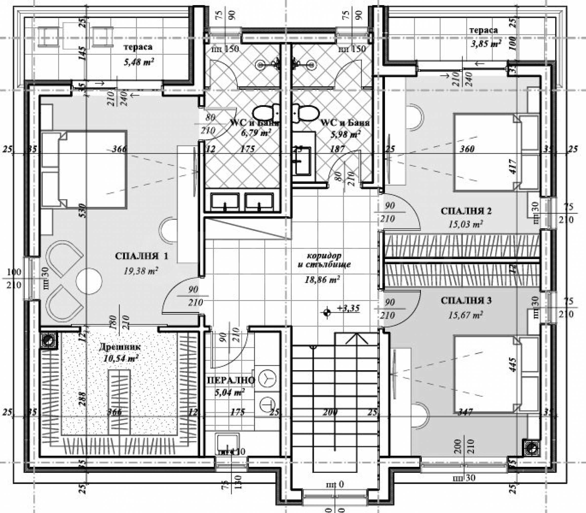 - спалня - 19.38 кв.м, баня с тоалетна - 6.79 кв.м, дрешник - 10.54 кв.м и тераса - 5.48 кв.м;