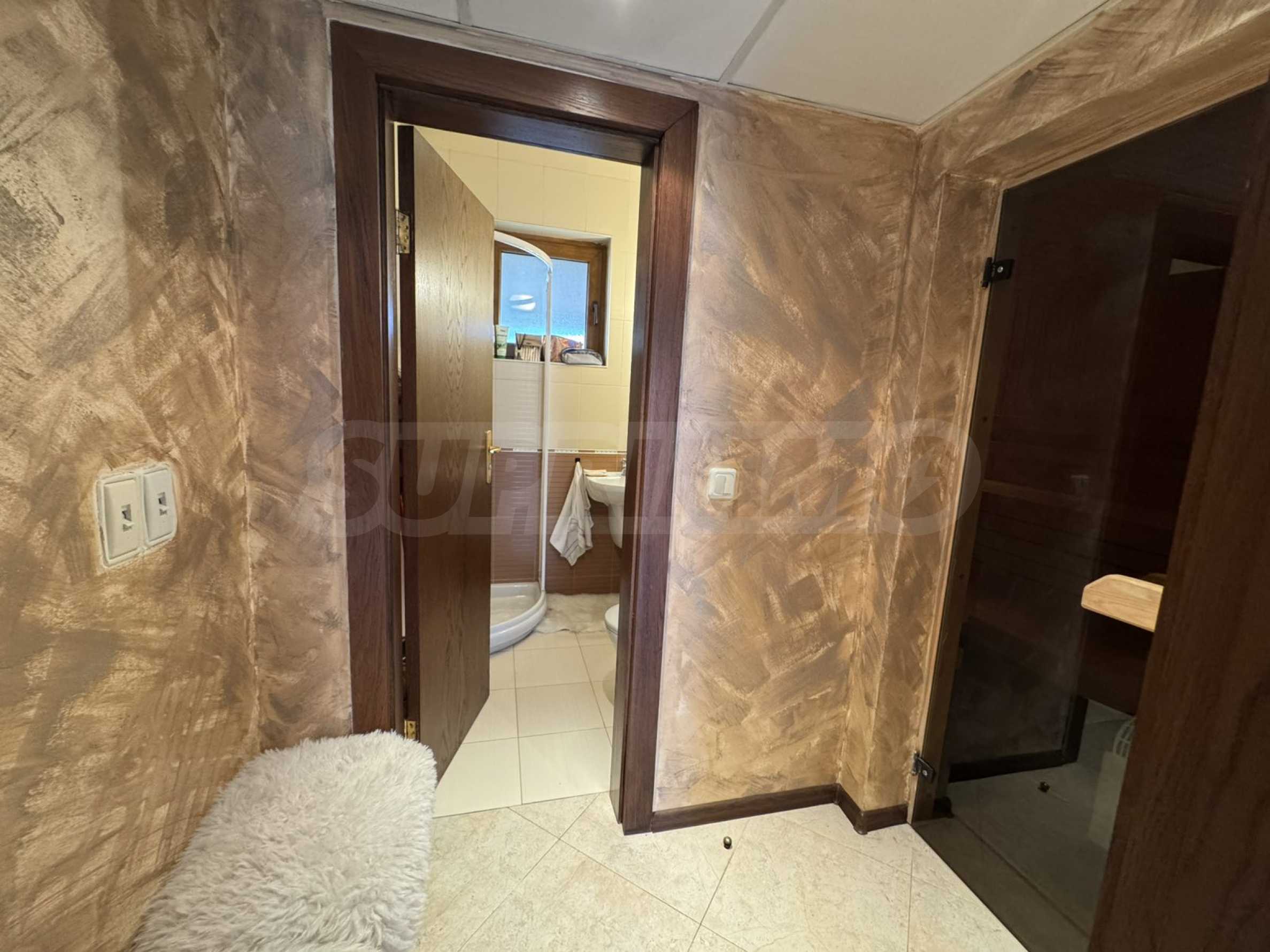 Първи етаж - дневна с кухненски бокс и камина, сауна, баня с душ кабина и тоалетна, южна тераса;