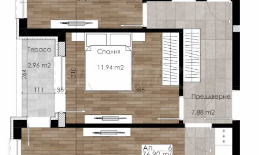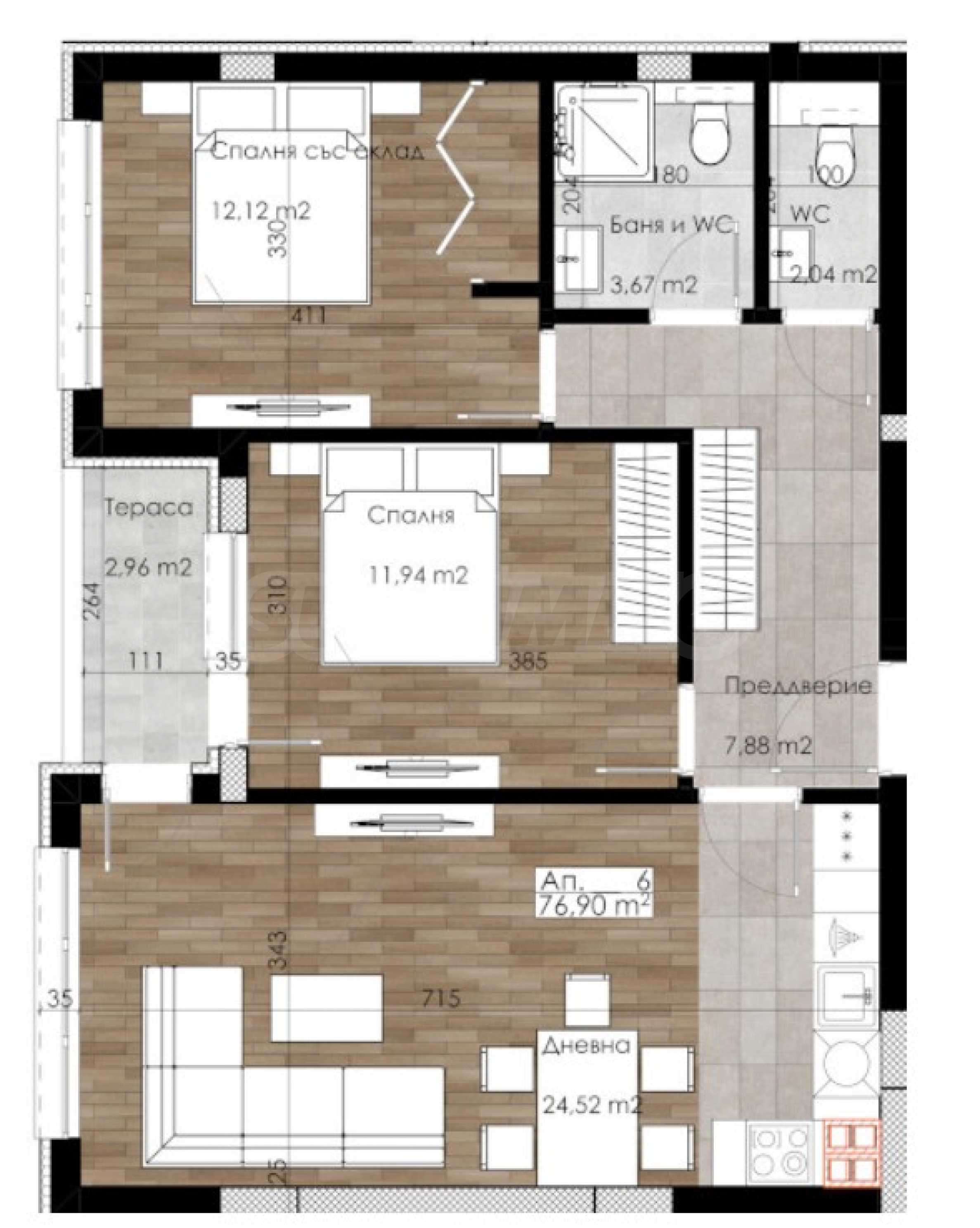 - две самостоятелни спални по 12 кв.м, едната с излаз на тераса;