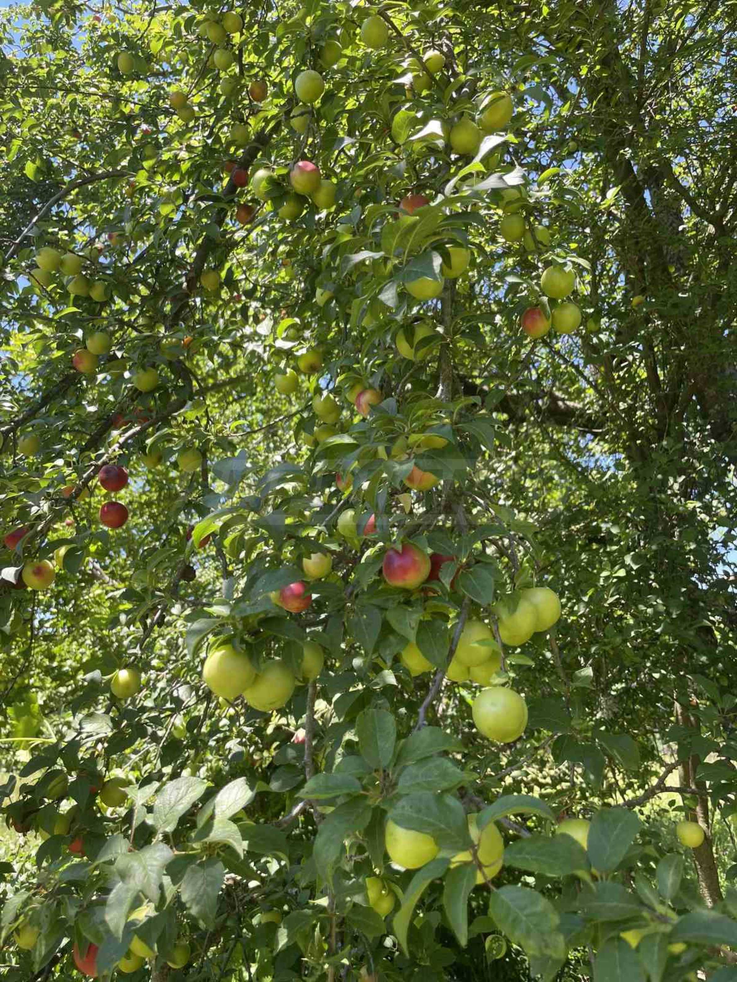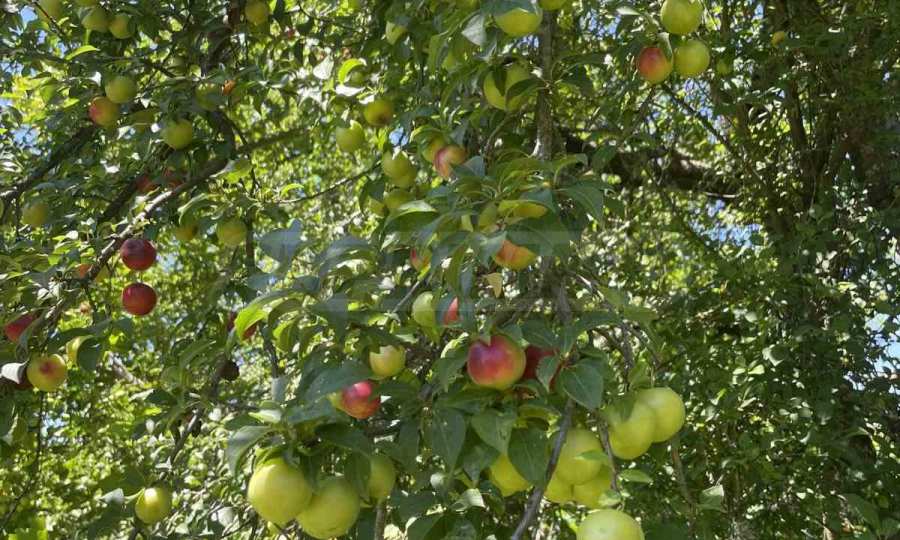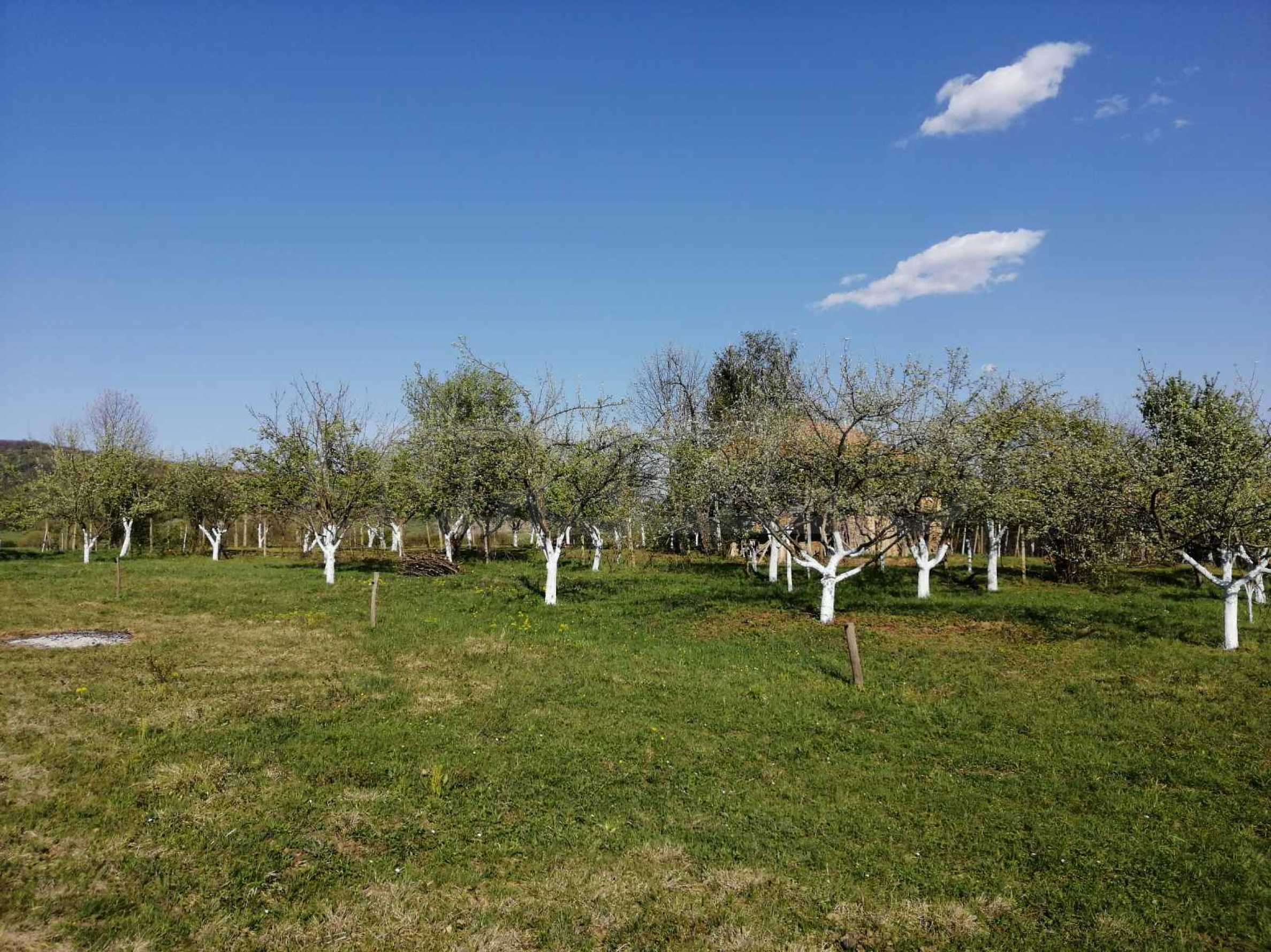 Една част от двора ( около 4 декара ) е оградена и има множество овощни дървета (ябълки, круши, сливи, дюли, вишни, череши, смокиня, орехи, лозе и др.) останалата част в момента се използва за пасище за крави и коне, 100% естествено наторяване :) никога не са използвани каквито и да било изкуствени торове или препарати - 100% БИО!