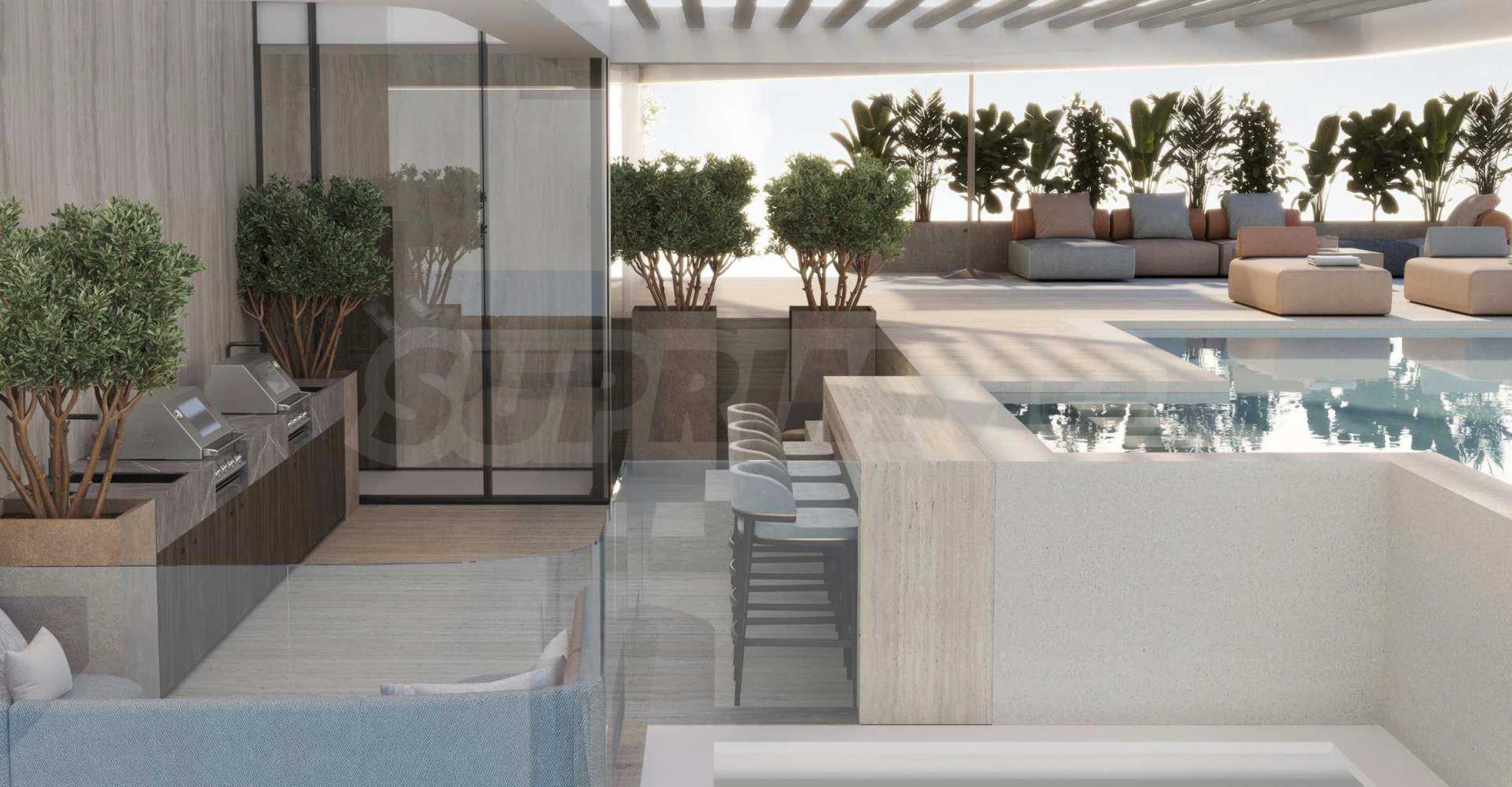 На територията на комплекса ще откриете и богата селекция от удобства, подбрани и изпълнени така, че да задоволяват нуждите на своите резиденти. Сред тях са първокласна фитнес зала, сауна и СПА, както и обособени зани за практикуване на йога на открито. В комплекса ще откриете и басейн на покрива на сградата, предвиден за възрастни, с цел да се гарантира спокойствието и уединението на използващите го. За децата е предвидена специална зала за игри и забавления. Ако желаете да прекарате свободното си време навън, за Вас е предвидена озеленена парк зона, както и барбекю. Сградата разполага със собствен ресторант и лаундж зона.