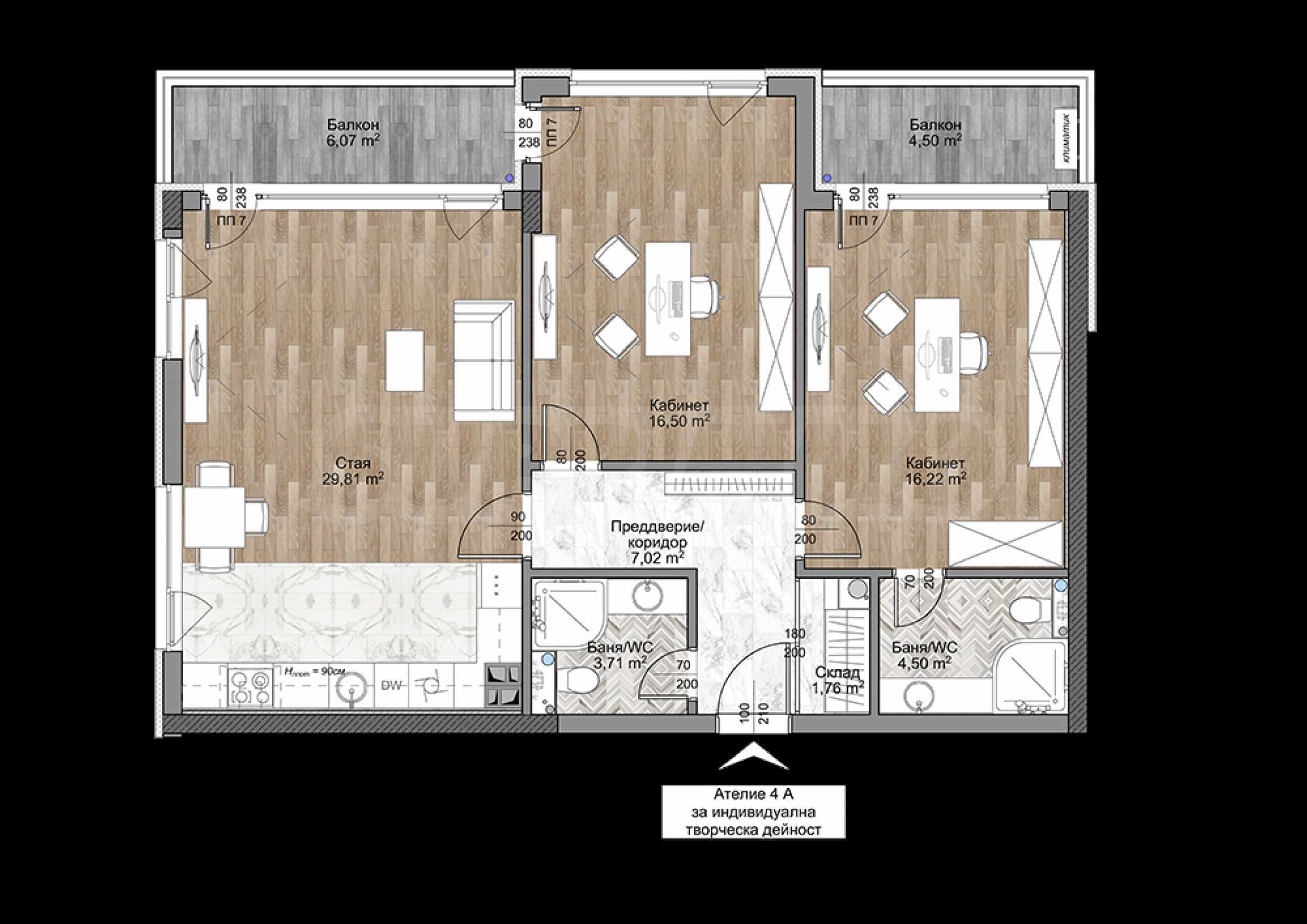 Състои се от обща площ 122.44 кв.м. (нетна площ 105.20 кв.м. + общи части 17.24 кв.м.) и е разположен на първи етаж.