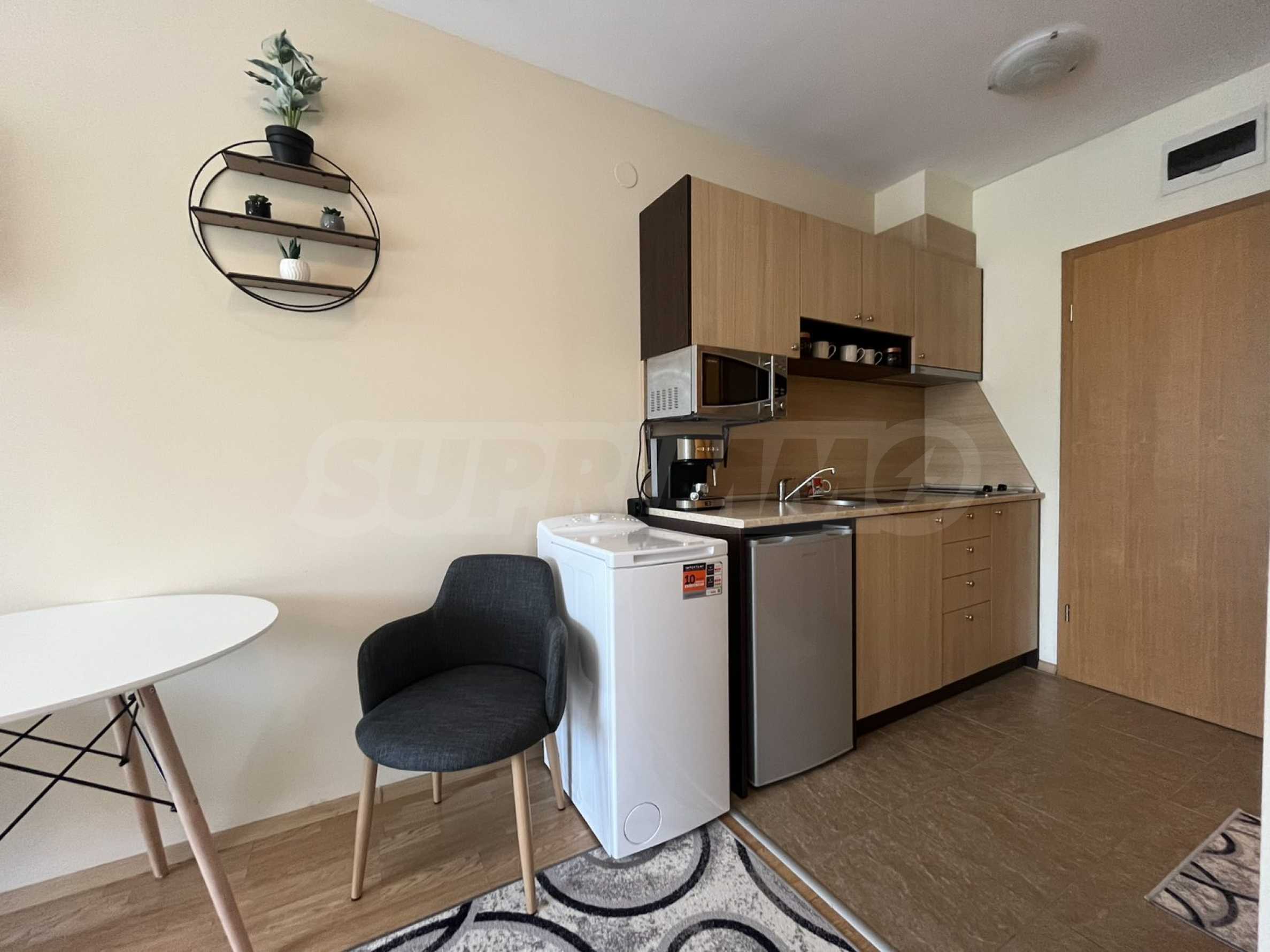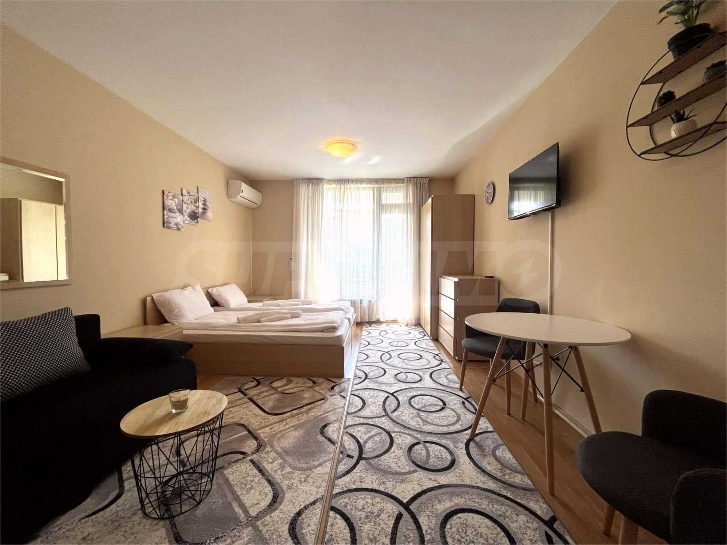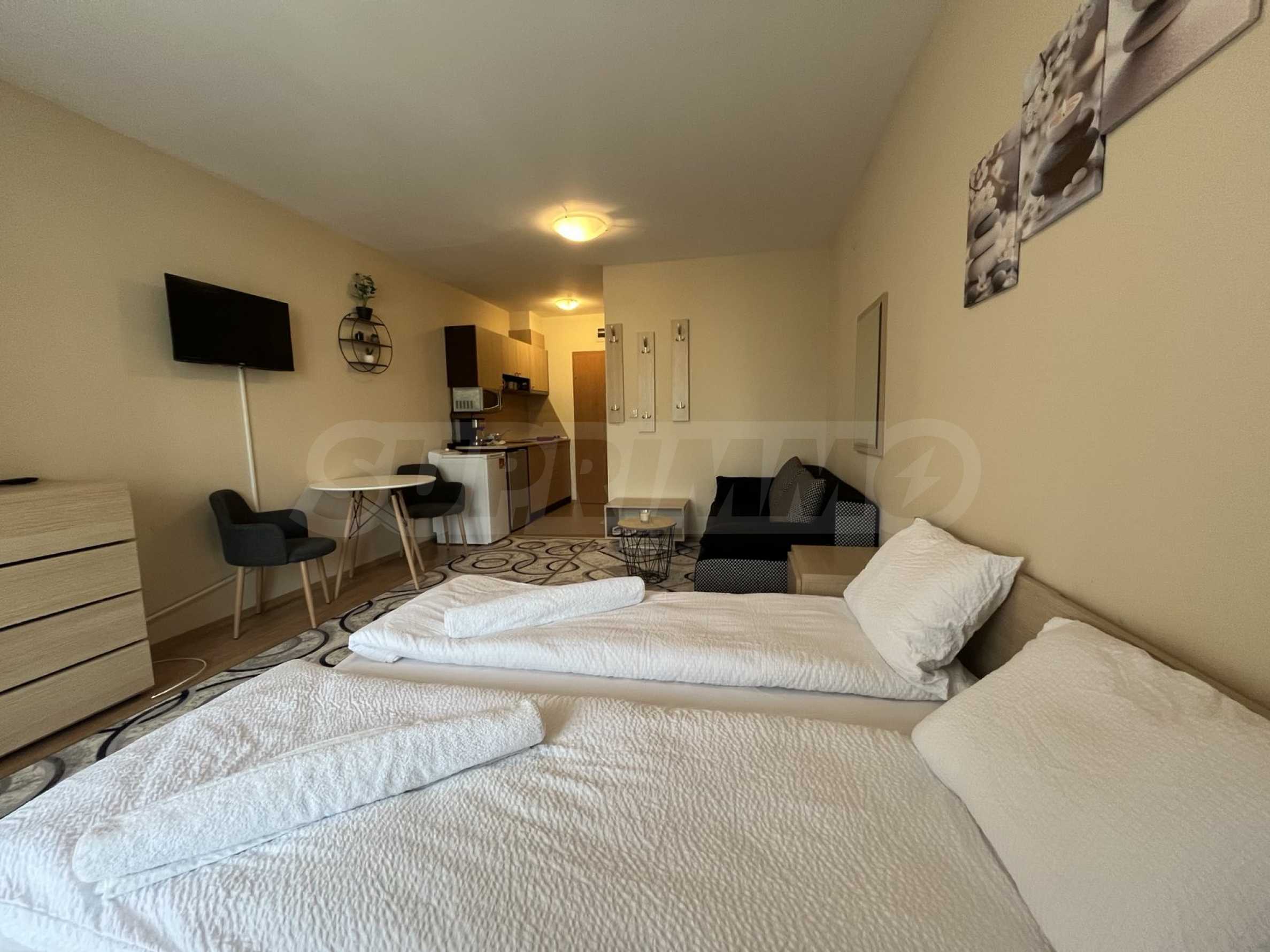 Апартаментът е тип студио и разполага с разтегателен диван, спалня, маса за хранене с два стола, напълно оборудвана кухня, тераса, баня с вана и тоалетна.