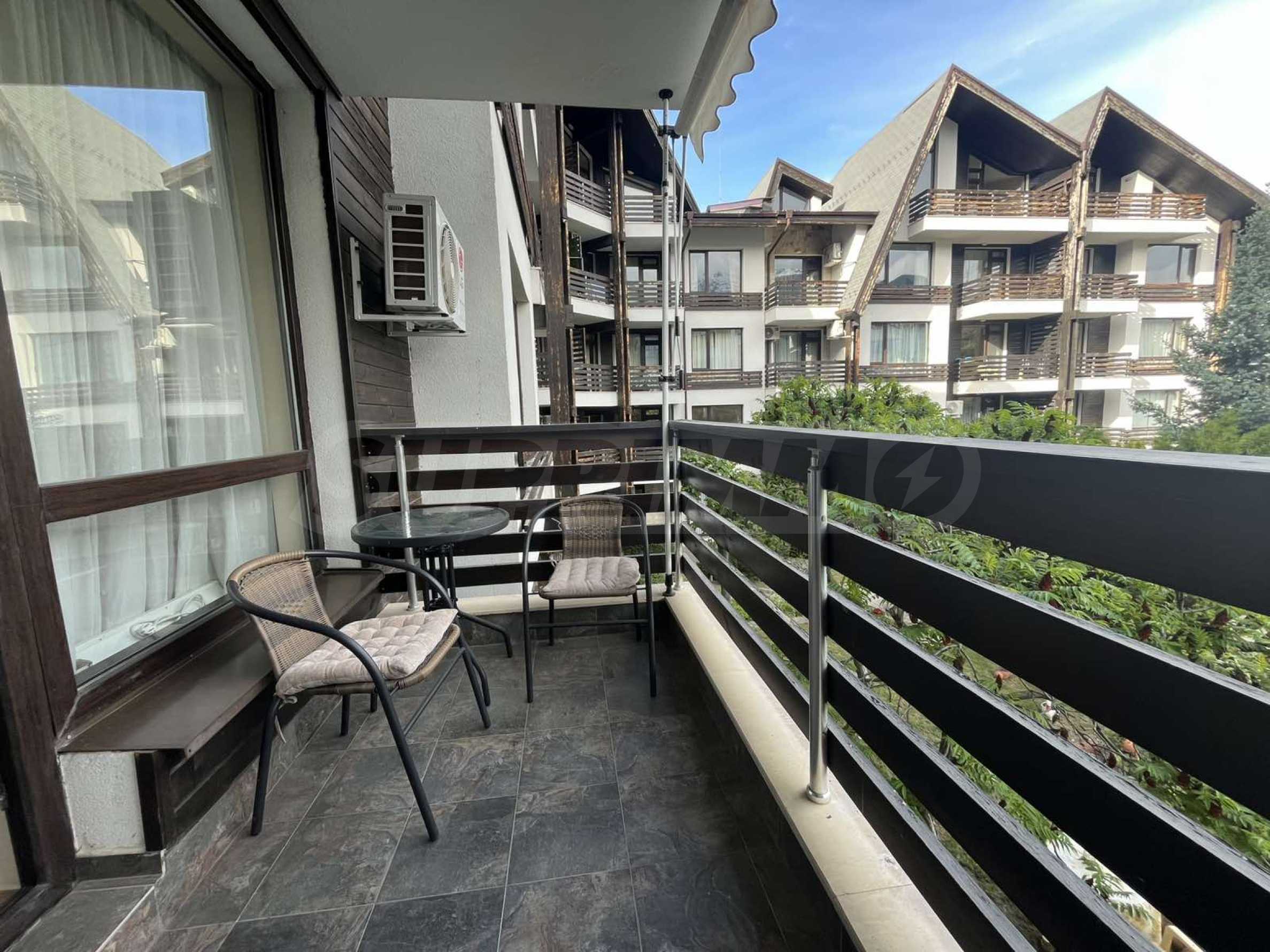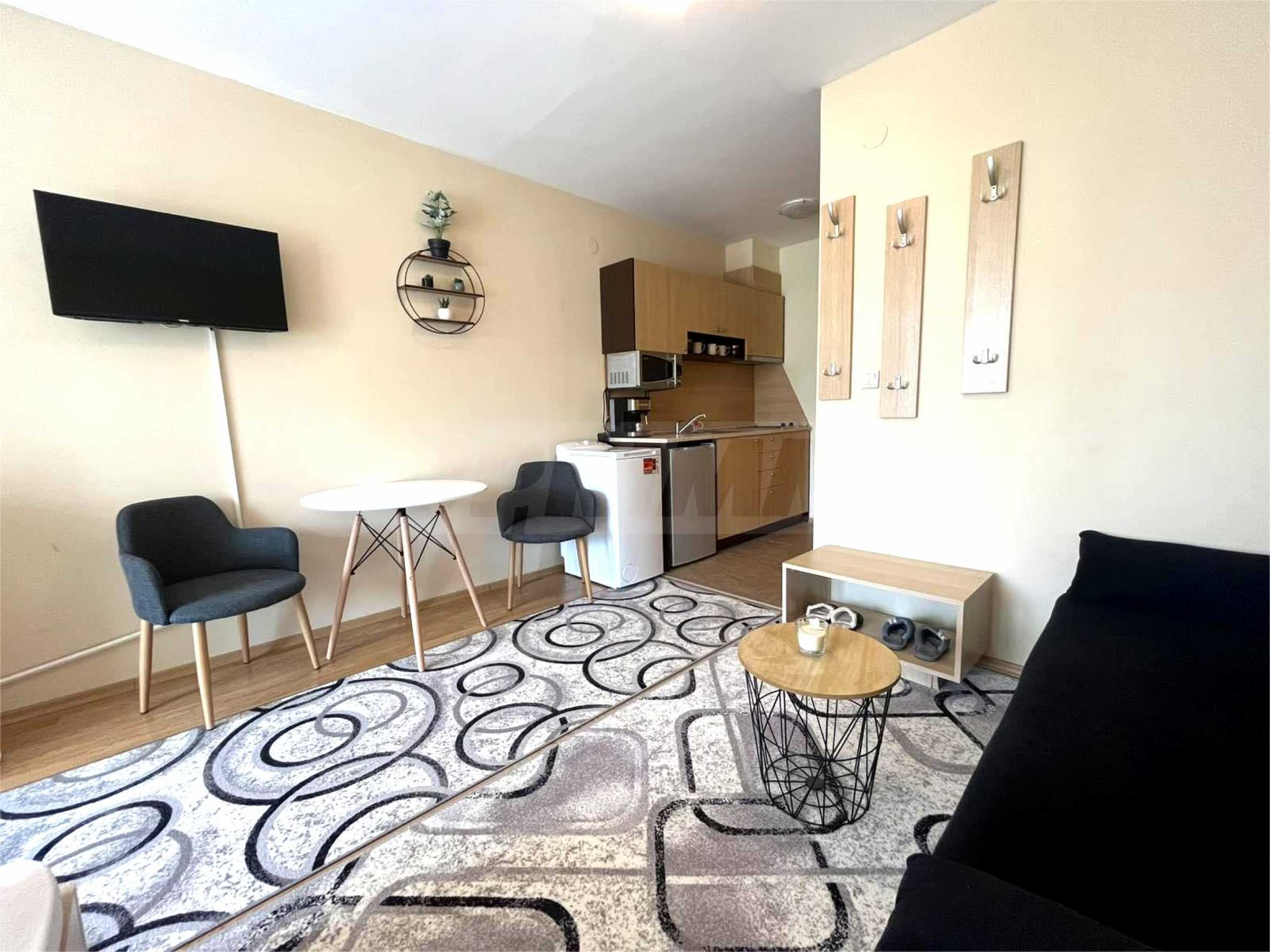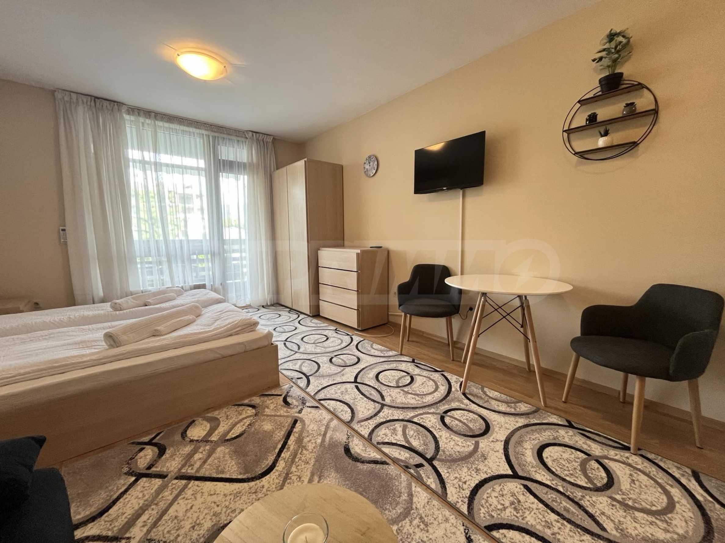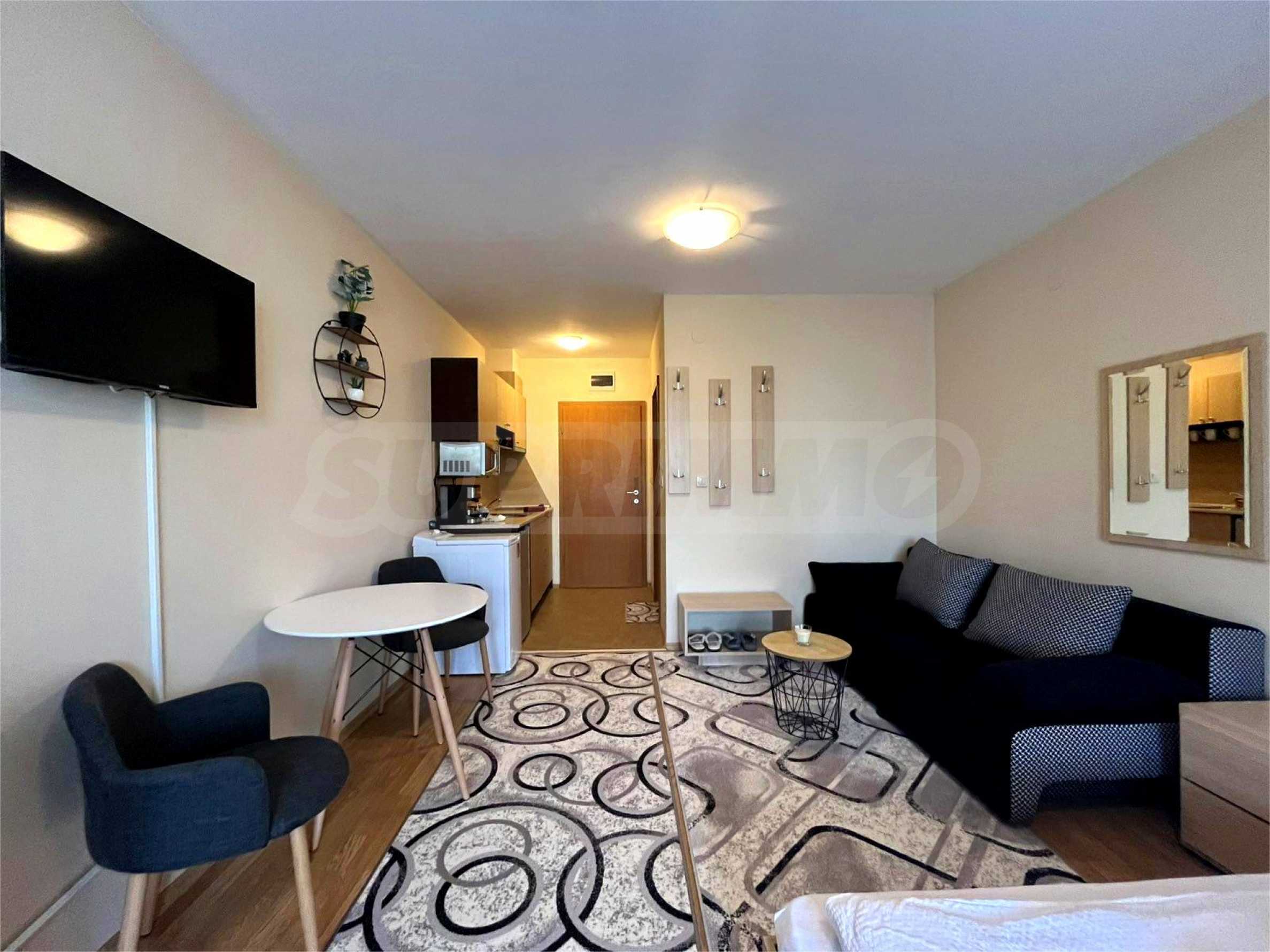 Апартаментът е тип студио и разполага с разтегателен диван, спалня, маса за хранене с два стола, напълно оборудвана кухня, тераса, баня с вана и тоалетна.