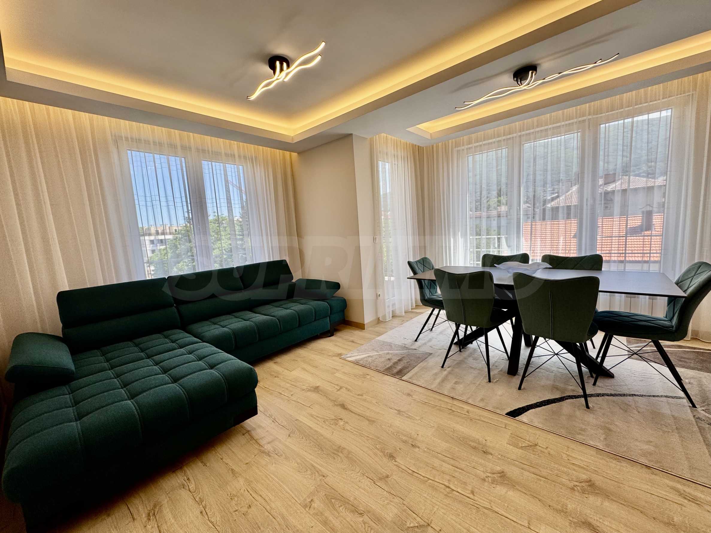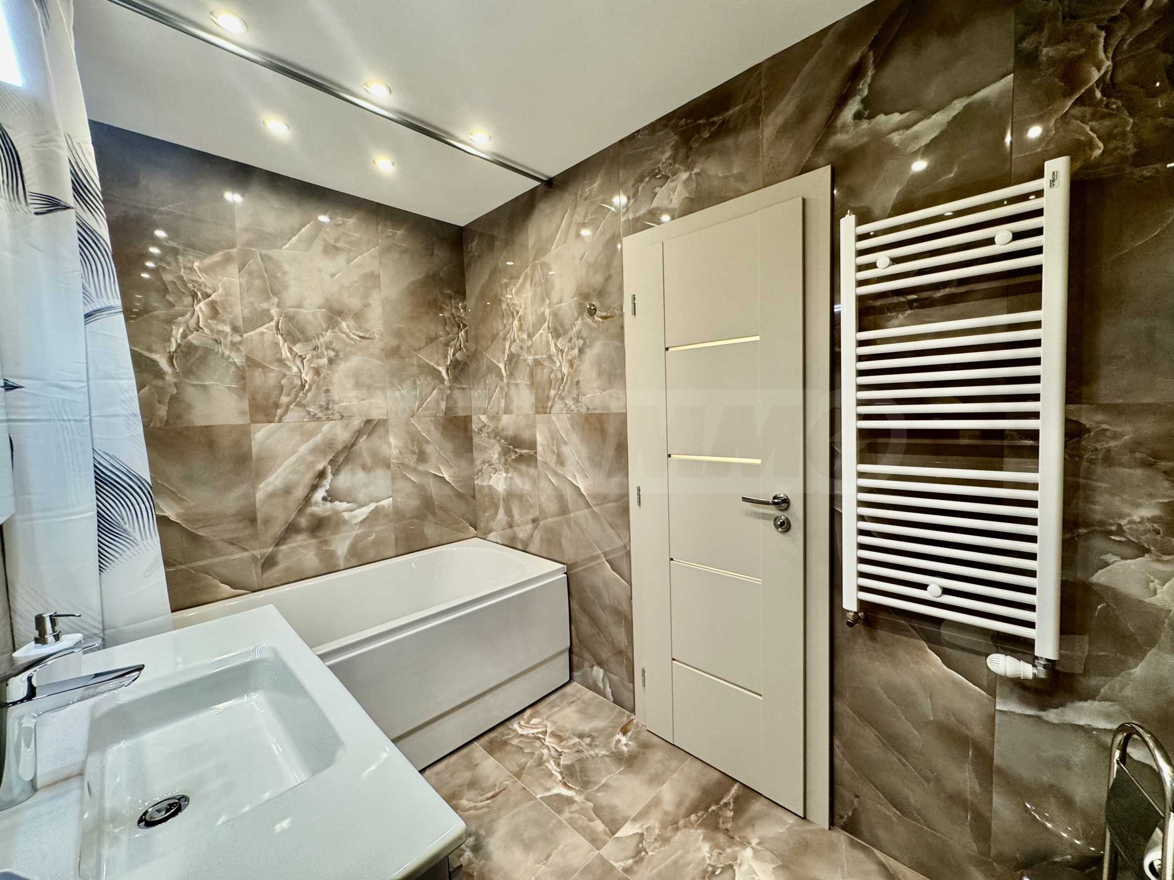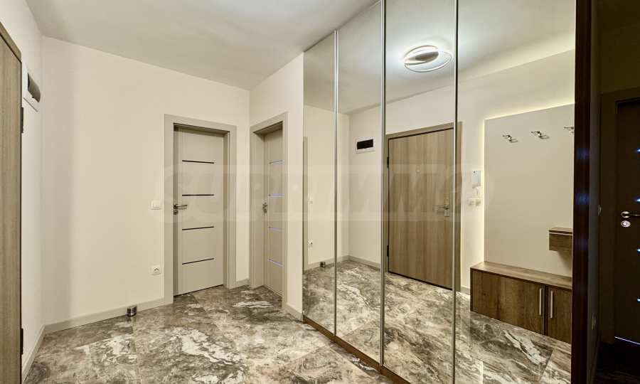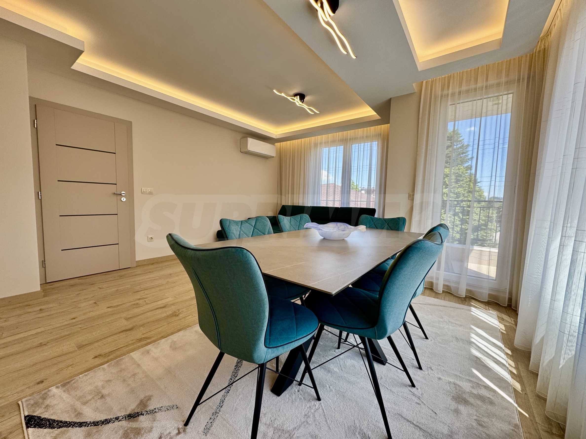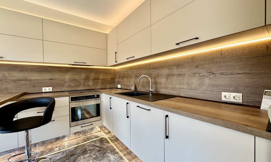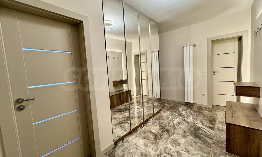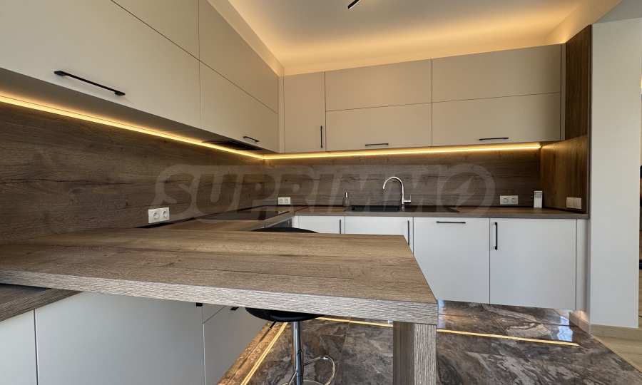 Имотът предлага елегантен и модерен интериор с висок клас материали, електроуреди и дизайнерско обзавеждане. Функционалното осветление завършва модерния облик на апартамента, като е старателно премислено във всяка една стая. Подовите настилки са от висококачествен гранитогрес и мокет. Отоплението е посредством климатици, газово котле и допълнителен електрически бойлер за топлата вода.