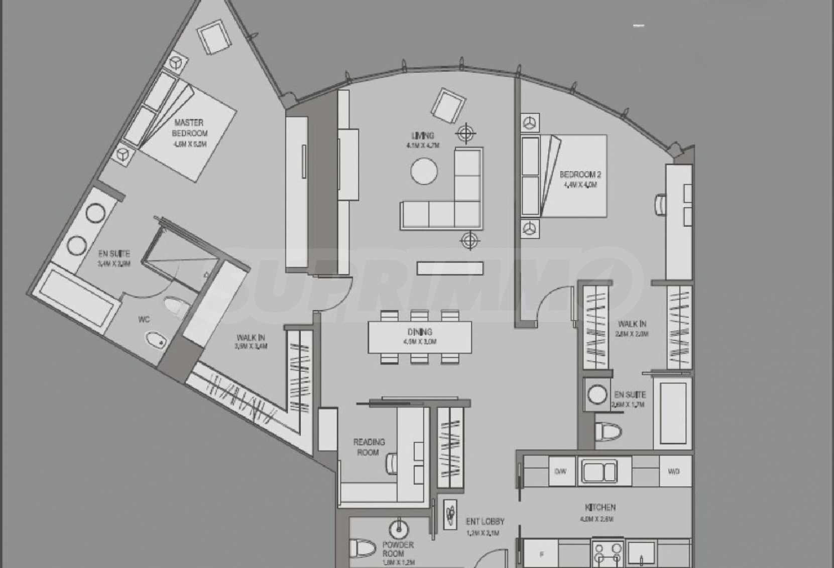 Апартаментът предлага застроена площ от 152,26 кв.м. или 1639 кв. фута, с допълнителна кабинетна стая. От него се открива спираща дъха гледка към града, Дубайската опера, Бурж Парк и фонтаните. Апартаментът е свободен при прехвърляне и разполага с две паркоместа.