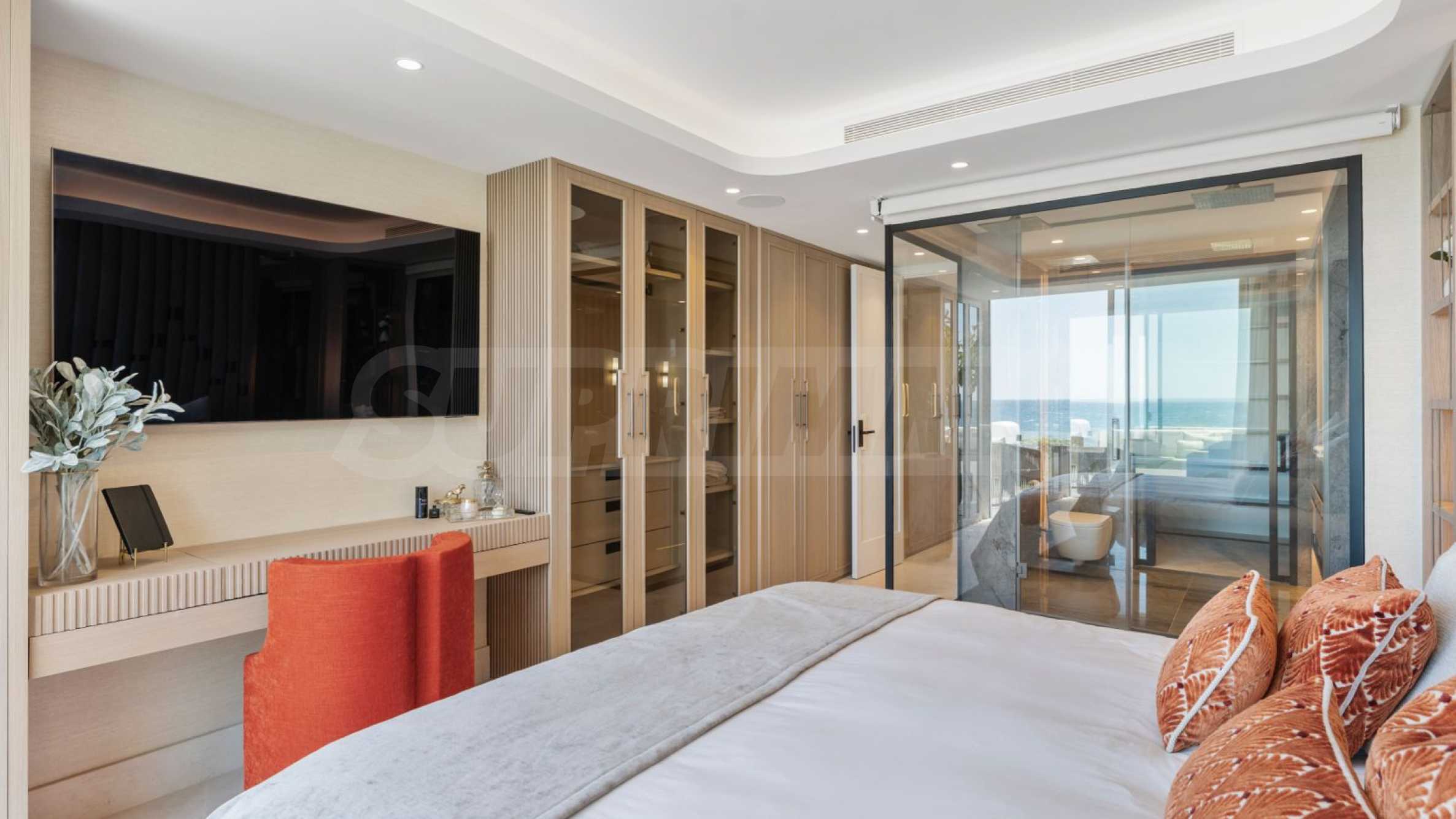 Апартаментът предлага изискан интериор, в който цари усещане за спокойствие, изтънченост и елегантен морски стил. Изчистените линии, неутралната цветова палитра и внимателно подбраните естествени материали създават атмосфера, изпълнена с лукс и хармония. Със спираща дъха гледка към морето, тук всяка зона е проектирана така, че да приканва към релакс, приятни вечери с приятели и безгрижни моменти край морето. Атмосферата е едновременно топла, минималистична и съвременна – идеална за онези, които търсят качествен живот в съвършено пространство.