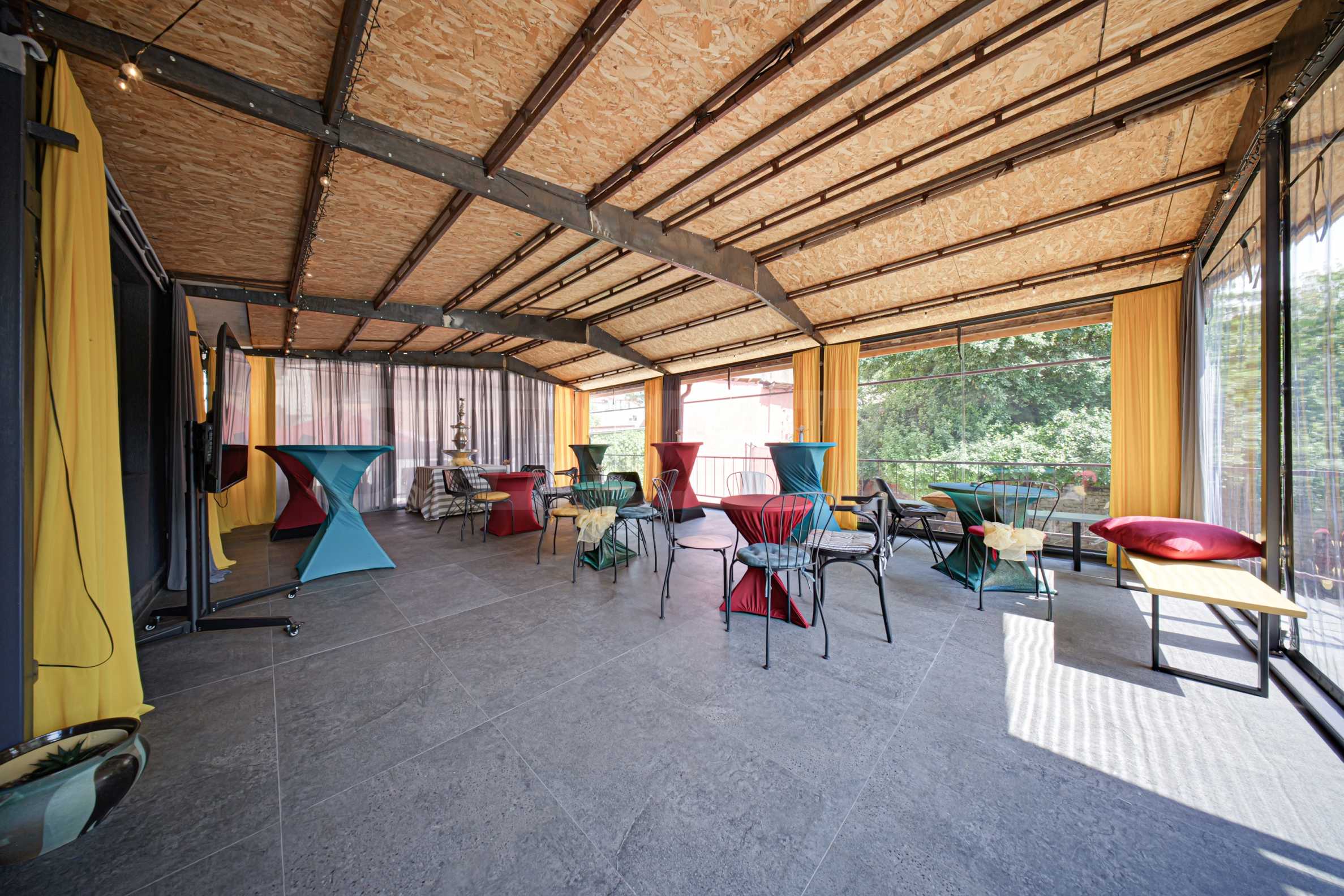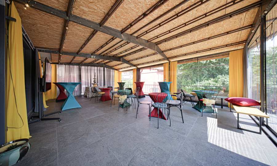 • голяма тераса с ветроупорни завеси, обзаведена с високи и ниски маси и столове,