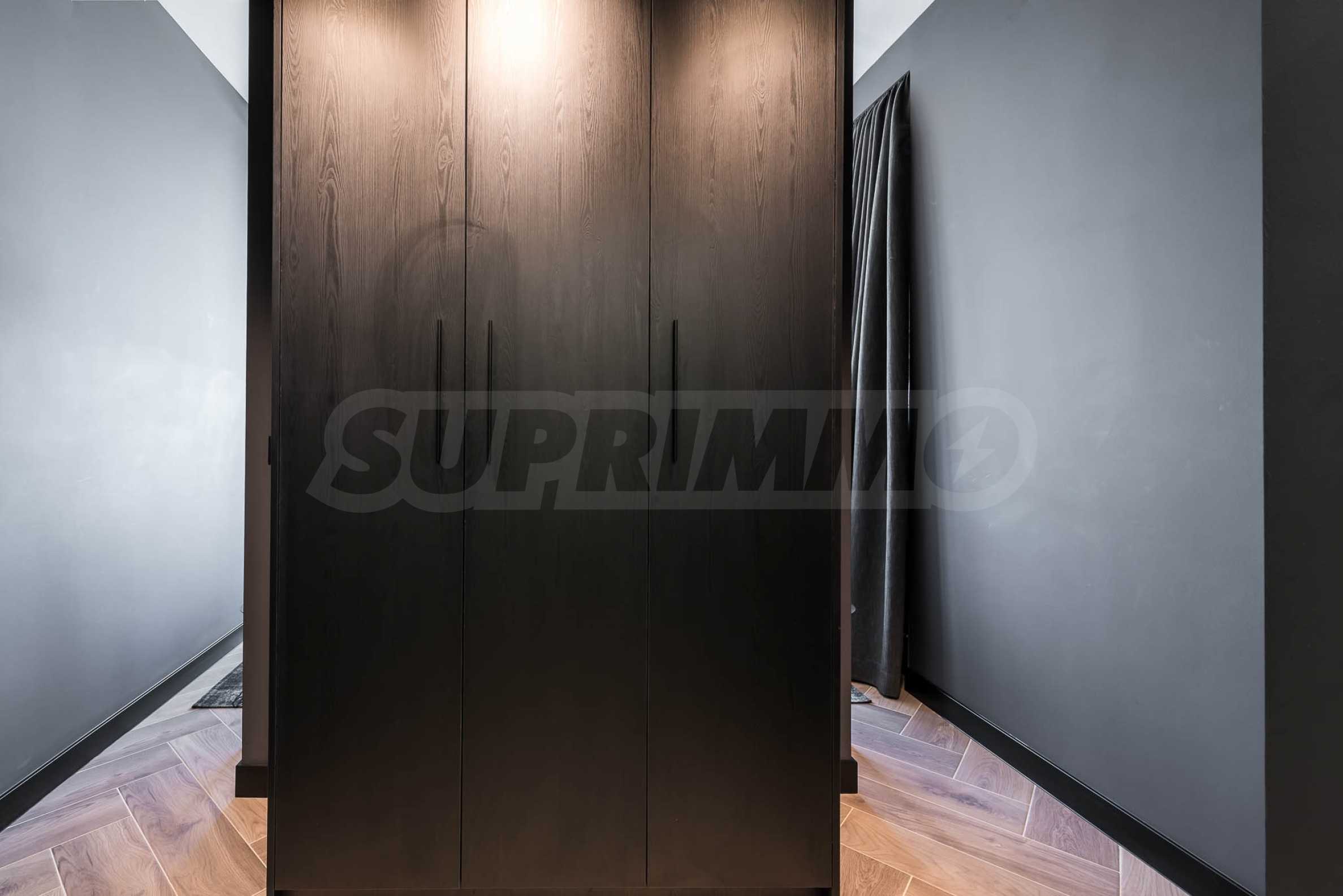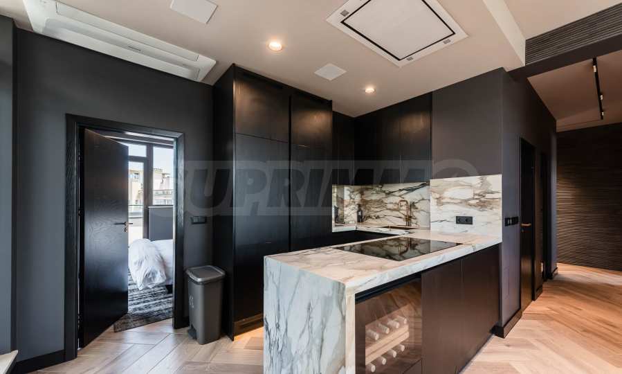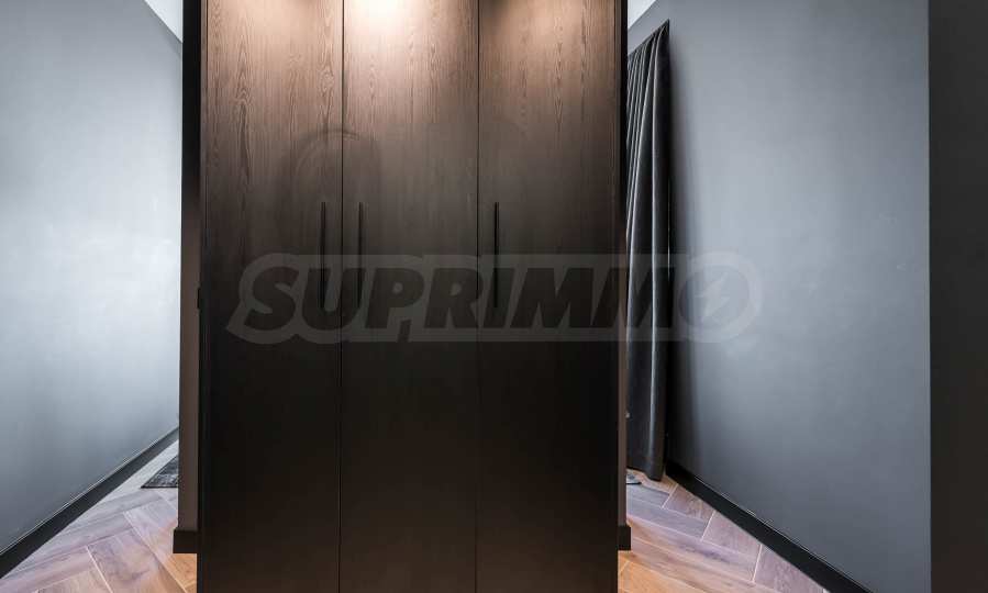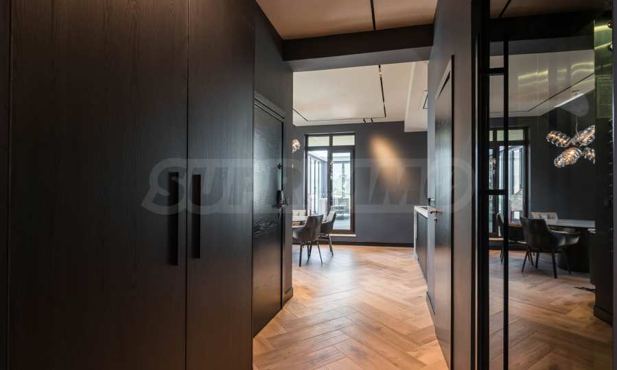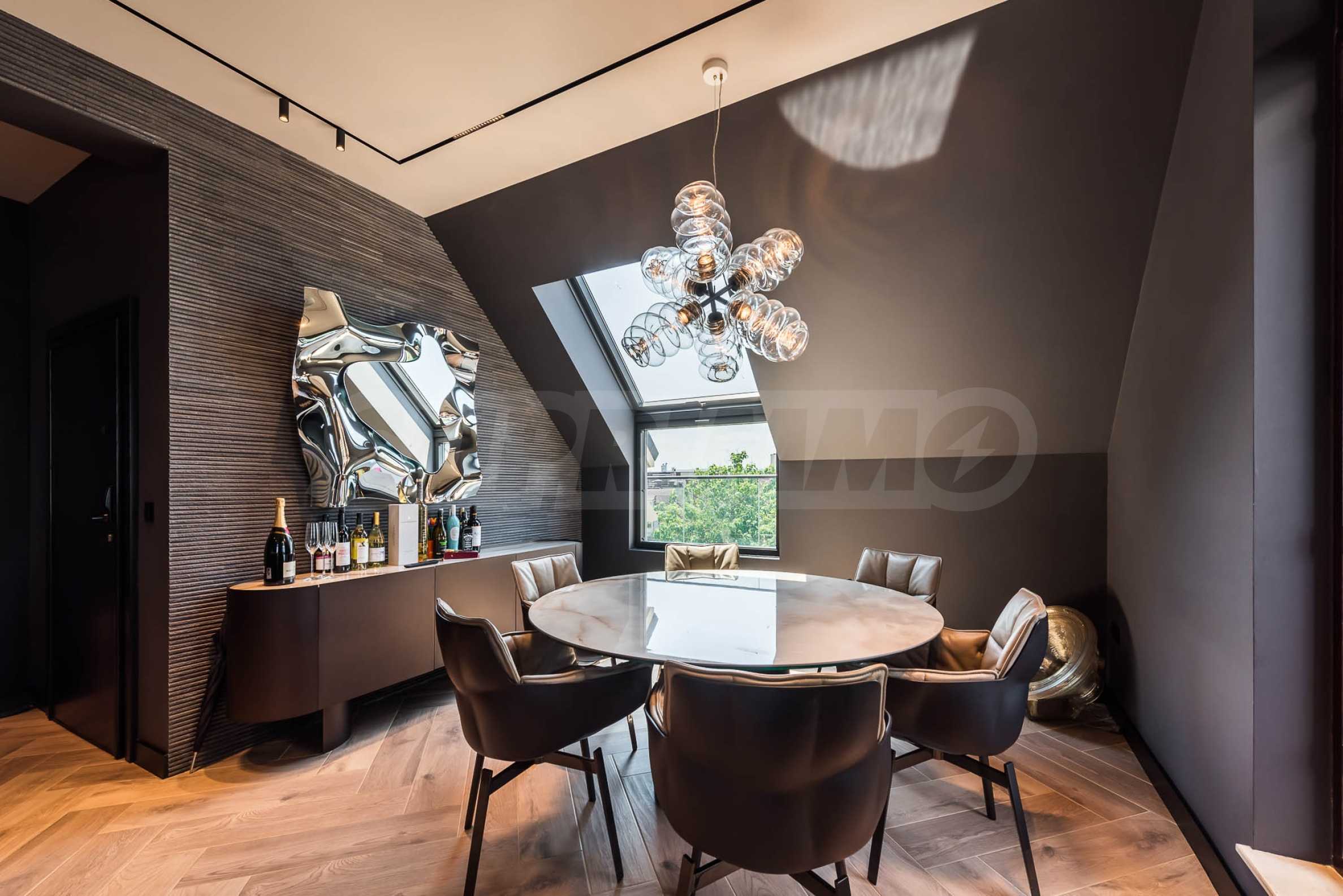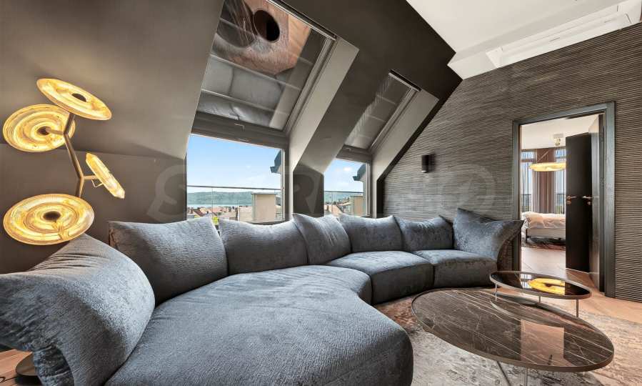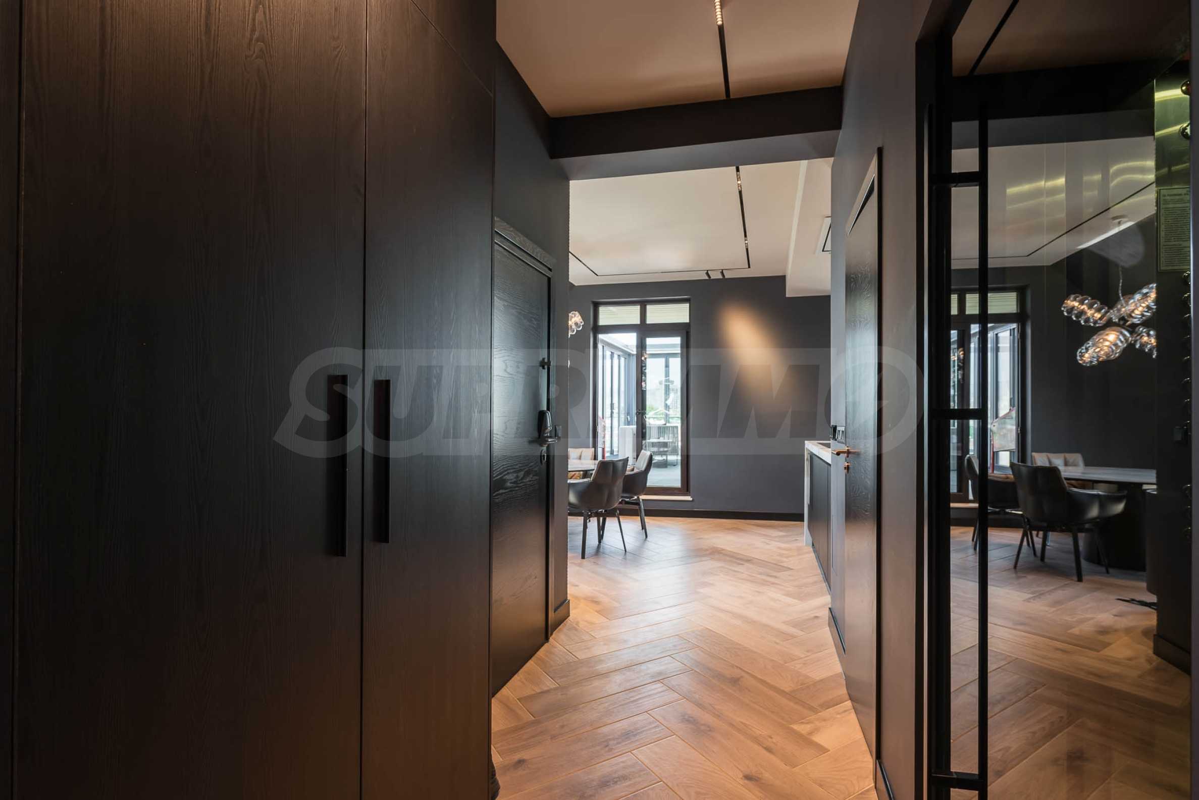 Всеки детайл е подбран с вкус, изработен от висок клас материали и изпипан с внимание към усещането за дом. Имотът впечатлява с изискана атмосфера, постигната чрез палитра от тъмни, дълбоки тонове, които създават усещане за лукс, интимност и съвършен баланс между комфорт и стил. Тук луксът не е показност, а внимателно подбрано усещане – висококачествени материали, дизайнерско обзавеждане и стилна тъмна визия, която носи уют и характер. Всяко пространство в пентхауса излъчва класа и индивидуалност – цветова концепция в тъмни тонове, съчетана с прецизно подбрани текстури и безкомпромисно качество на изпълнение.