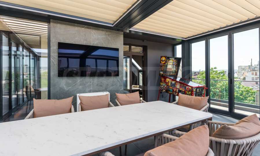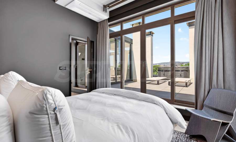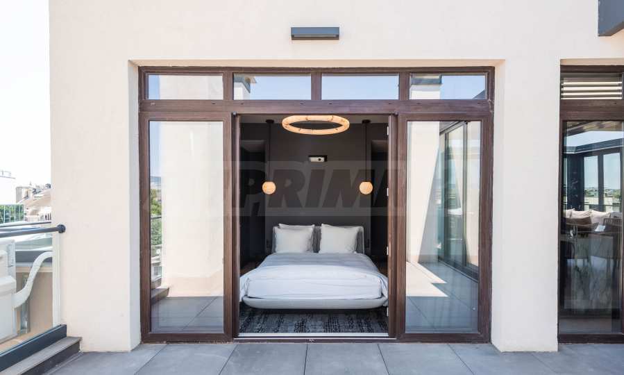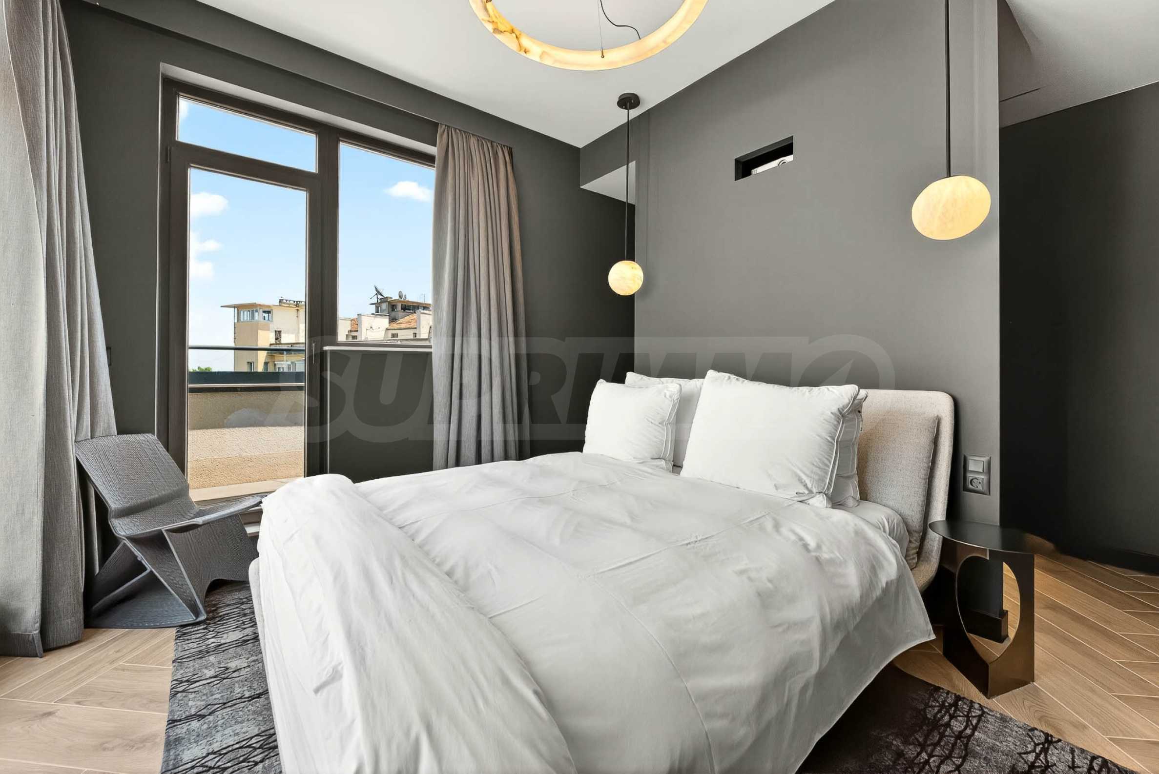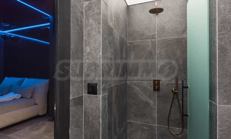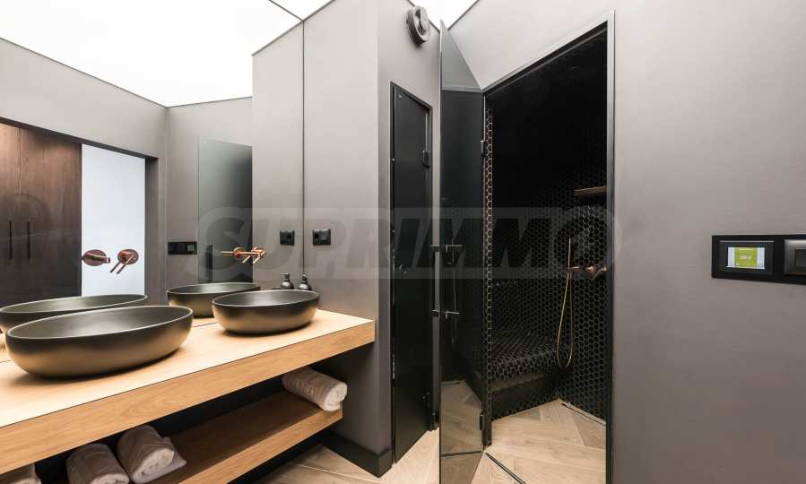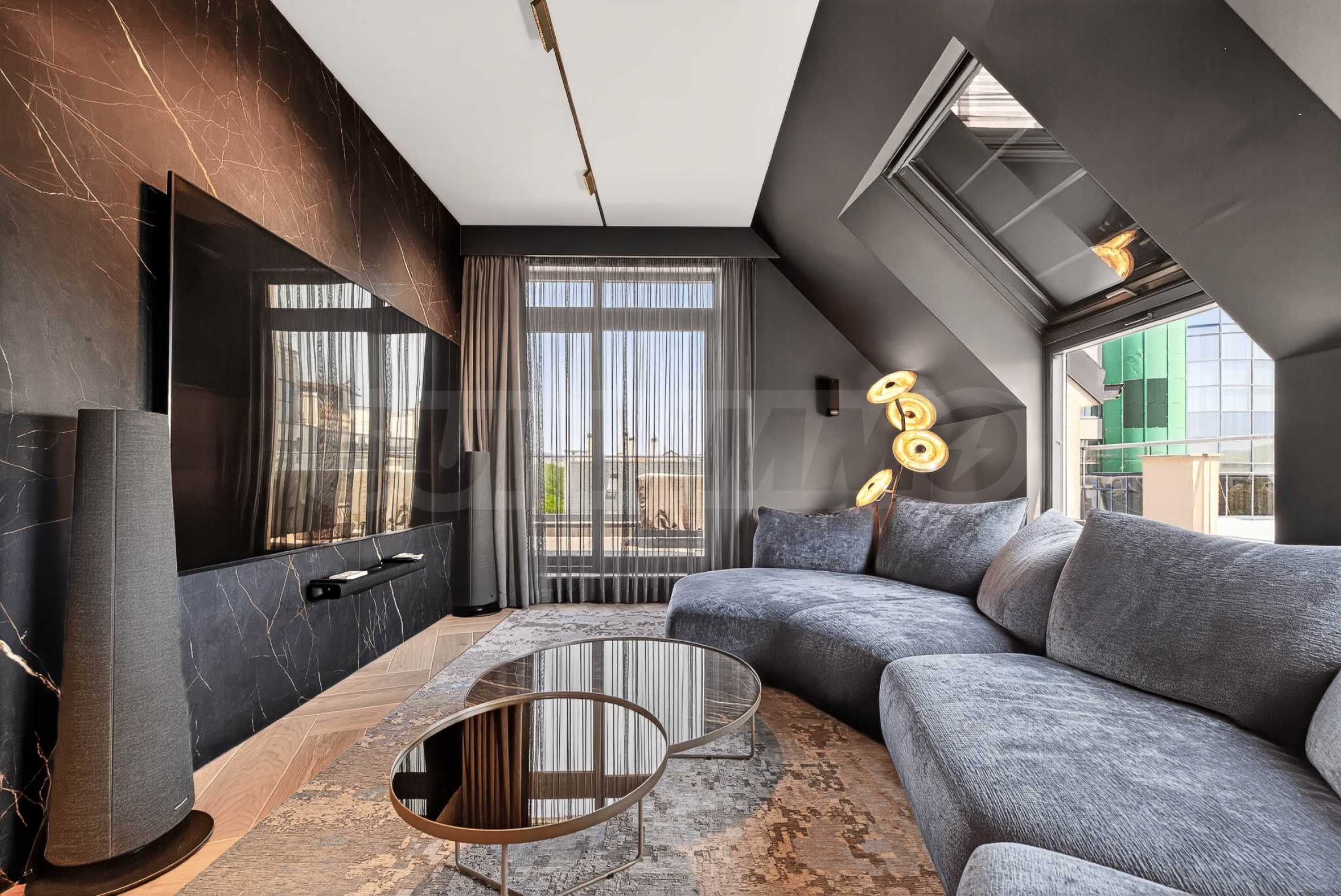 Всеки детайл е подбран с вкус, изработен от висок клас материали и изпипан с внимание към усещането за дом. Имотът впечатлява с изискана атмосфера, постигната чрез палитра от тъмни, дълбоки тонове, които създават усещане за лукс, интимност и съвършен баланс между комфорт и стил. Тук луксът не е показност, а внимателно подбрано усещане – висококачествени материали, дизайнерско обзавеждане и стилна тъмна визия, която носи уют и характер. Всяко пространство в пентхауса излъчва класа и индивидуалност – цветова концепция в тъмни тонове, съчетана с прецизно подбрани текстури и безкомпромисно качество на изпълнение.