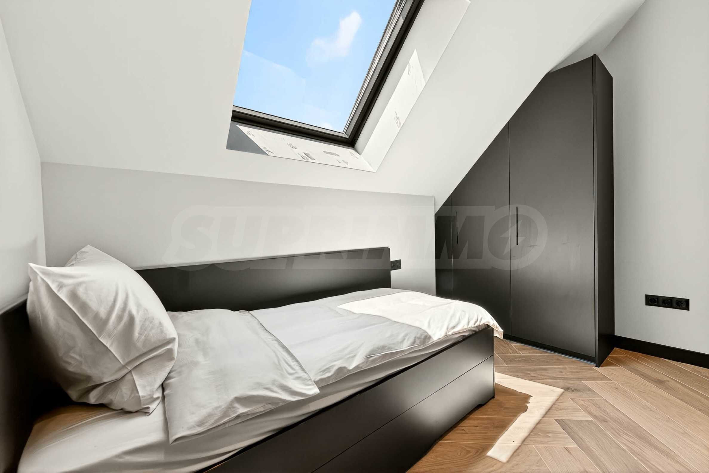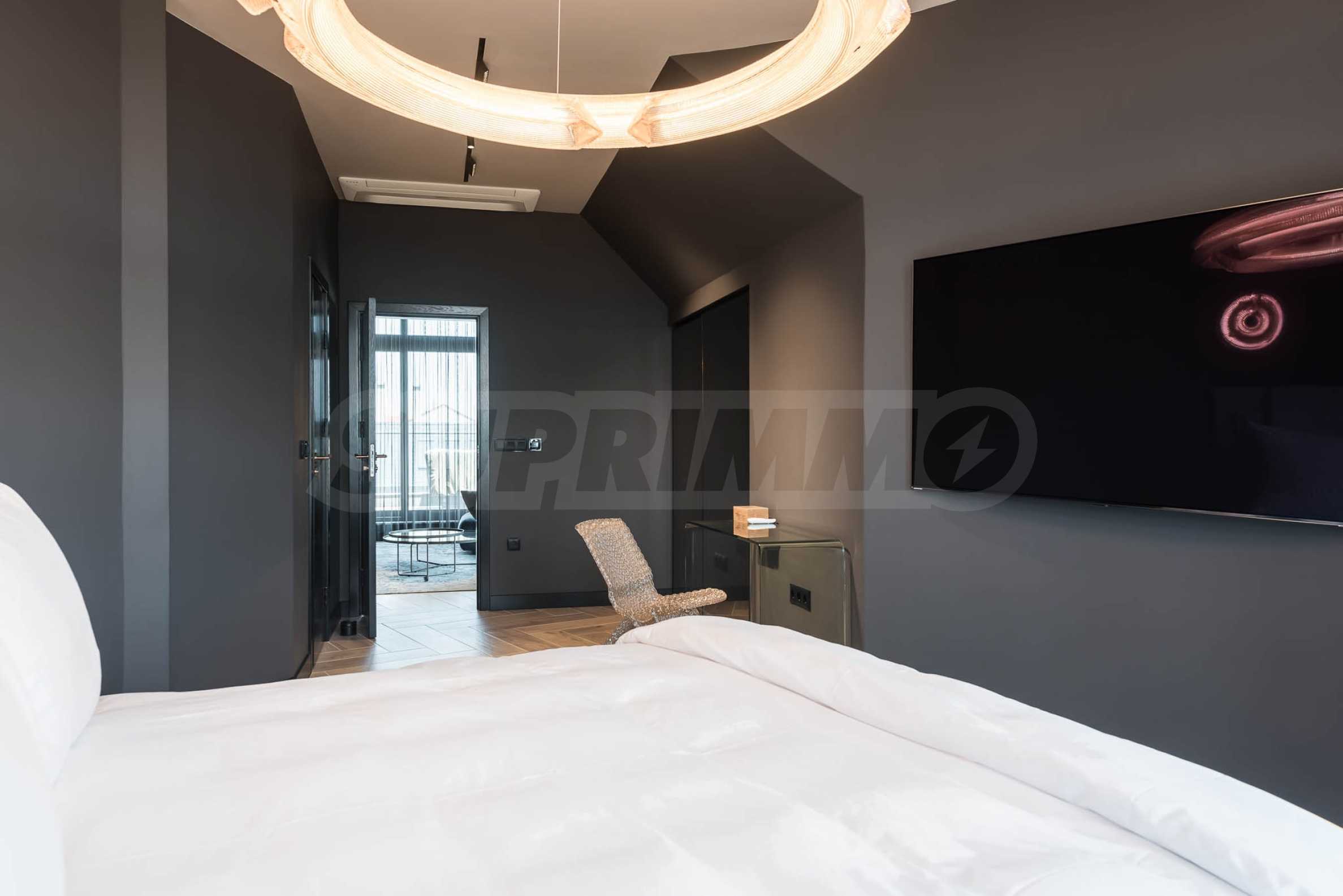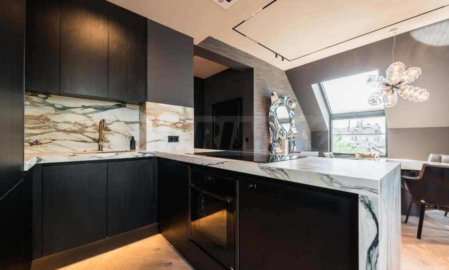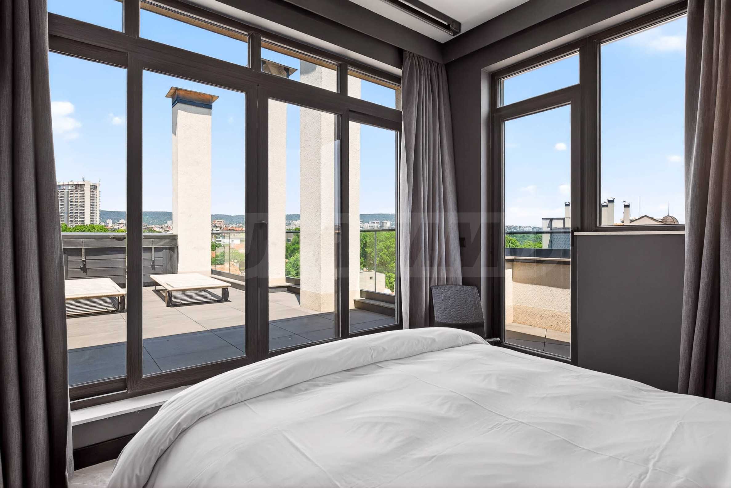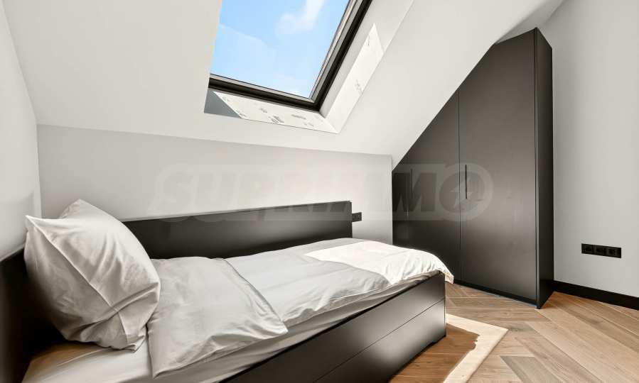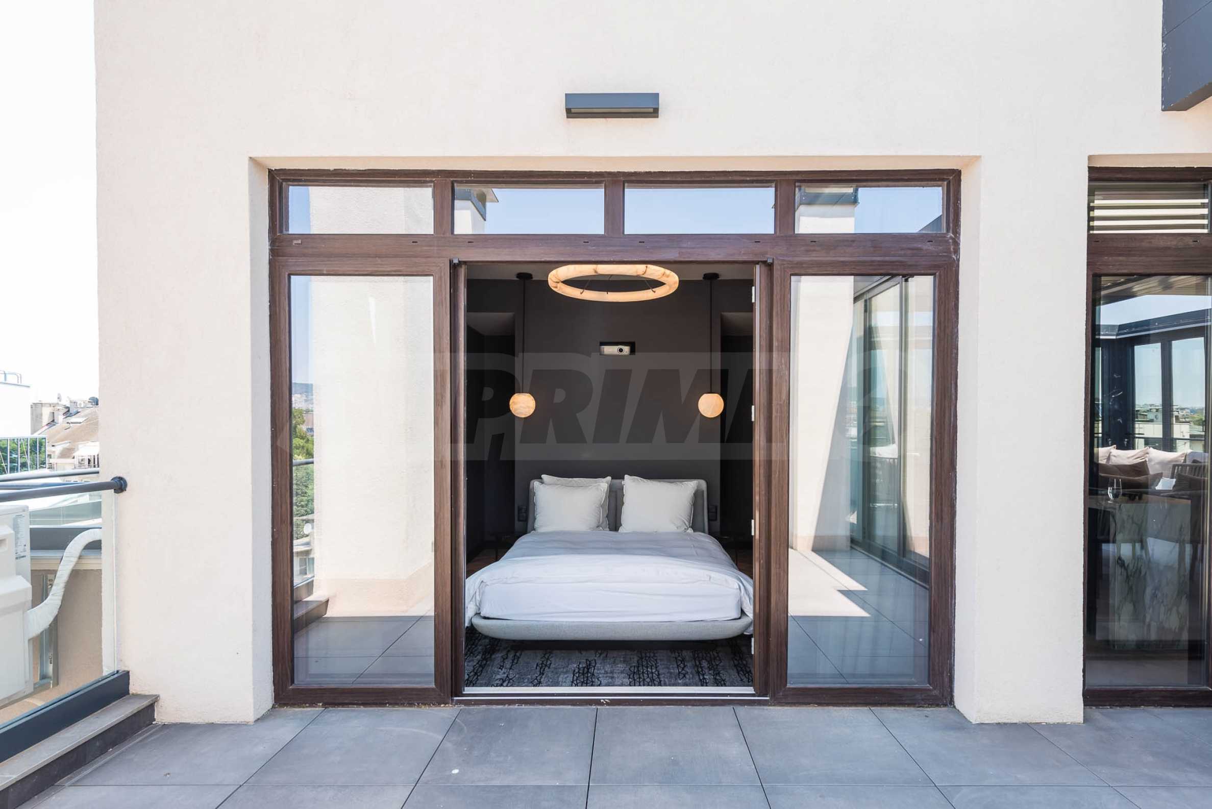 Всеки детайл е подбран с вкус, изработен от висок клас материали и изпипан с внимание към усещането за дом. Имотът впечатлява с изискана атмосфера, постигната чрез палитра от тъмни, дълбоки тонове, които създават усещане за лукс, интимност и съвършен баланс между комфорт и стил. Тук луксът не е показност, а внимателно подбрано усещане – висококачествени материали, дизайнерско обзавеждане и стилна тъмна визия, която носи уют и характер. Всяко пространство в пентхауса излъчва класа и индивидуалност – цветова концепция в тъмни тонове, съчетана с прецизно подбрани текстури и безкомпромисно качество на изпълнение.
