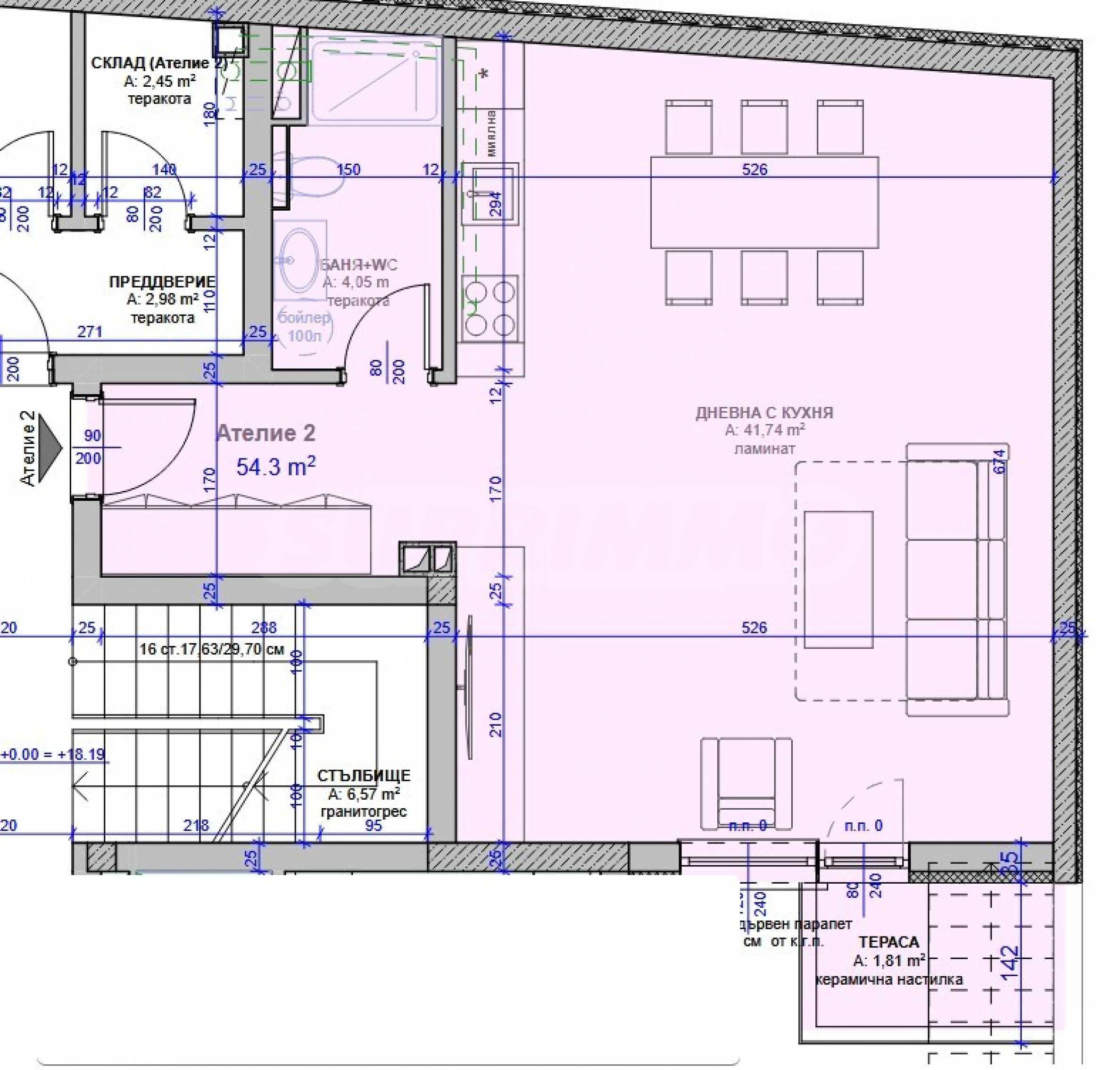 Имотът е с площ 54,30 кв.м, разположен на първи етаж с югоизточно изложение и френски прозорци за максимална естествена светлина.